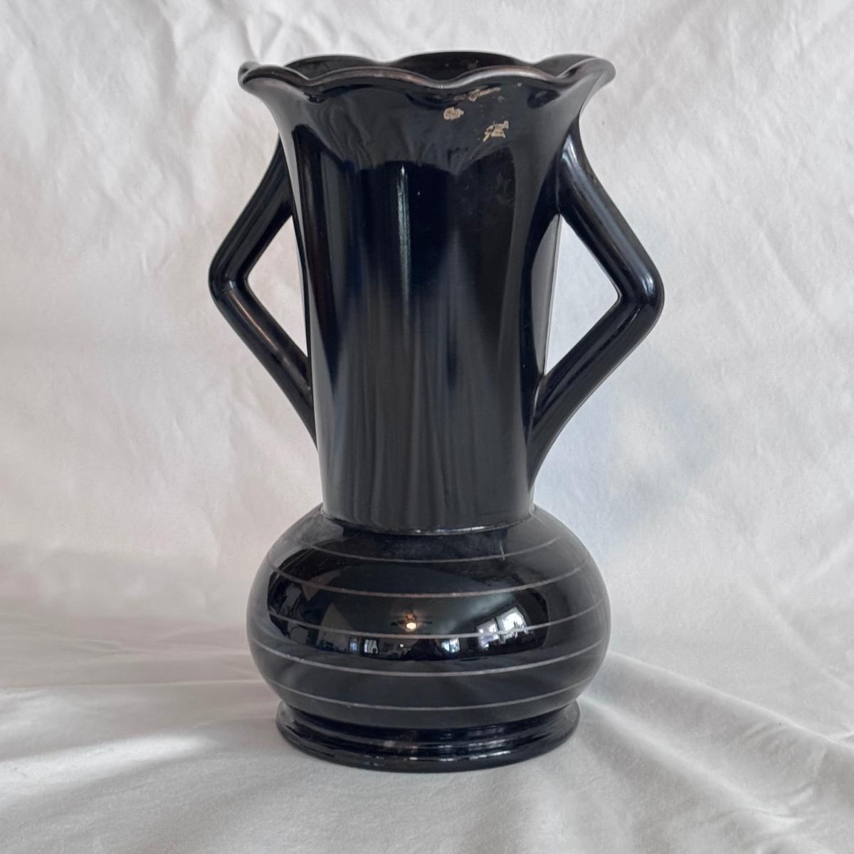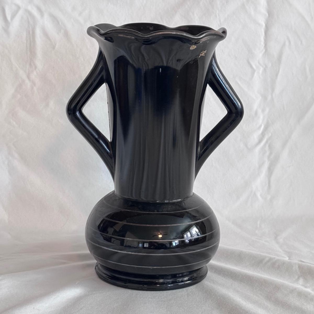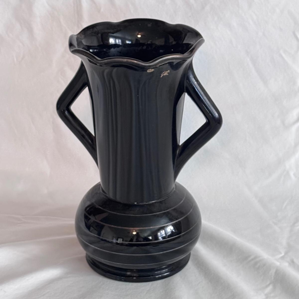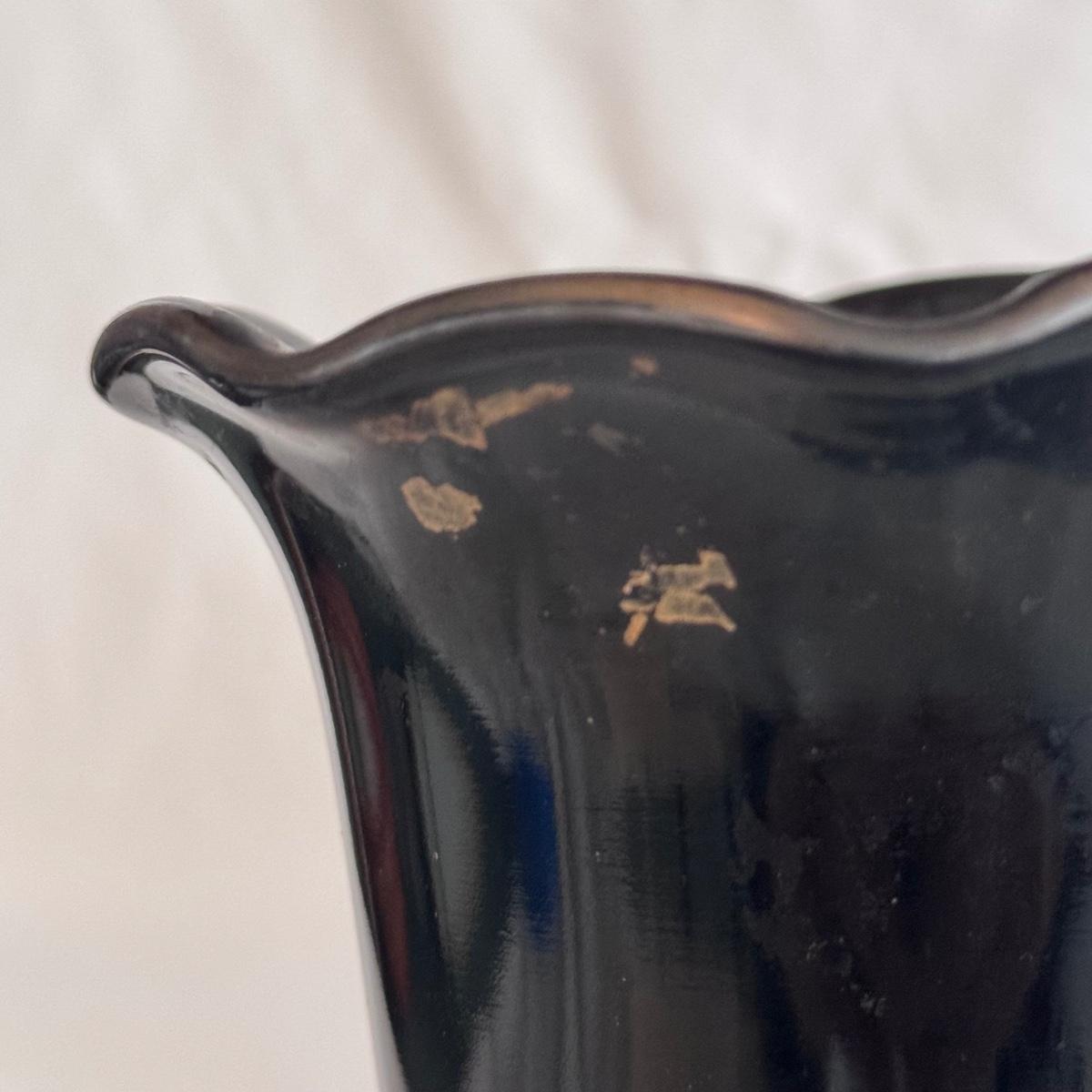 This lot includes one gorgeous Art Deco style trophy vase with a ruffled top. The vase is made of black glass and has a striped pattern on the bottom. The vase measures 7” x 5” x 9”H. There are two brown marks on the top of the vase that appear to be removable - see pictures. Shipping available.