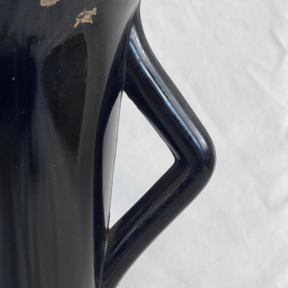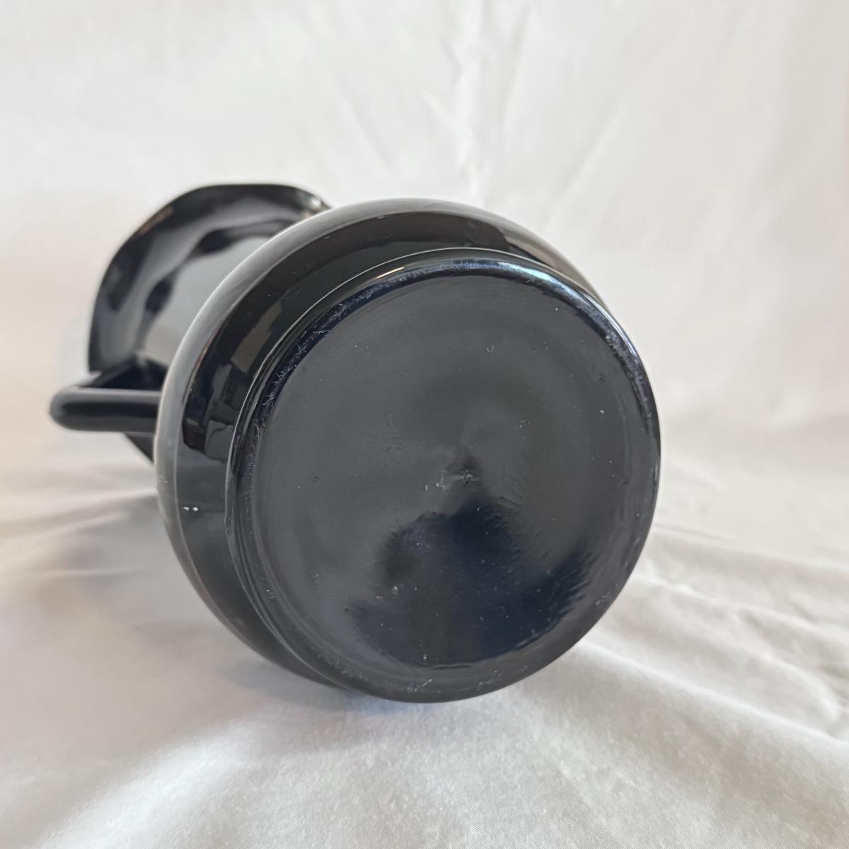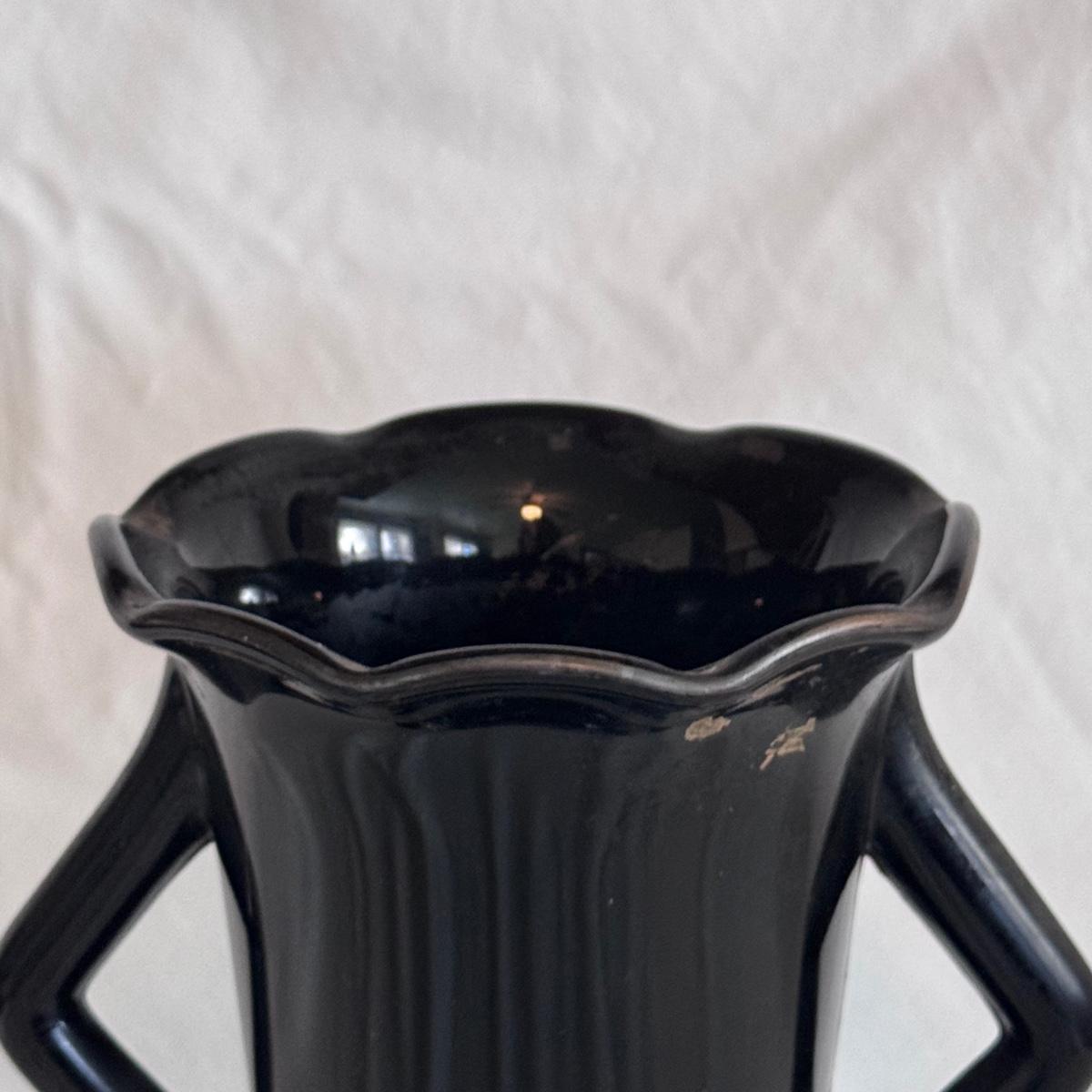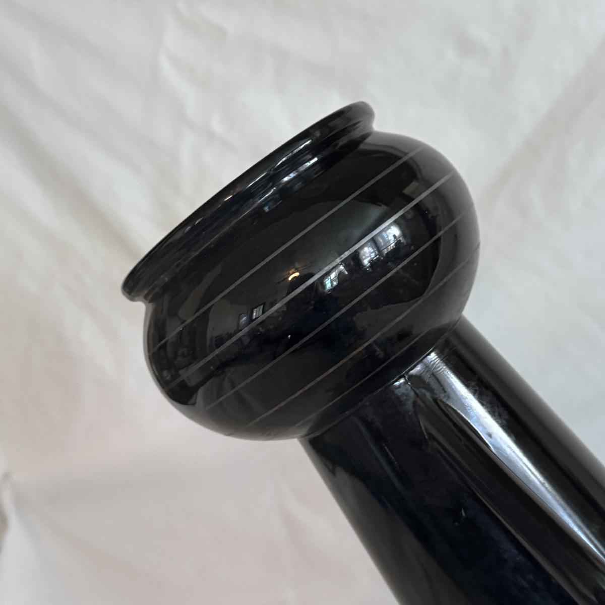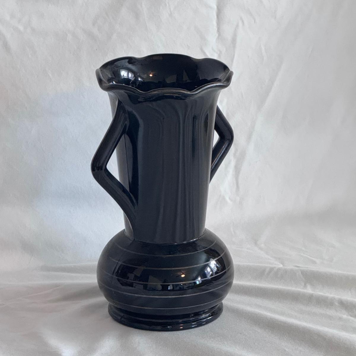 This lot includes one gorgeous Art Deco style trophy vase with a ruffled top. The vase is made of black glass and has a striped pattern on the bottom. The vase measures 7” x 5” x 9”H. There are two brown marks on the top of the vase that appear to be removable - see pictures. Shipping available.