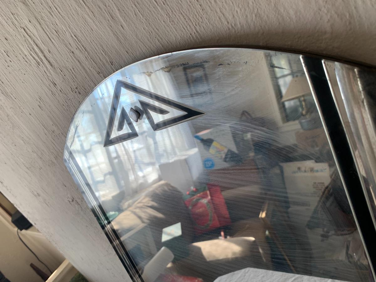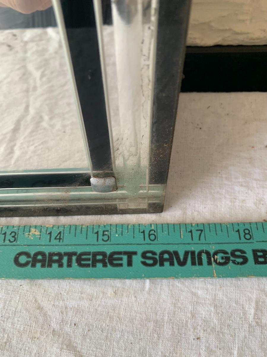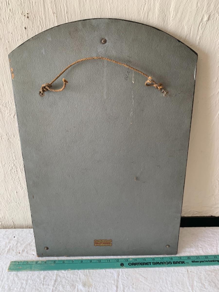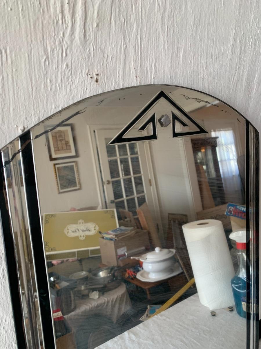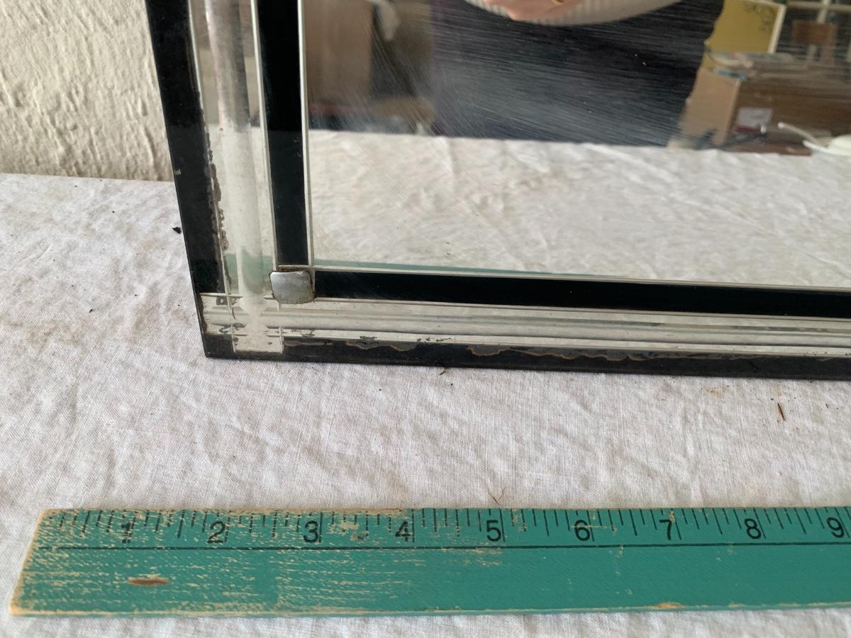 Vintage wall mirror with black etched design. No cracks but some wear on finish as shown in photos.