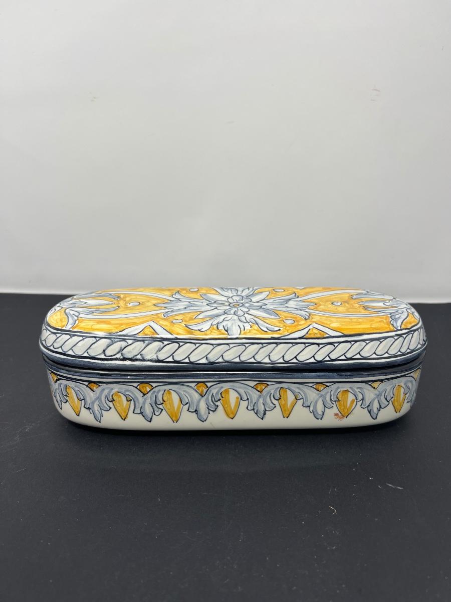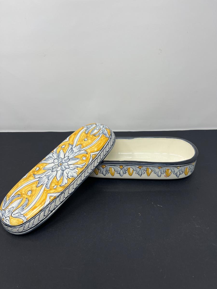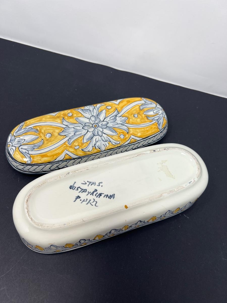 Blue & Yellow lidded pottery trinket/glasses container signed "STAS. Justay Rufina P.ari" measures 9” long x 3” wide x 2.75” tall.