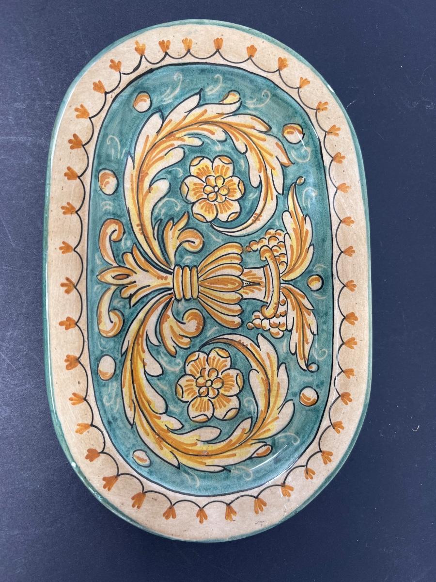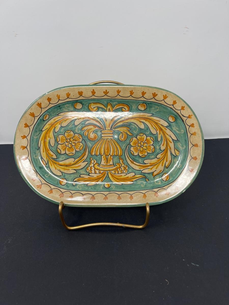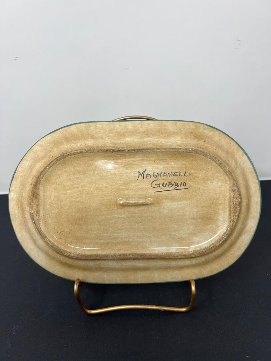 Green & beige glazed small pottery tray. Hand signed Magnanelli Gubbio. 8.75” long x 5.5” wide. Hand-painted by the premiere Gubbio faenza family, Magnanelli. Beautiful floral tray with acanthus leaf flourishes and a pretty geometrical base design. Classic Gubbio green and ochre and tan glazes.