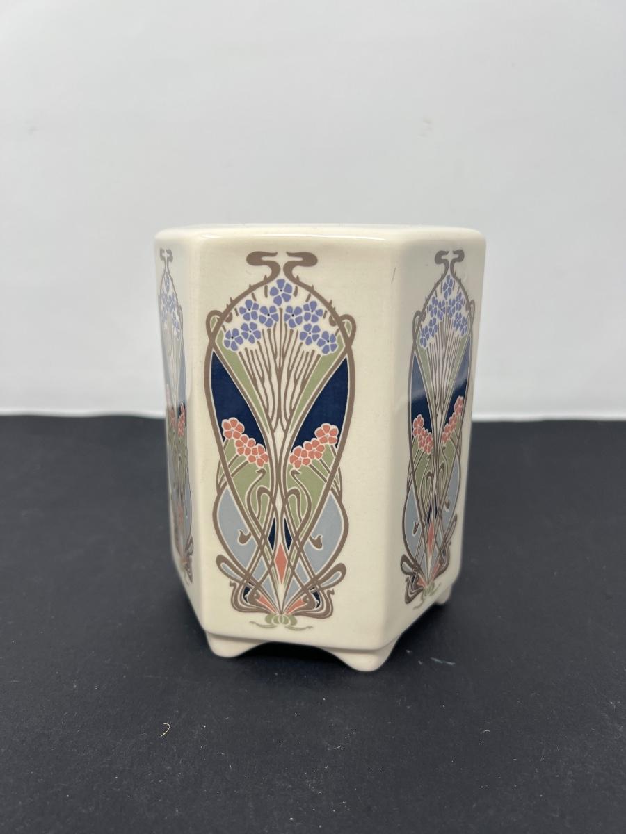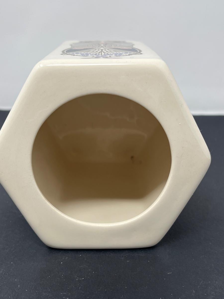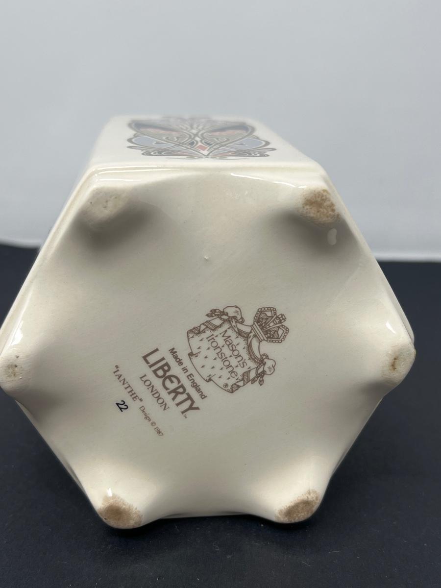 1987 Liberty London Mason’s Ironstone vase “Lathe” design measures 5.25” tall x 3.75” side to side (6 sides).
