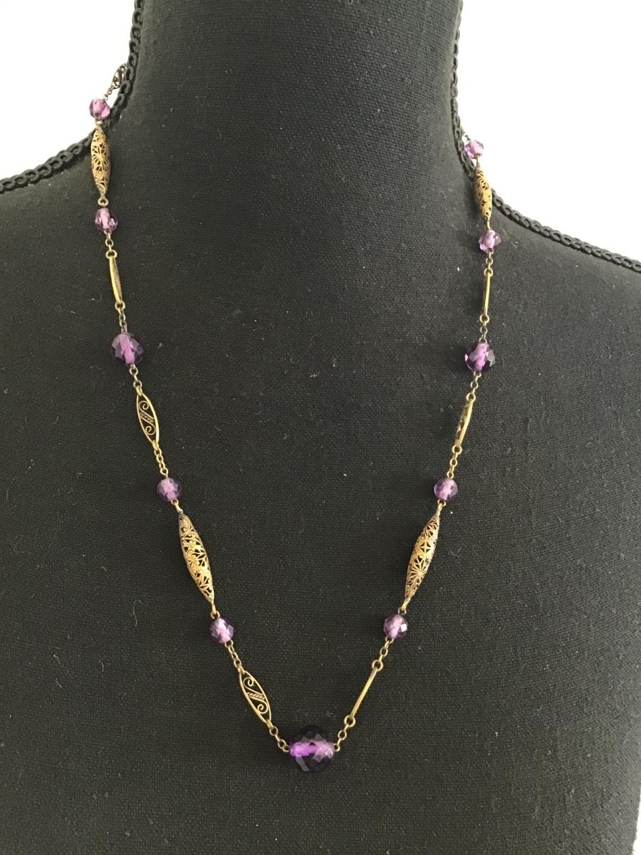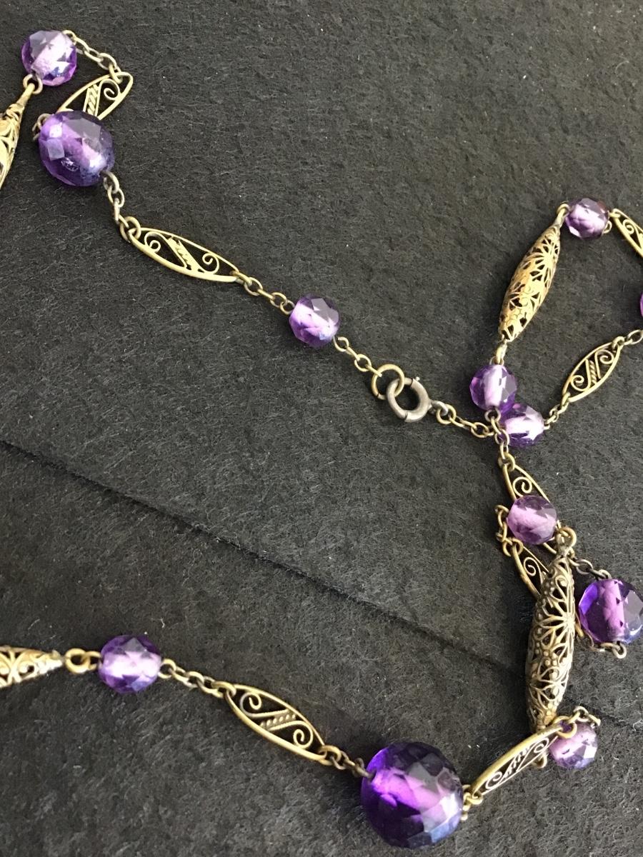 Art Deco Vintage Necklace Purple Glass Gold Filagree