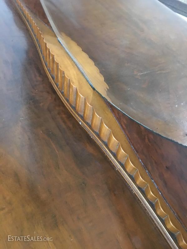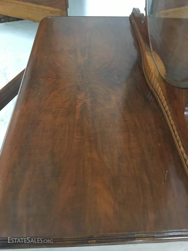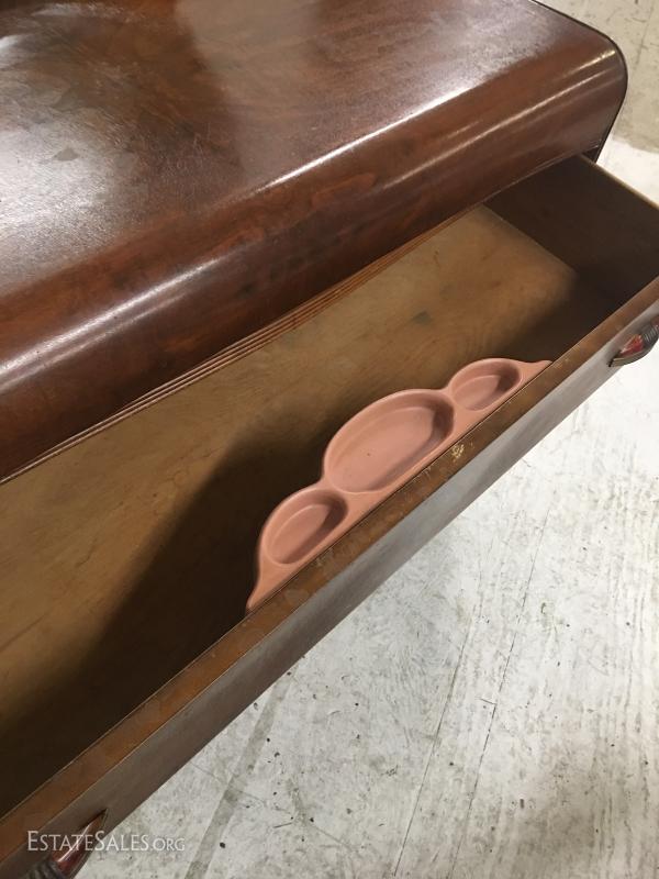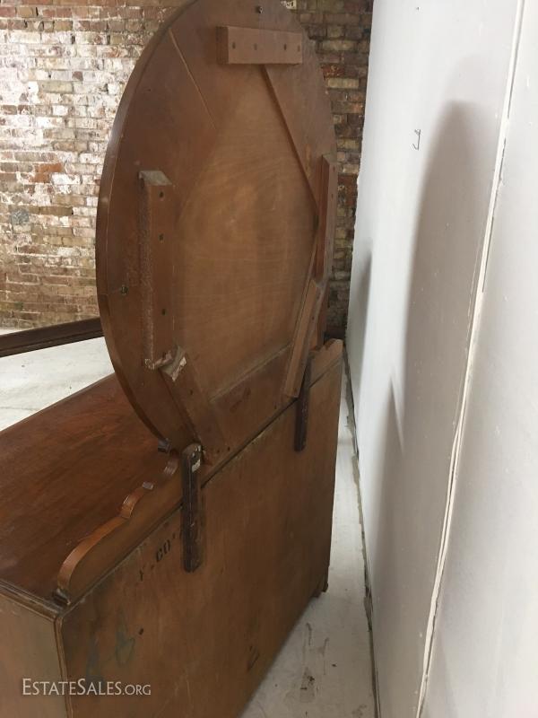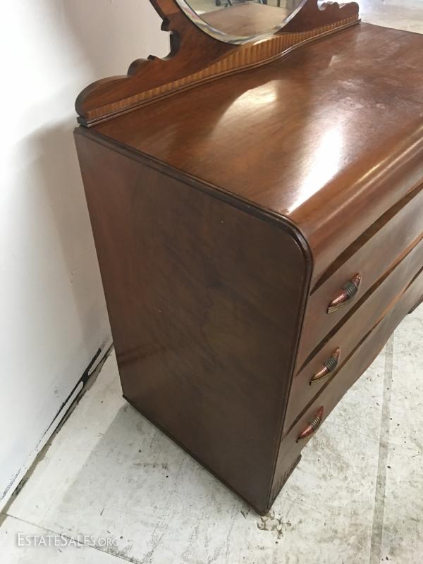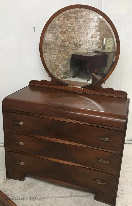 Dresser is in good working condition. Finish shows some age, all the drawers work well. Measures 44" by 22" deep, 35" tall, mirror is 30" in diameter. 2 of 3 matching pieces in the auction.