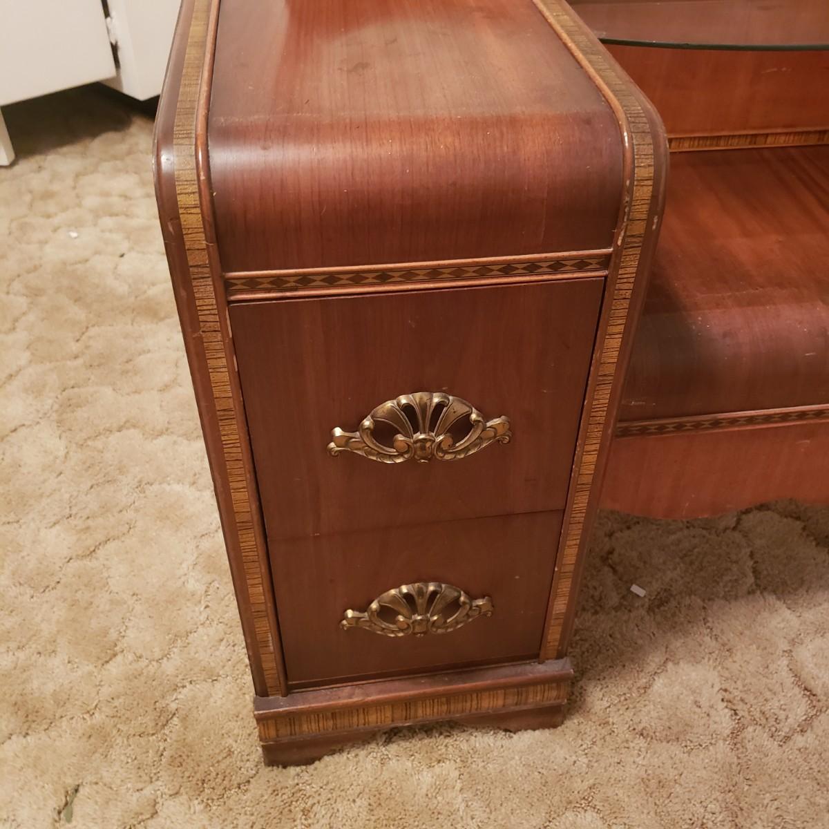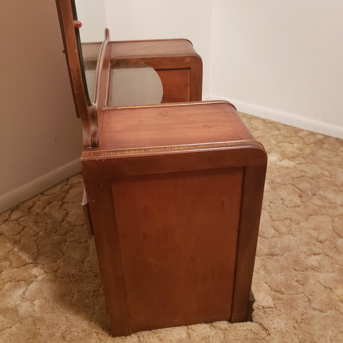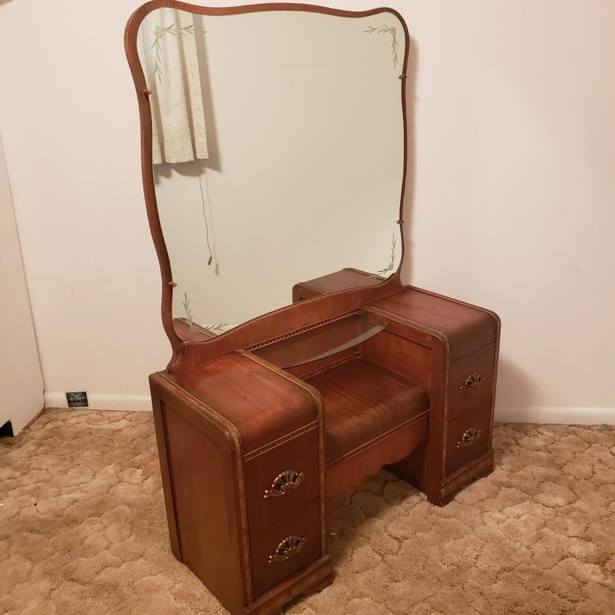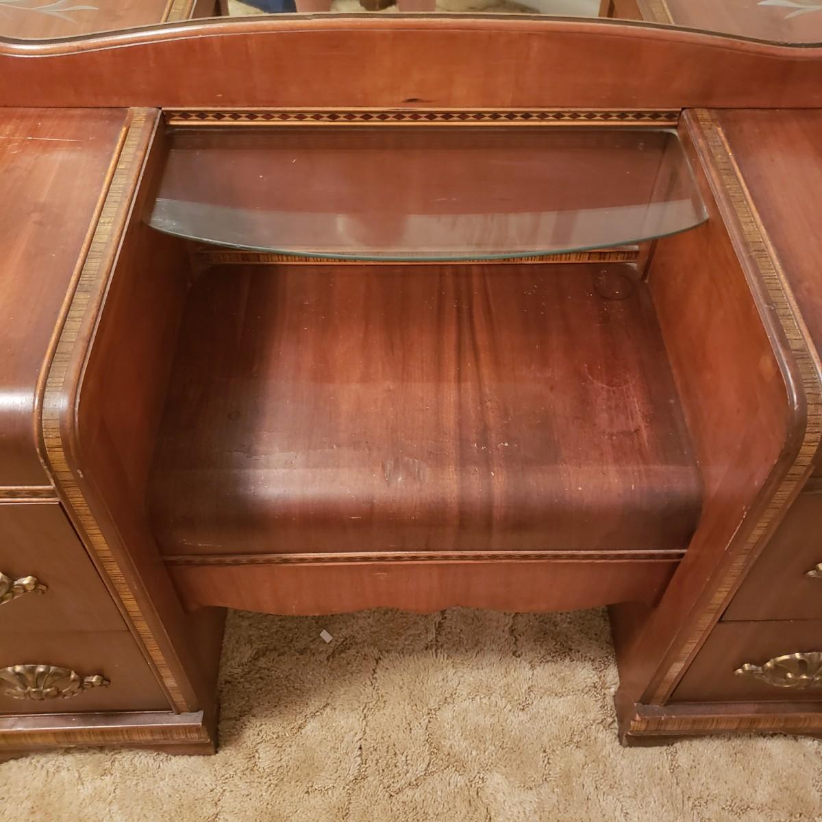 This beautiful piece is a waterfall vanity with four drawers, a glass shelf and mirror. This vanity matches a bed frame and dresser in another lot in this auction. The vanity measures 44" x 17" x 64"H. There are some blemishes on the tops, see pictures, but otherwise for it's age the veneer appears to be intact. The drawers are dovetailed and slide out easily.
