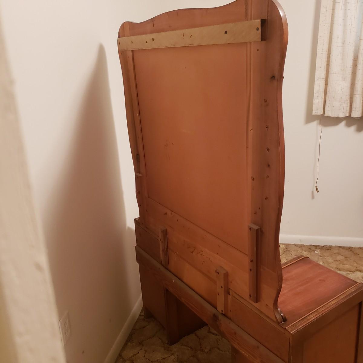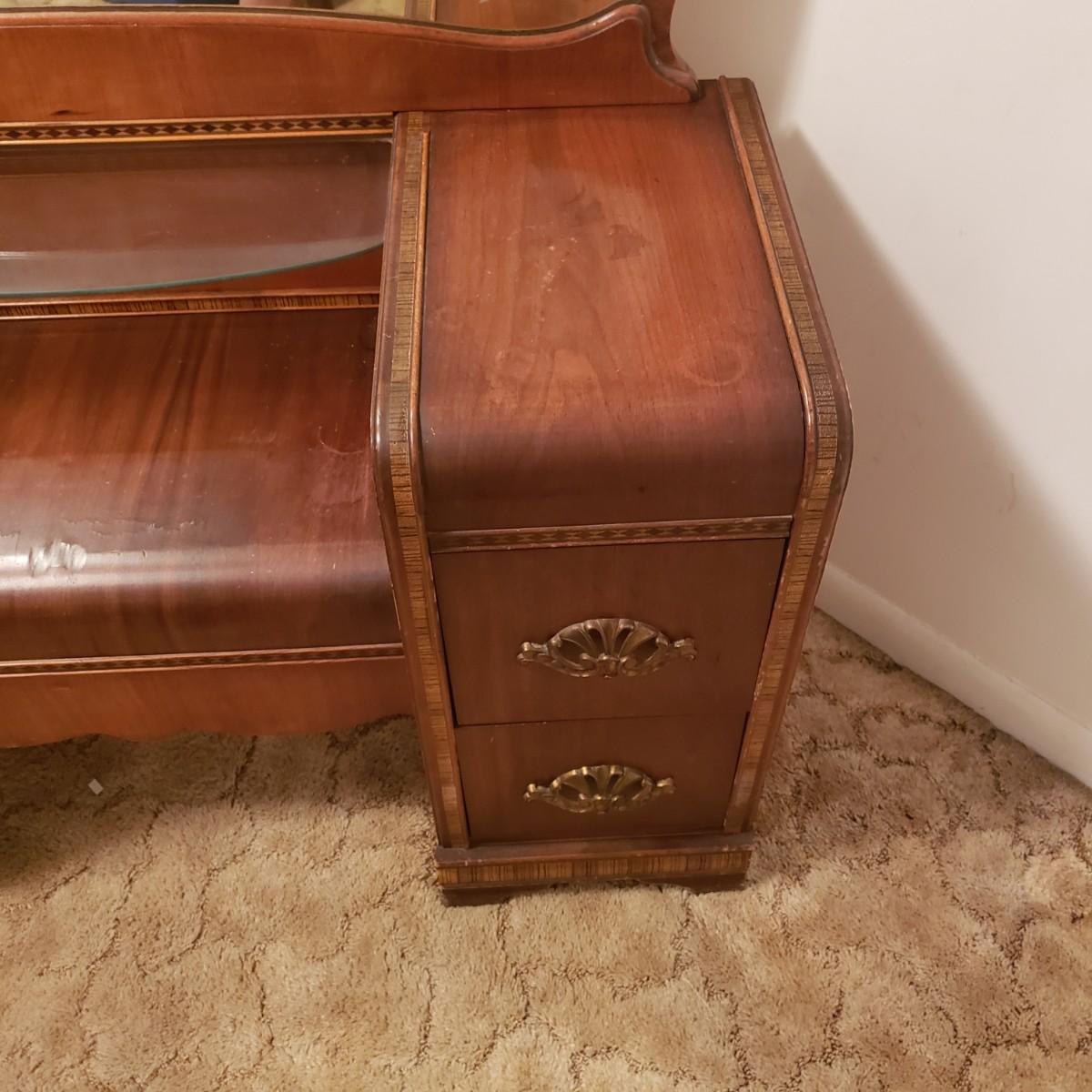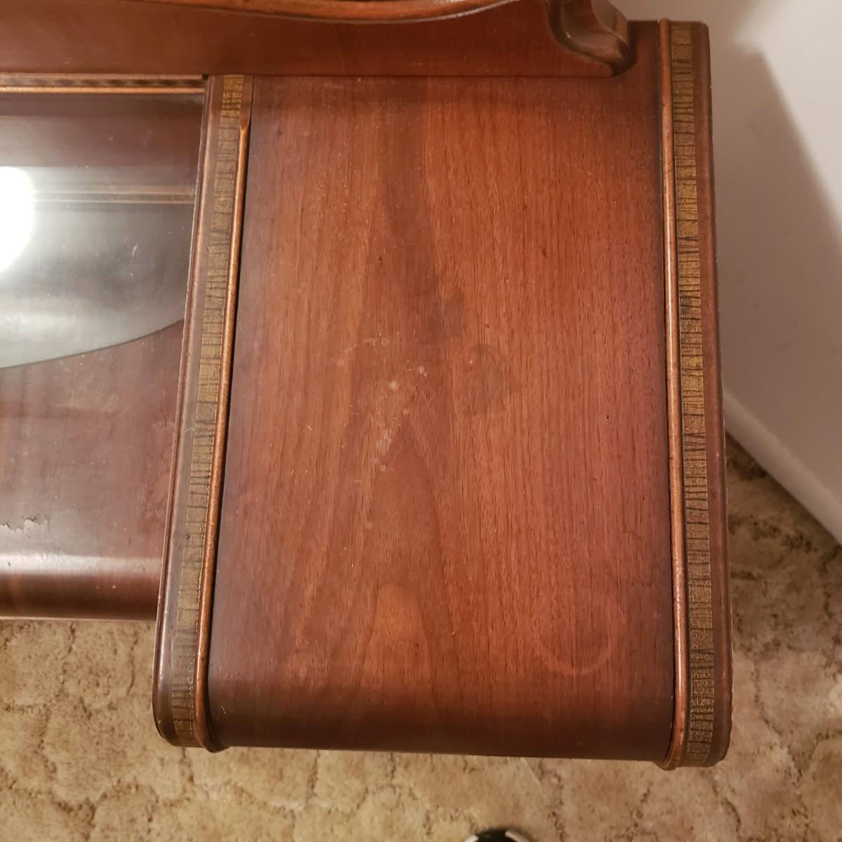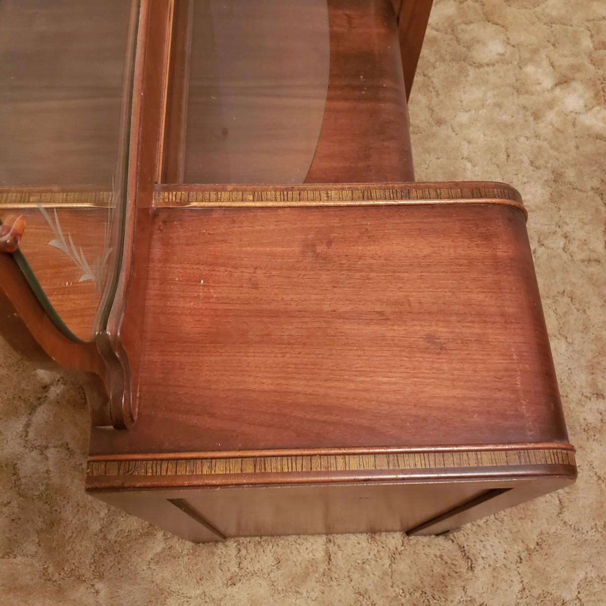 This beautiful piece is a waterfall vanity with four drawers, a glass shelf and mirror. This vanity matches a bed frame and dresser in another lot in this auction. The vanity measures 44" x 17" x 64"H. There are some blemishes on the tops, see pictures, but otherwise for it's age the veneer appears to be intact. The drawers are dovetailed and slide out easily.