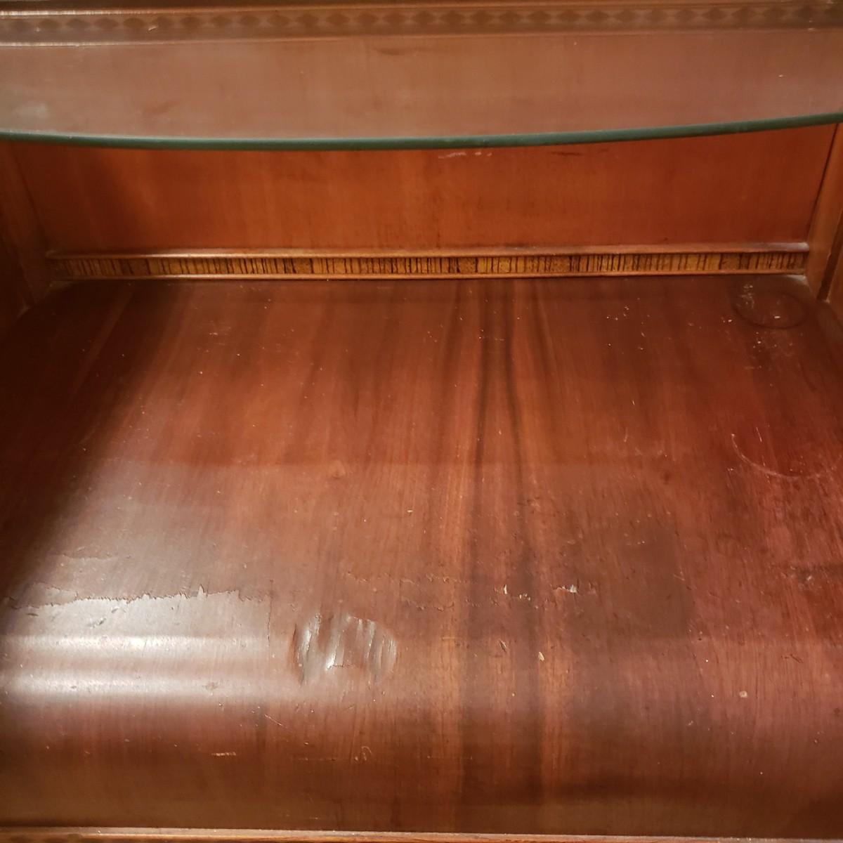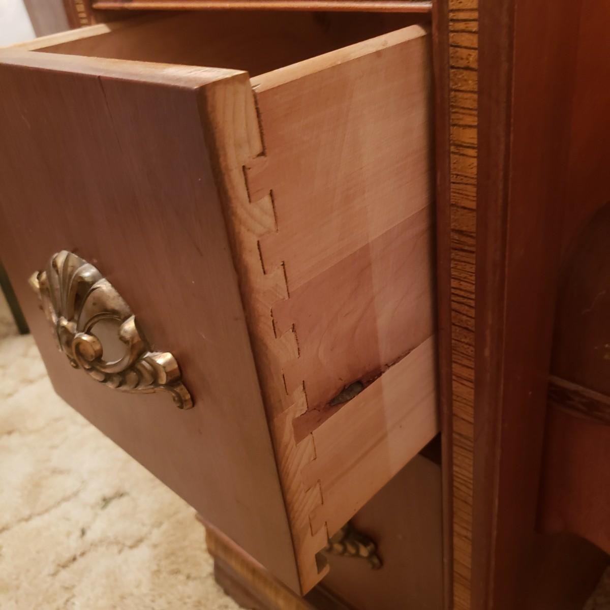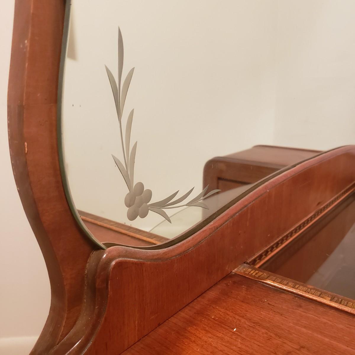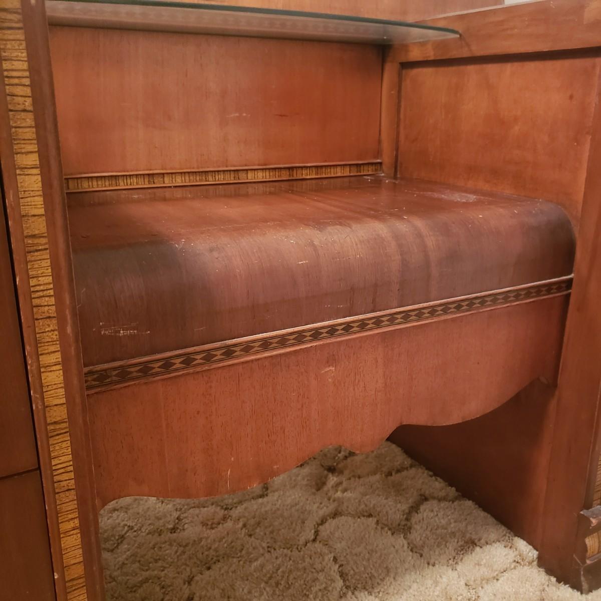 This beautiful piece is a waterfall vanity with four drawers, a glass shelf and mirror. This vanity matches a bed frame and dresser in another lot in this auction. The vanity measures 44" x 17" x 64"H. There are some blemishes on the tops, see pictures, but otherwise for it's age the veneer appears to be intact. The drawers are dovetailed and slide out easily.