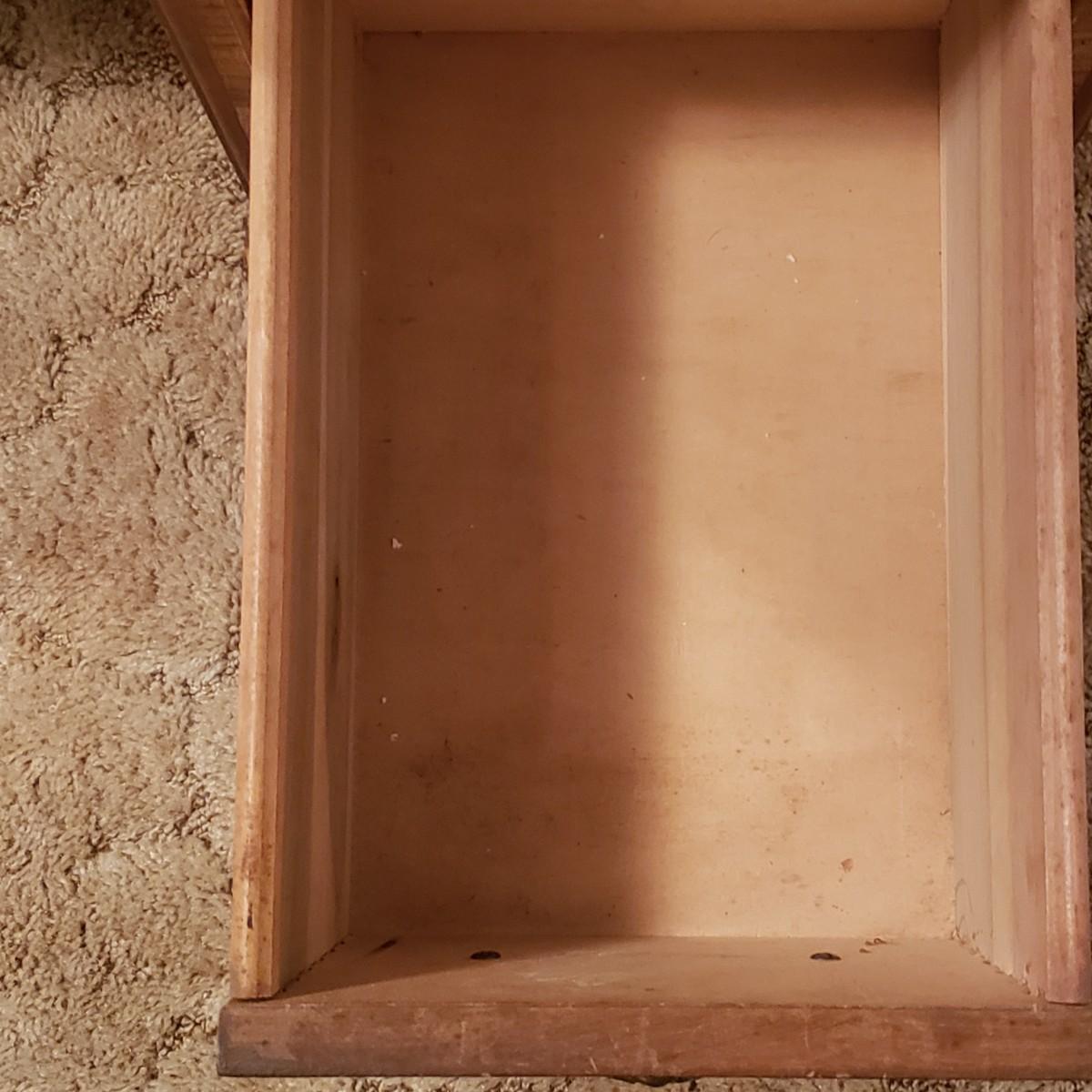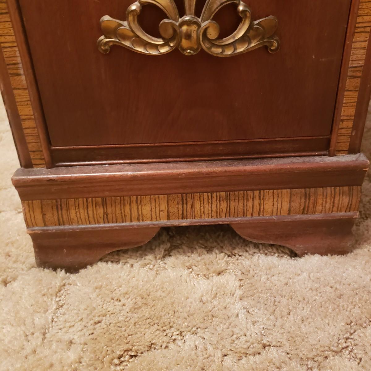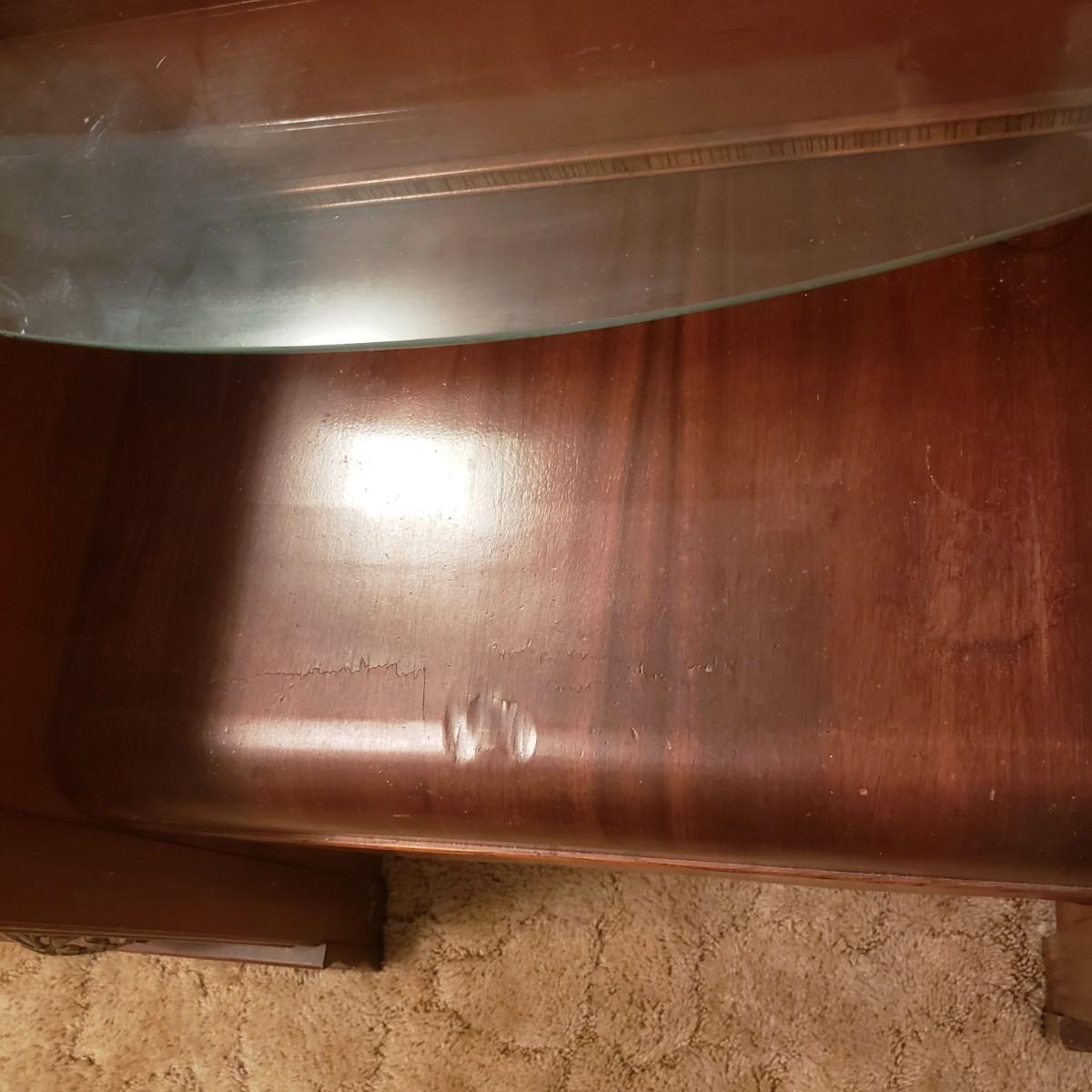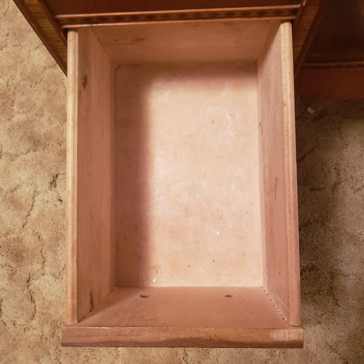 This beautiful piece is a waterfall vanity with four drawers, a glass shelf and mirror. This vanity matches a bed frame and dresser in another lot in this auction. The vanity measures 44" x 17" x 64"H. There are some blemishes on the tops, see pictures, but otherwise for it's age the veneer appears to be intact. The drawers are dovetailed and slide out easily.