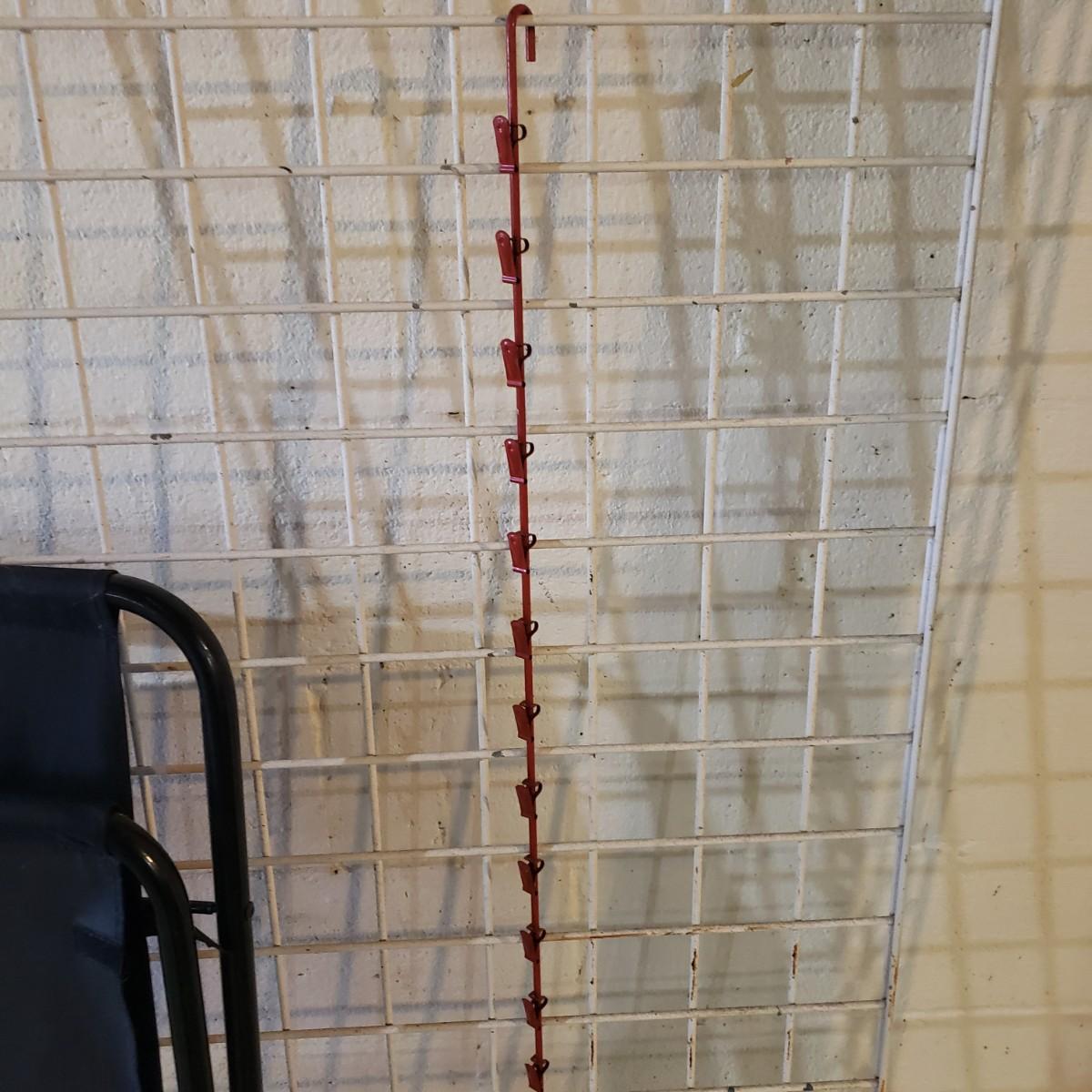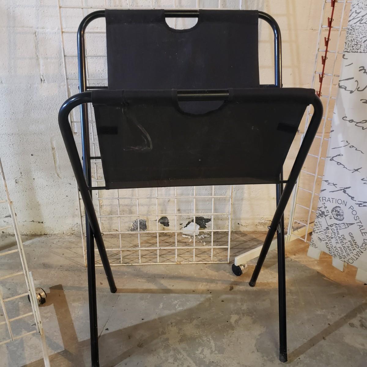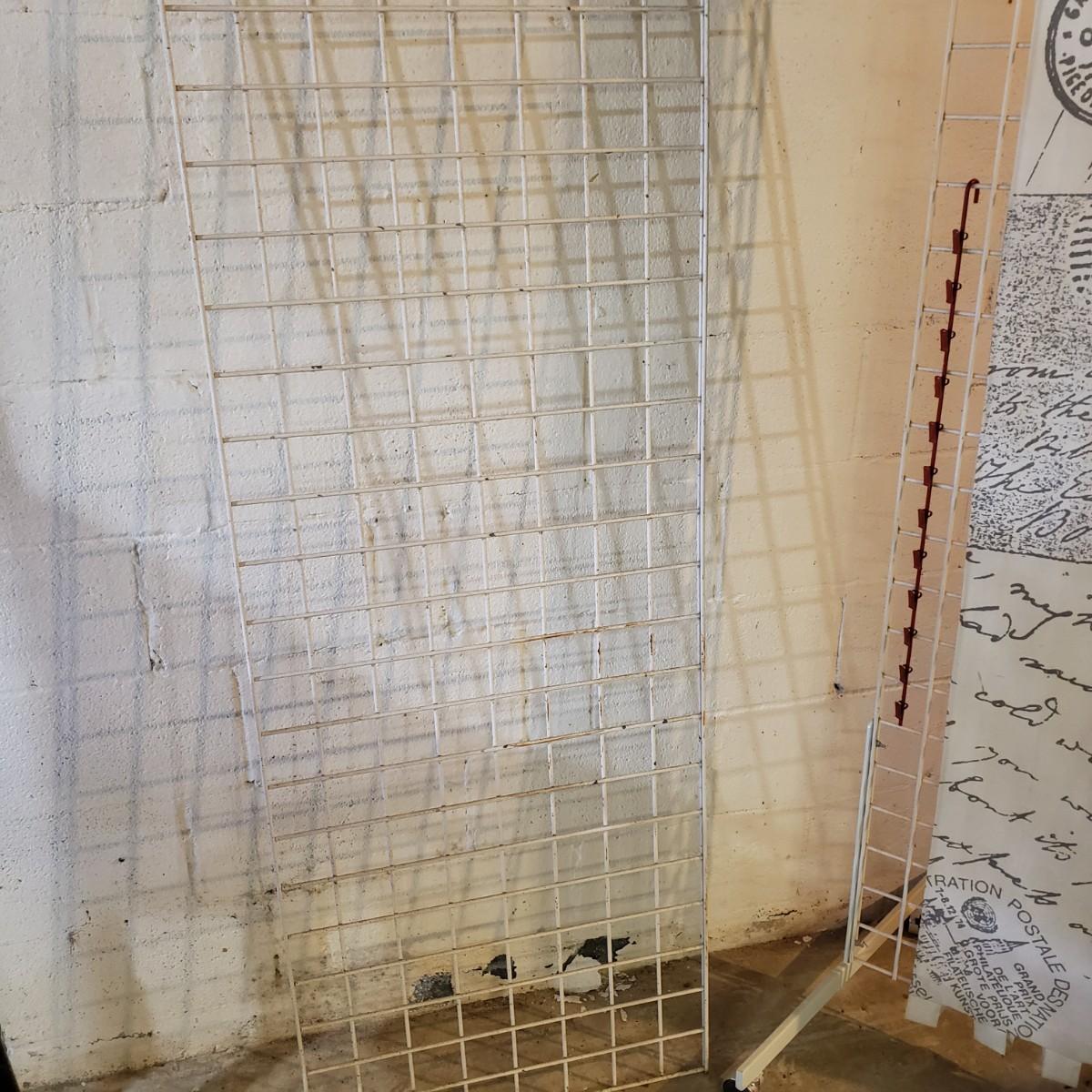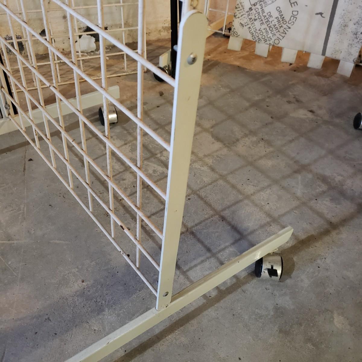 This lot has four, heavy gage wire racks, three with rollers. Our client used them to display her artwork. The rollers have two free rolling and two with locks wheels. The fourth panel is free standing without rollers. There is a bag of metal hooks for hanging your treasures. Each panel with wheels measures 24" x 24" x 76"H. One panel is covered with a cotton curtain that can be removed. The black metal with canvas stand measures 24" x 21" x 49"H. There are two velcro pieces to hold the stand closed. The red metal hook with 12 clamps on it is also great for displaying work.