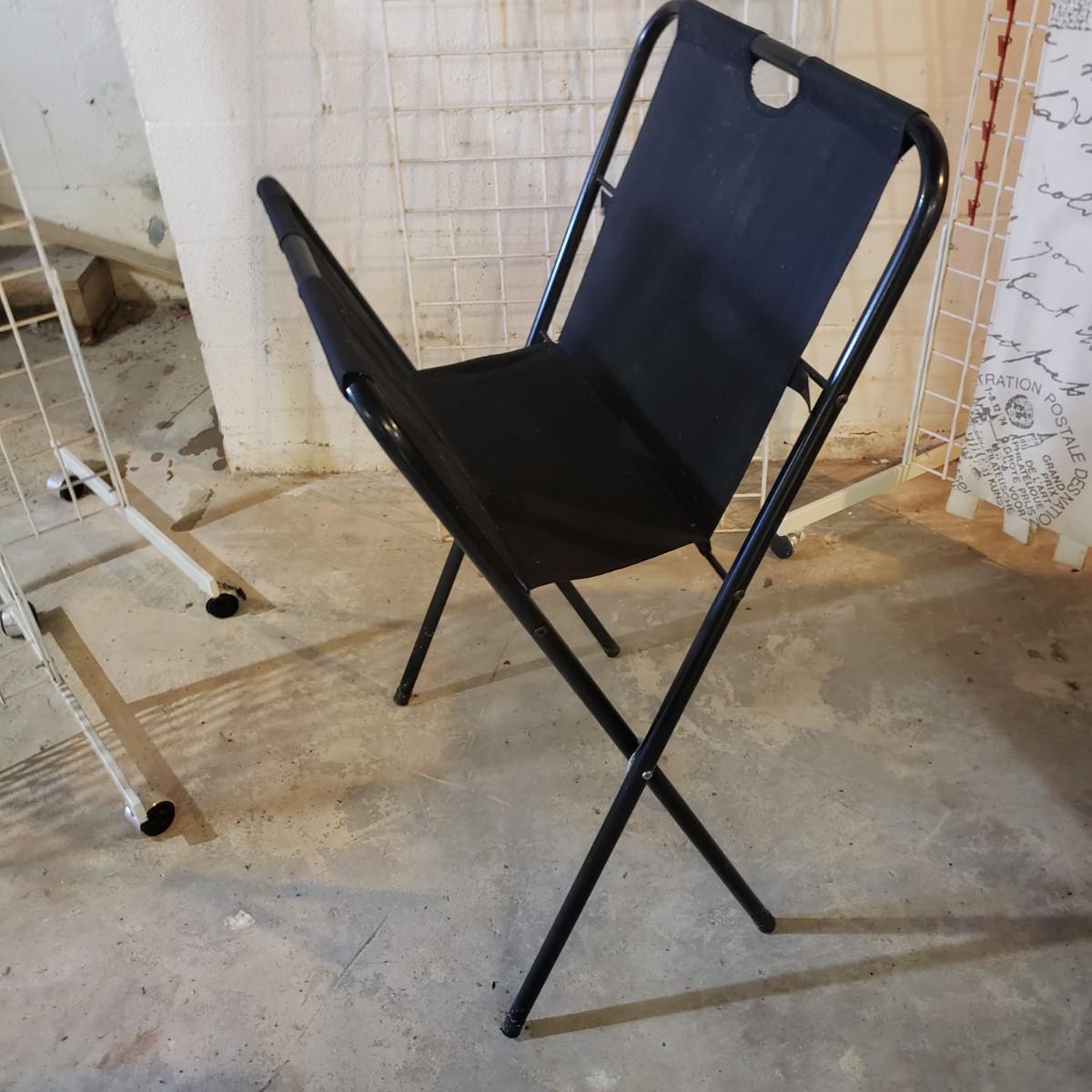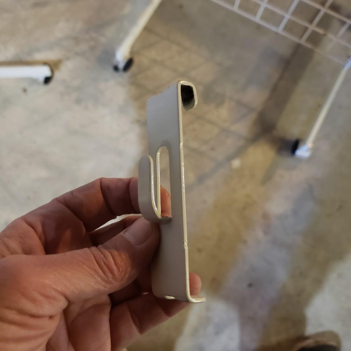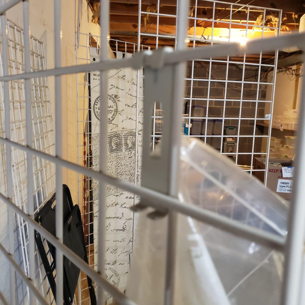 This lot has four, heavy gage wire racks, three with rollers. Our client used them to display her artwork. The rollers have two free rolling and two with locks wheels. The fourth panel is free standing without rollers. There is a bag of metal hooks for hanging your treasures. Each panel with wheels measures 24" x 24" x 76"H. One panel is covered with a cotton curtain that can be removed. The black metal with canvas stand measures 24" x 21" x 49"H. There are two velcro pieces to hold the stand closed. The red metal hook with 12 clamps on it is also great for displaying work.