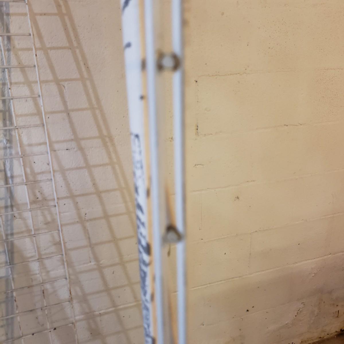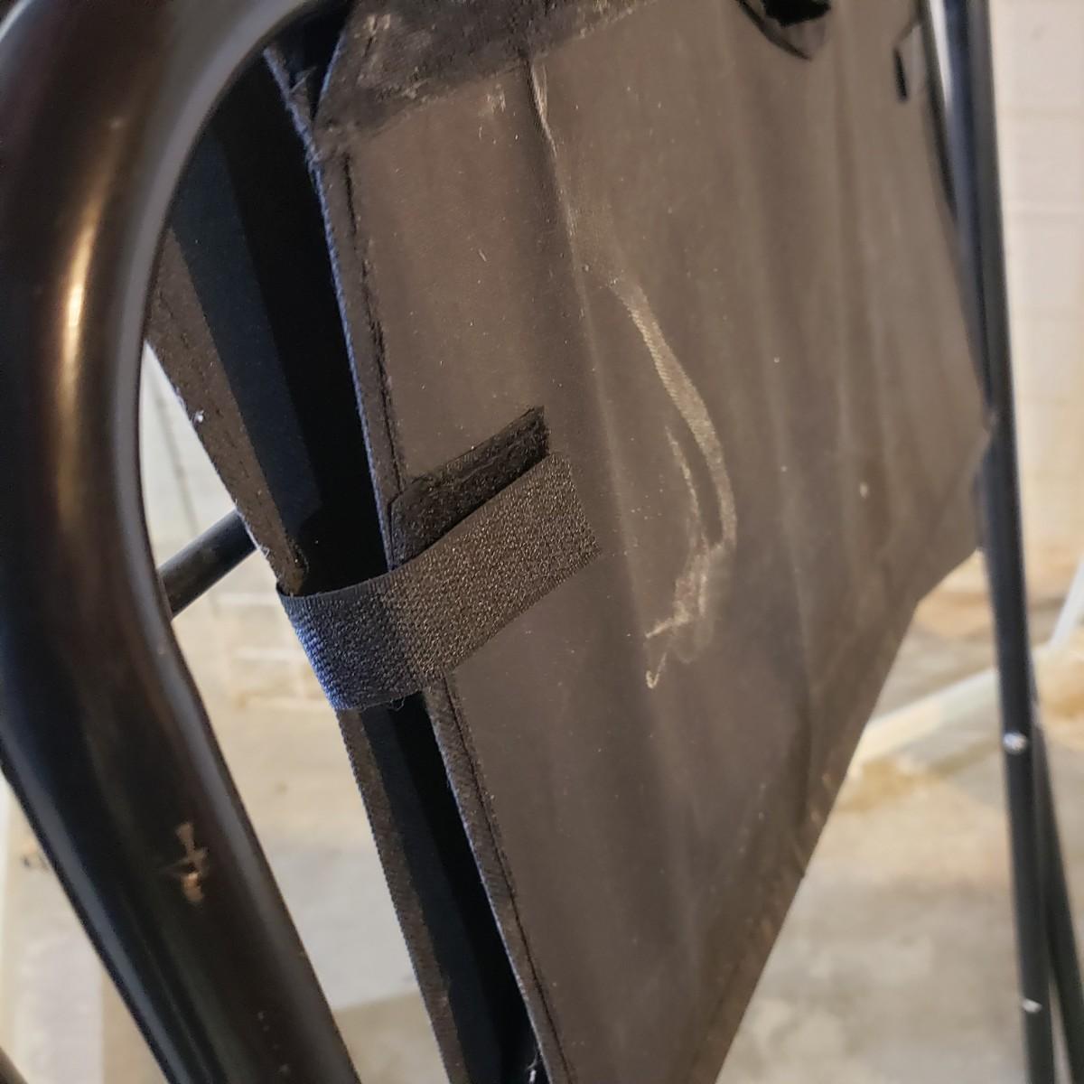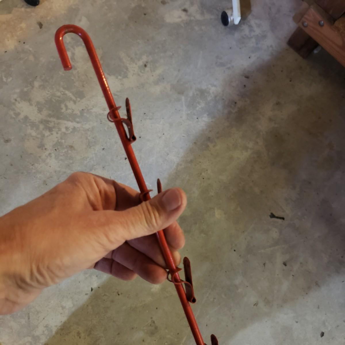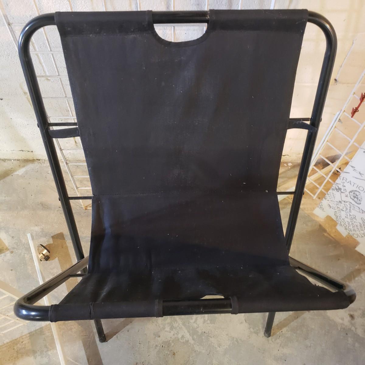 This lot has four, heavy gage wire racks, three with rollers. Our client used them to display her artwork. The rollers have two free rolling and two with locks wheels. The fourth panel is free standing without rollers. There is a bag of metal hooks for hanging your treasures. Each panel with wheels measures 24" x 24" x 76"H. One panel is covered with a cotton curtain that can be removed. The black metal with canvas stand measures 24" x 21" x 49"H. There are two velcro pieces to hold the stand closed. The red metal hook with 12 clamps on it is also great for displaying work.