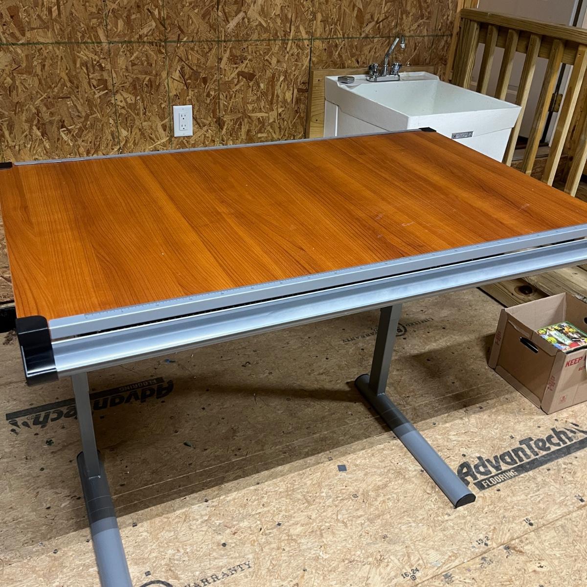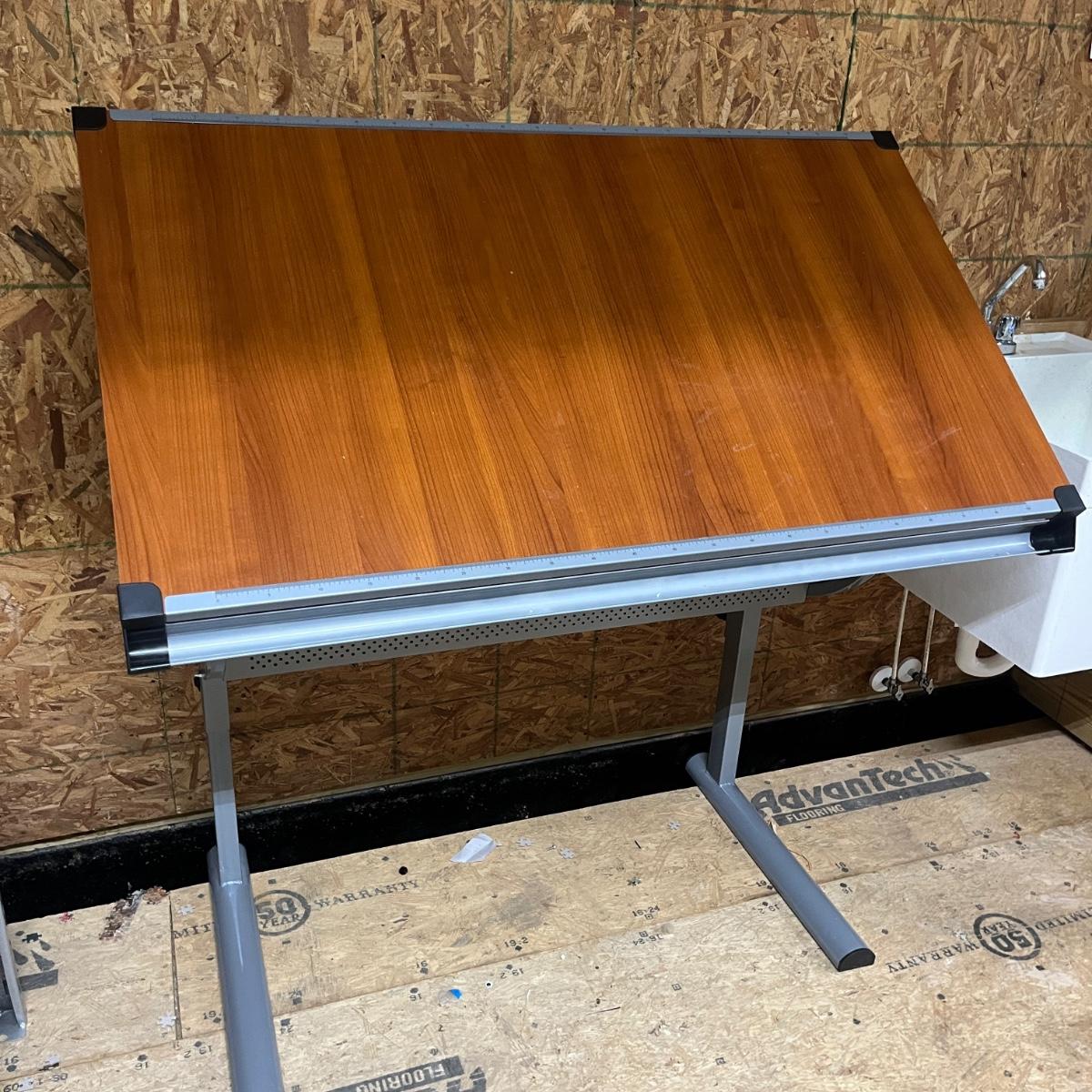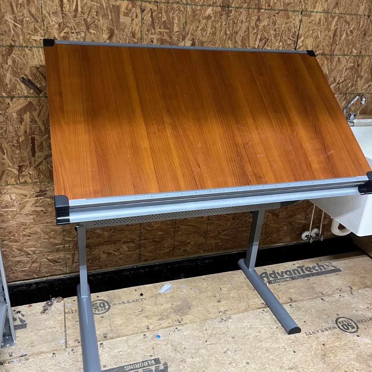 This art/drafting table has a metal body with a wooden top and height adjustable legs. Table measures 46” x 28” x 36”H as pictured. Top tilts and has some scratches and a few remnants of paint, see pictures.