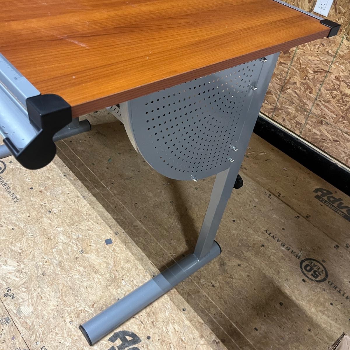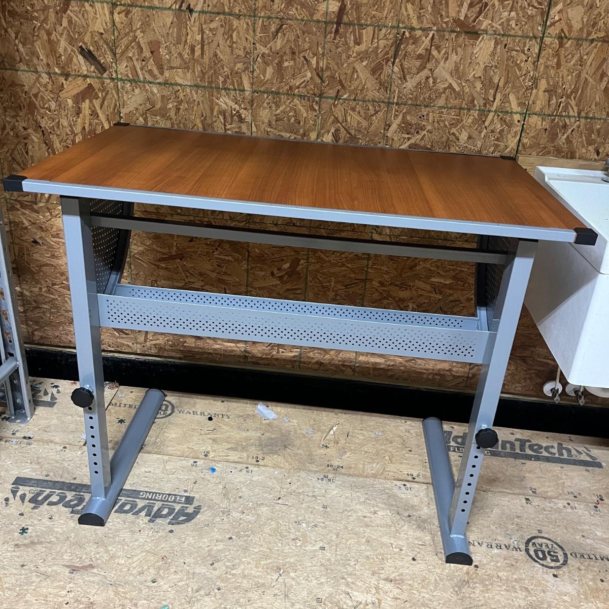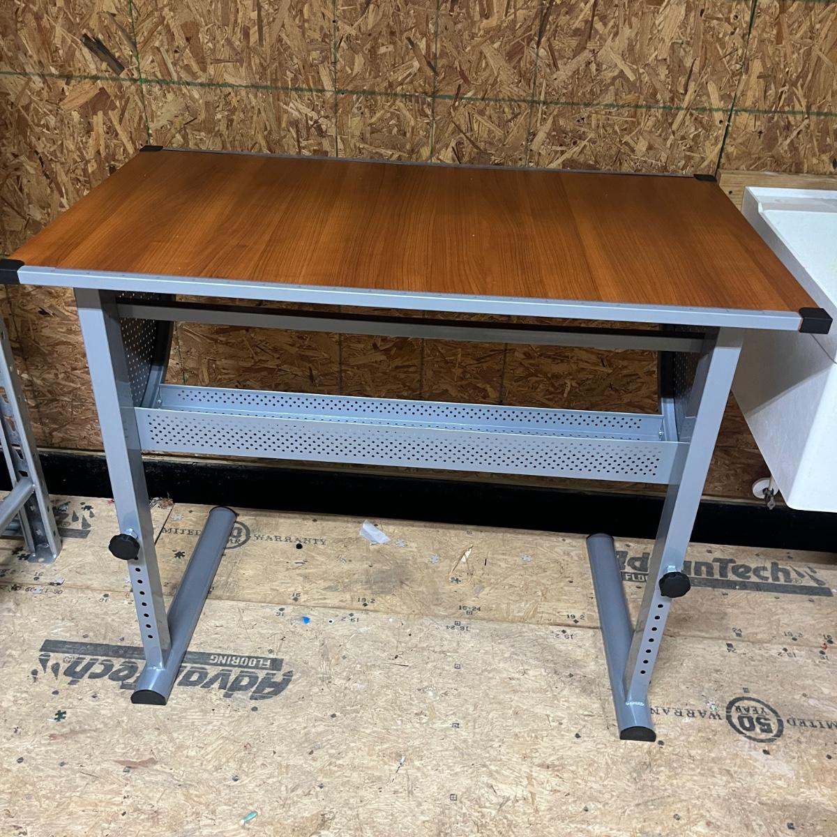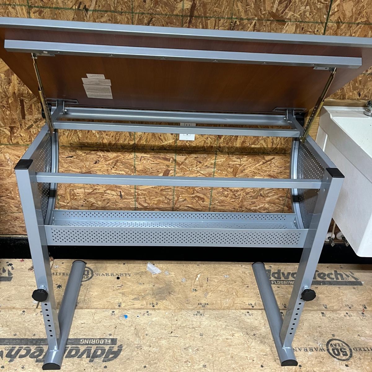 This art/drafting table has a metal body with a wooden top and height adjustable legs. Table measures 46” x 28” x 36”H as pictured. Top tilts and has some scratches and a few remnants of paint, see pictures.