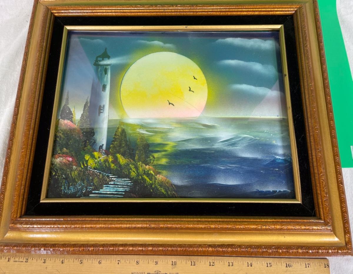 Framed Lighthouse Ocean Scene Wall Art Signed