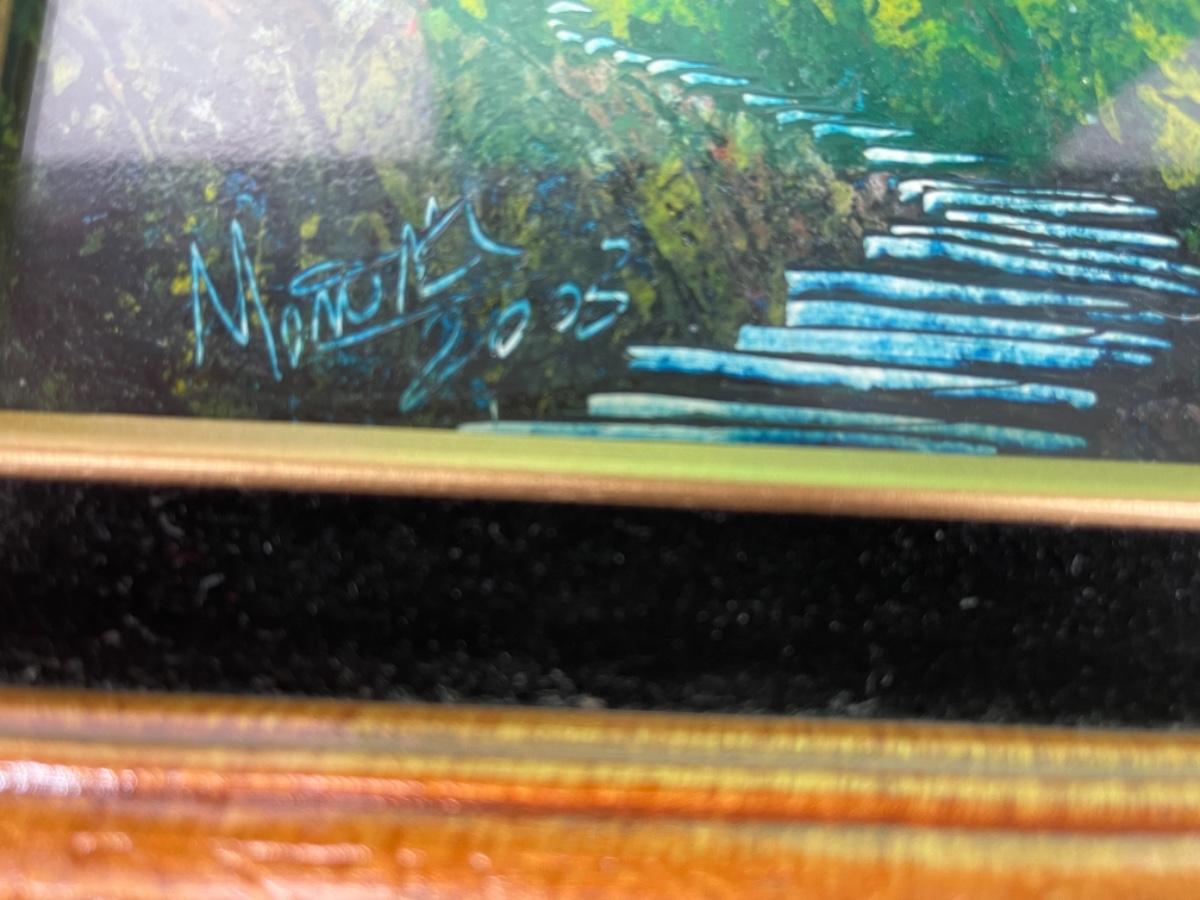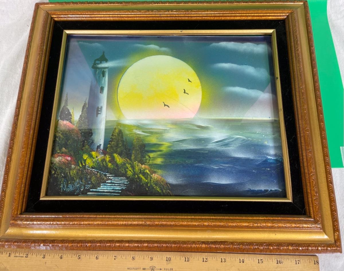 Framed Lighthouse Ocean Scene Wall Art. Signed in the lower left corner. About 18" across.