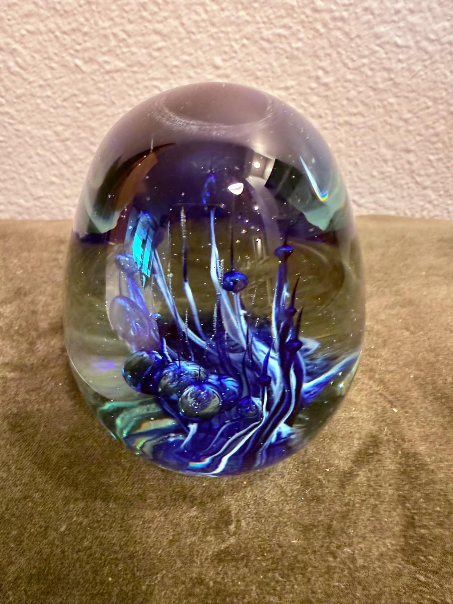 Pre-Owned. - Art Glass Blue Swirl Paperweight - SPW-3. 3.1/4in Tall