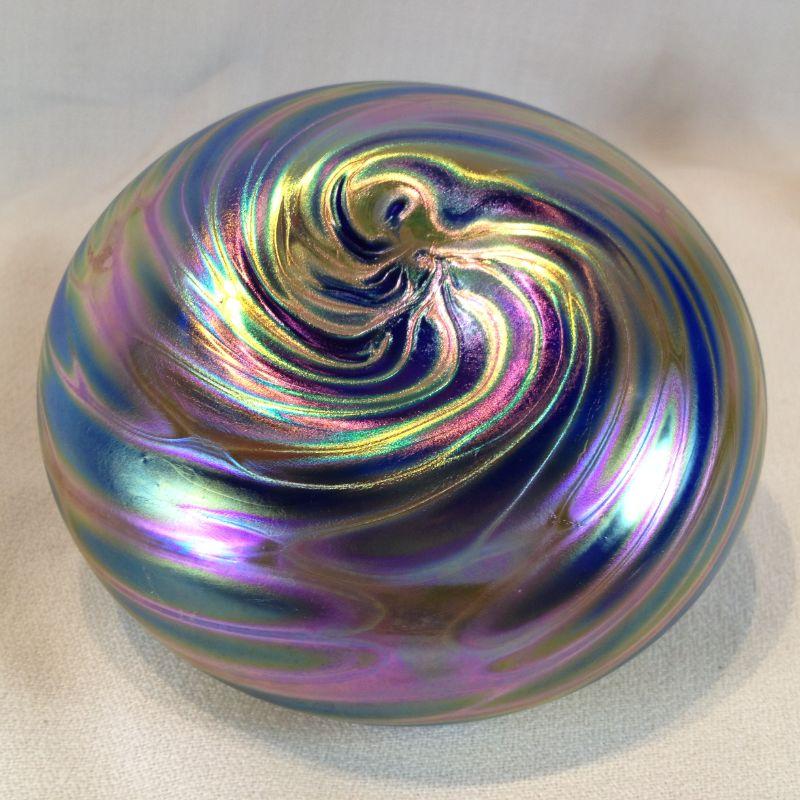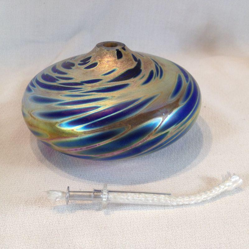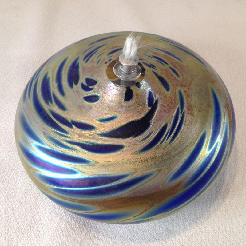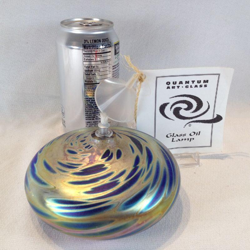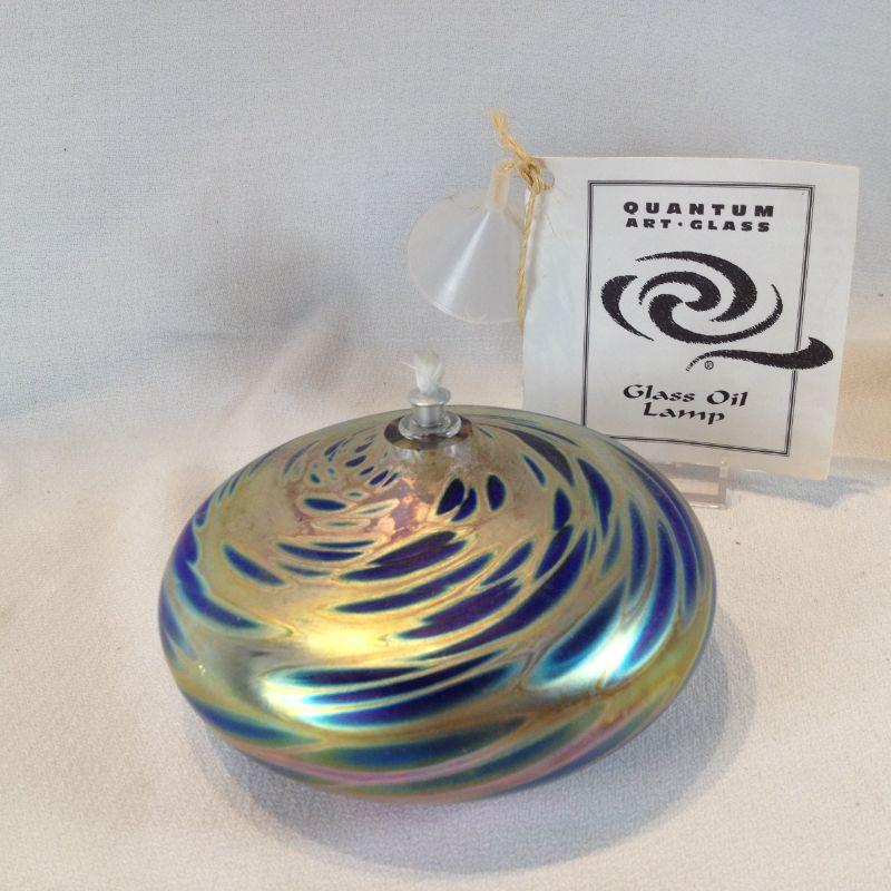 This lot is a Quantum Art Glass Oil Lamp. Comes with it's own little refueling funnel. Unused and beautiful. It is 5-inches in diameter. Quite a decorator piece - and useful when the power goes out.