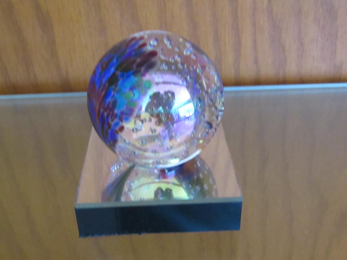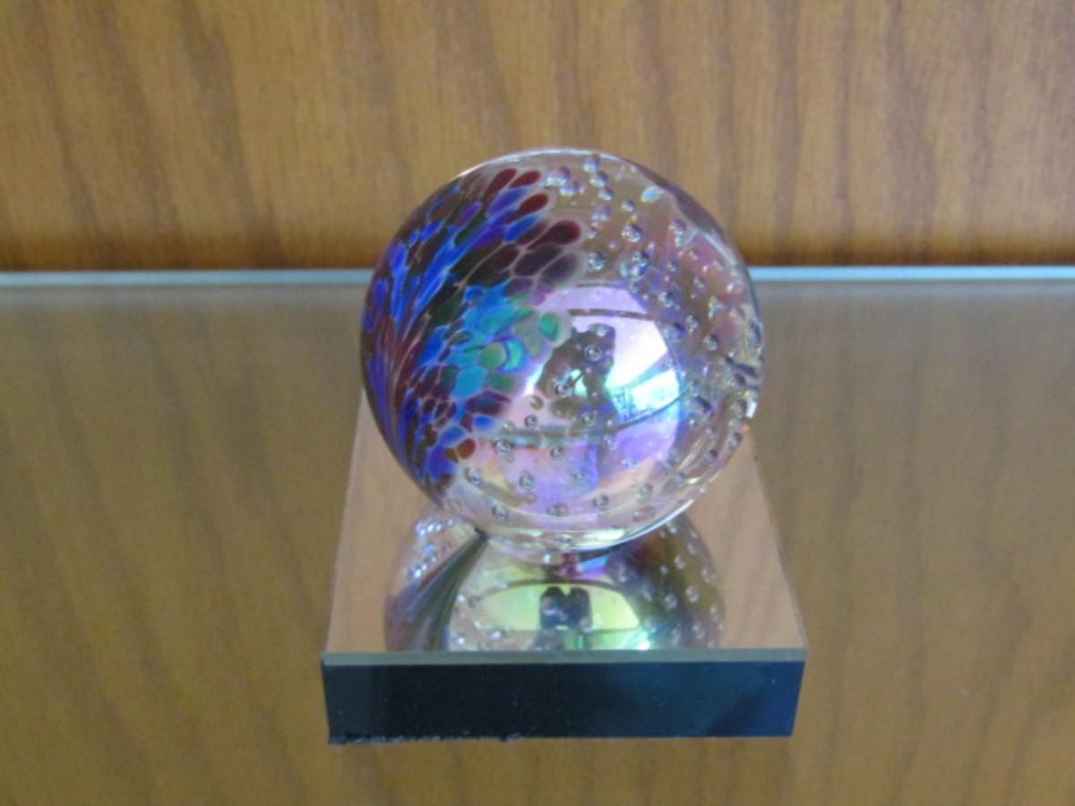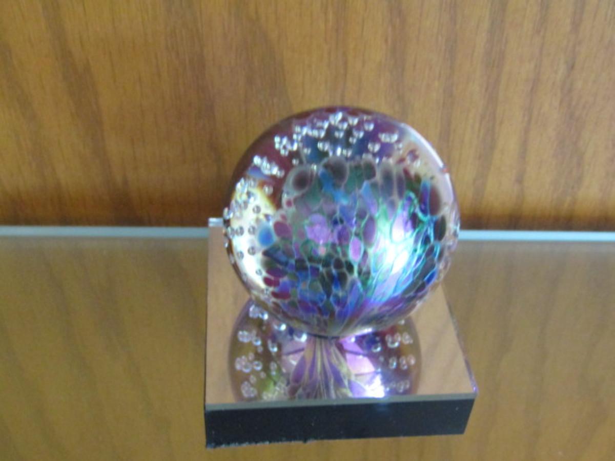 Art Glass Paper Weight with Mirrored Pedestal- Signed GES 01- Approx 2" Tall