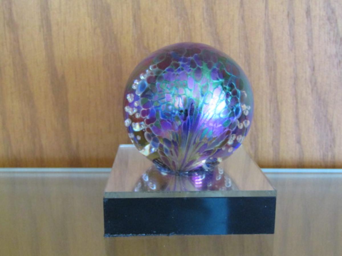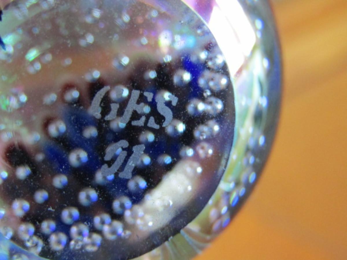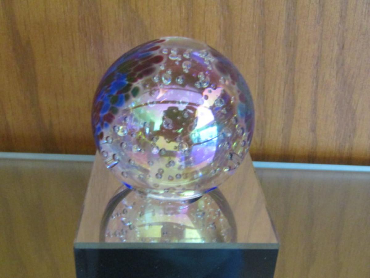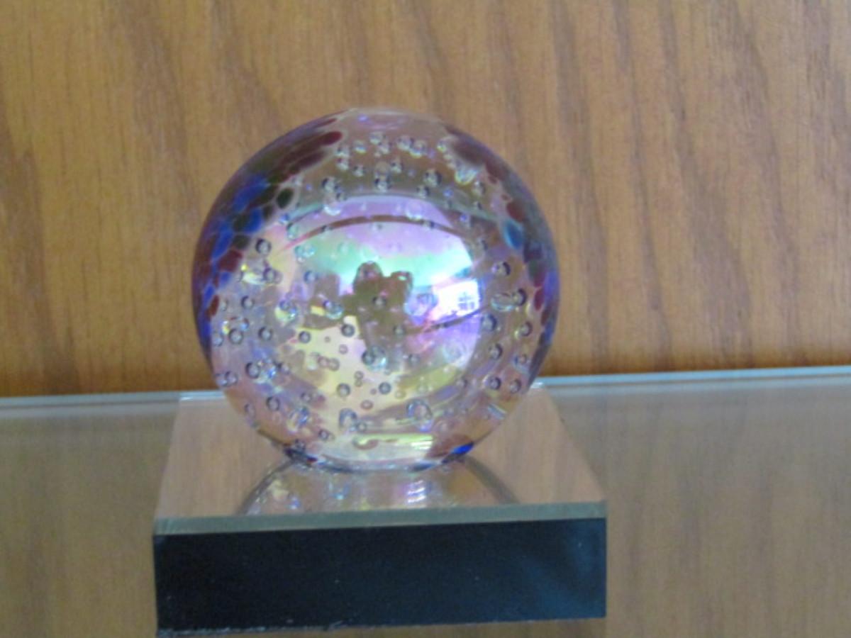 Art Glass Paper Weight with Mirrored Pedestal- Signed GES 01- Approx 2" Tall