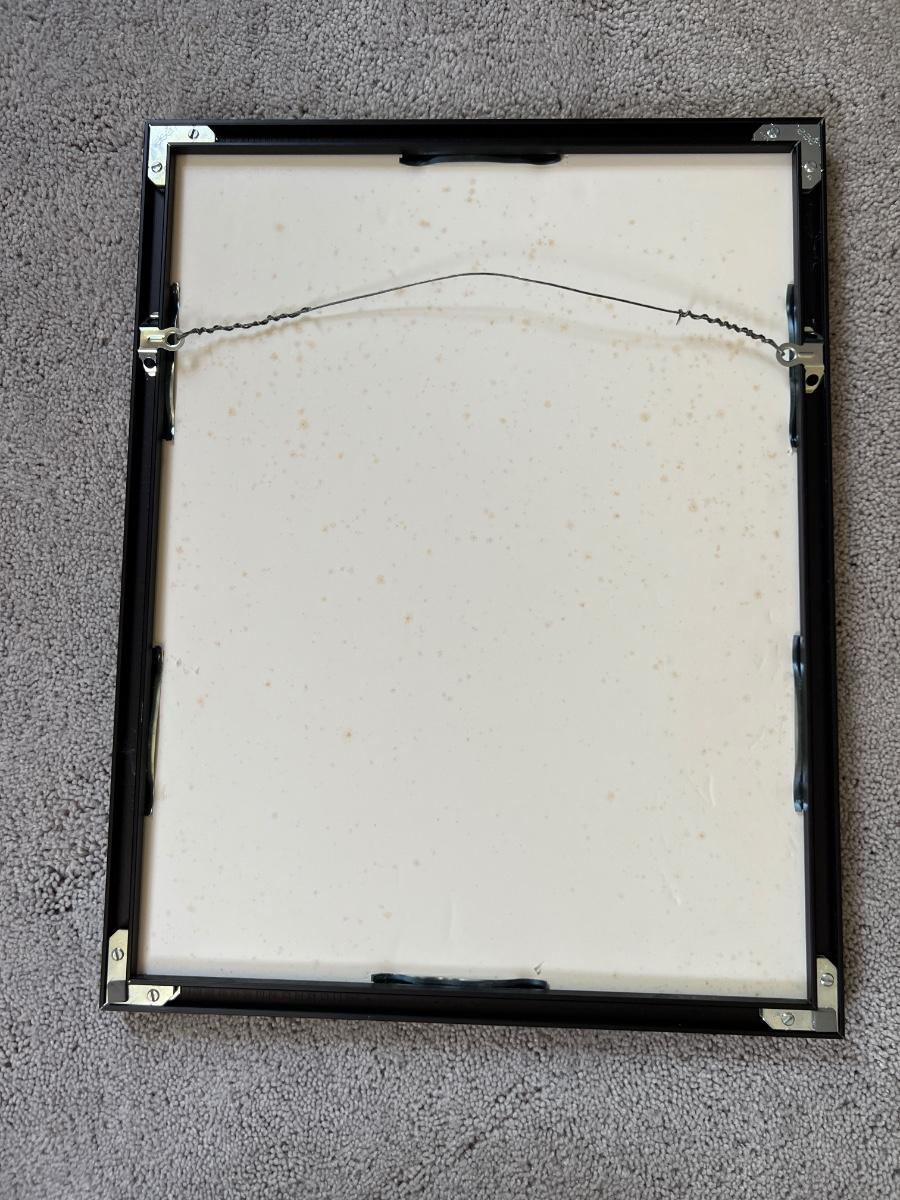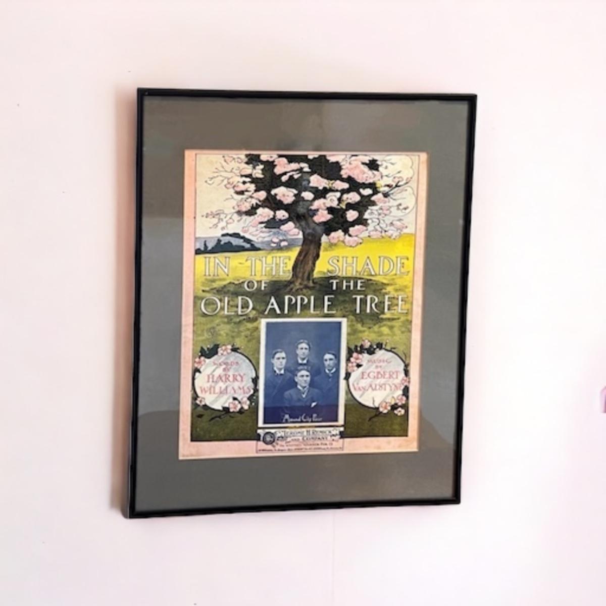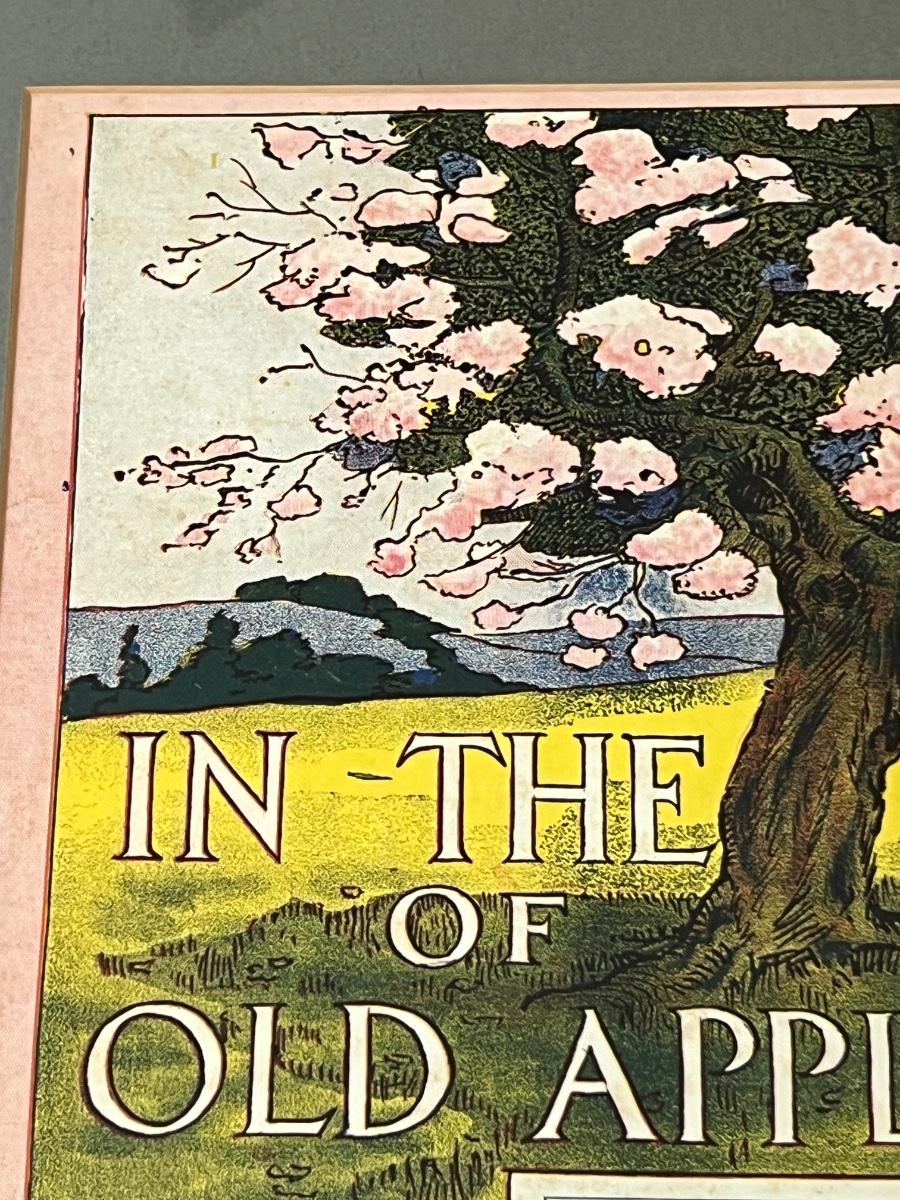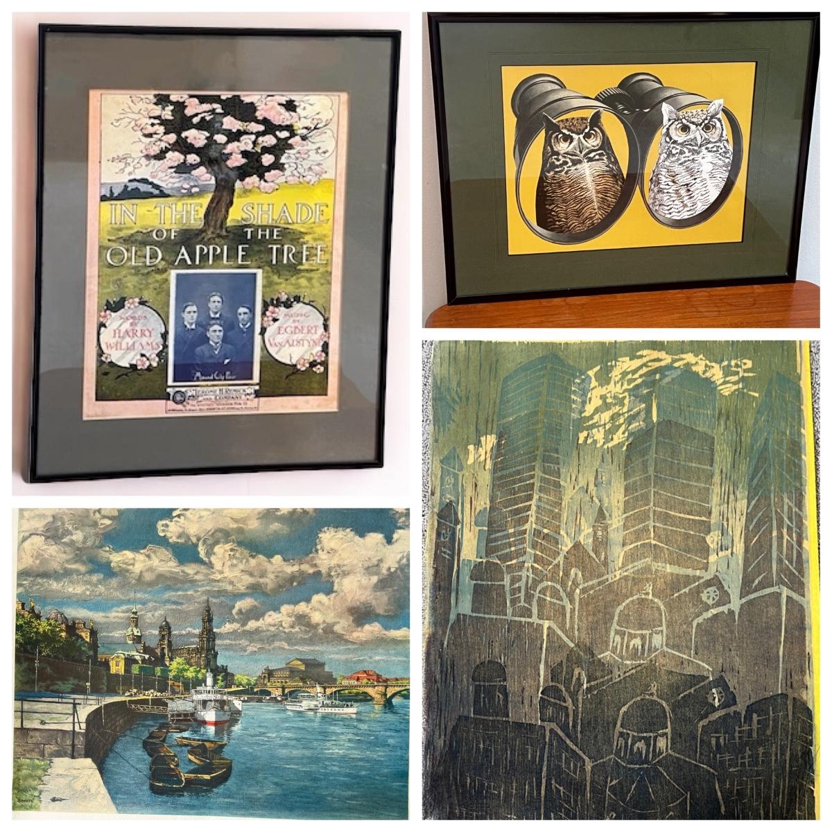 Framed antique piano music cover, framed collage art from 60’s magazine, MCM block print art on cotton paper?, water scene print.