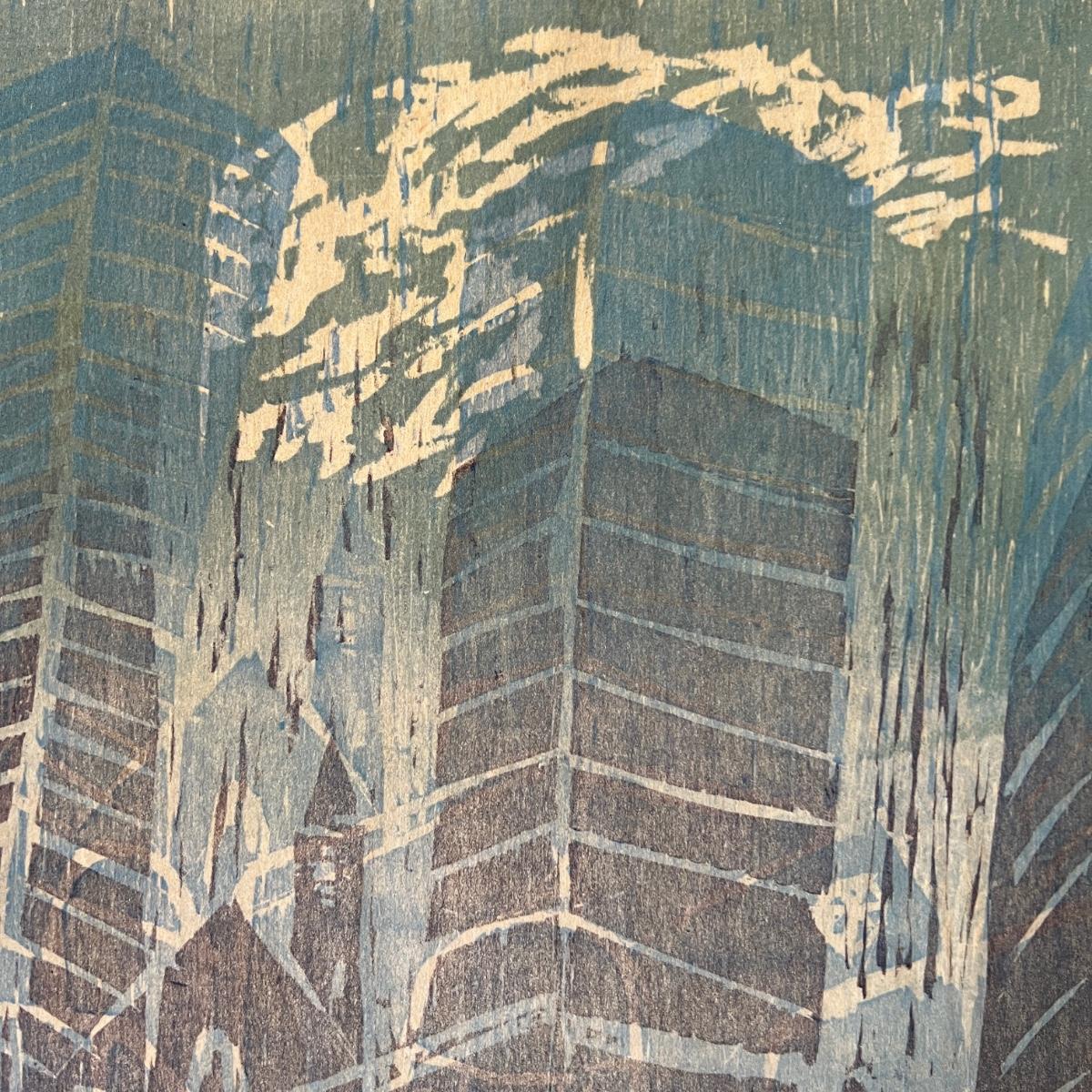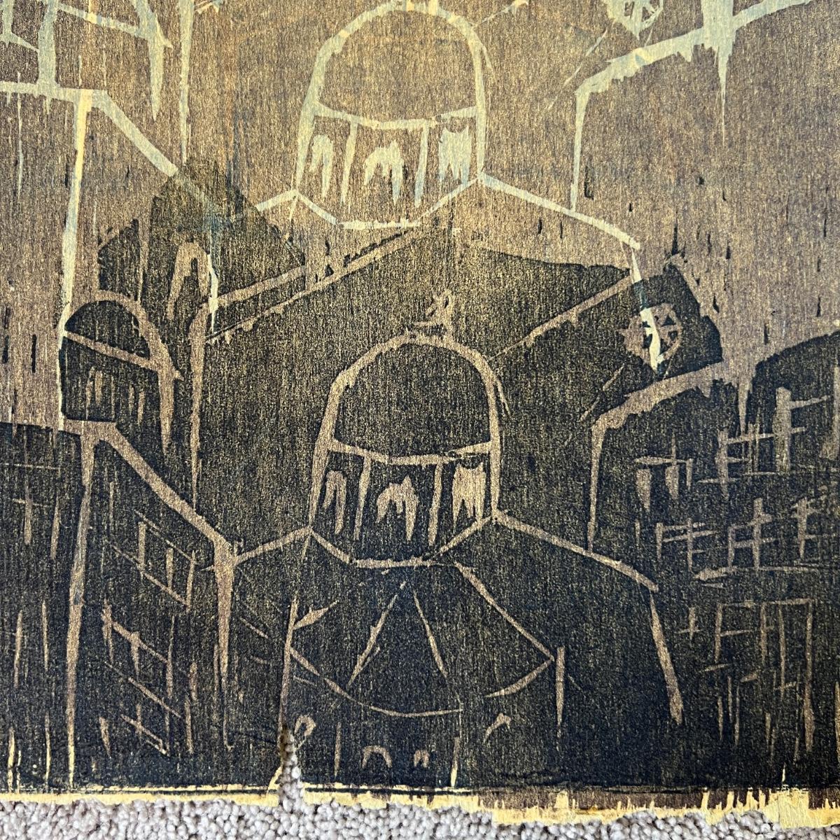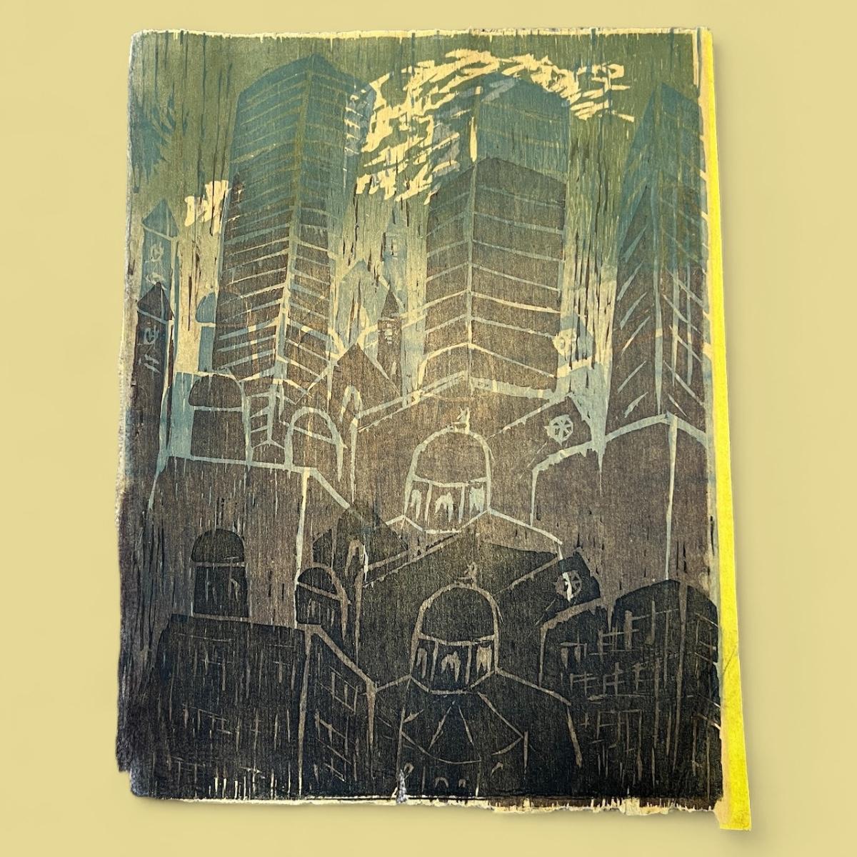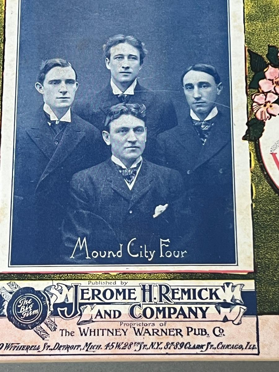 Framed antique piano music cover, framed collage art from 60’s magazine, MCM block print art on cotton paper?, water scene print.