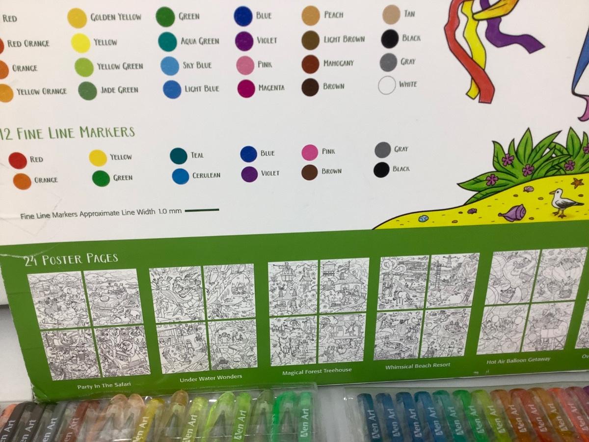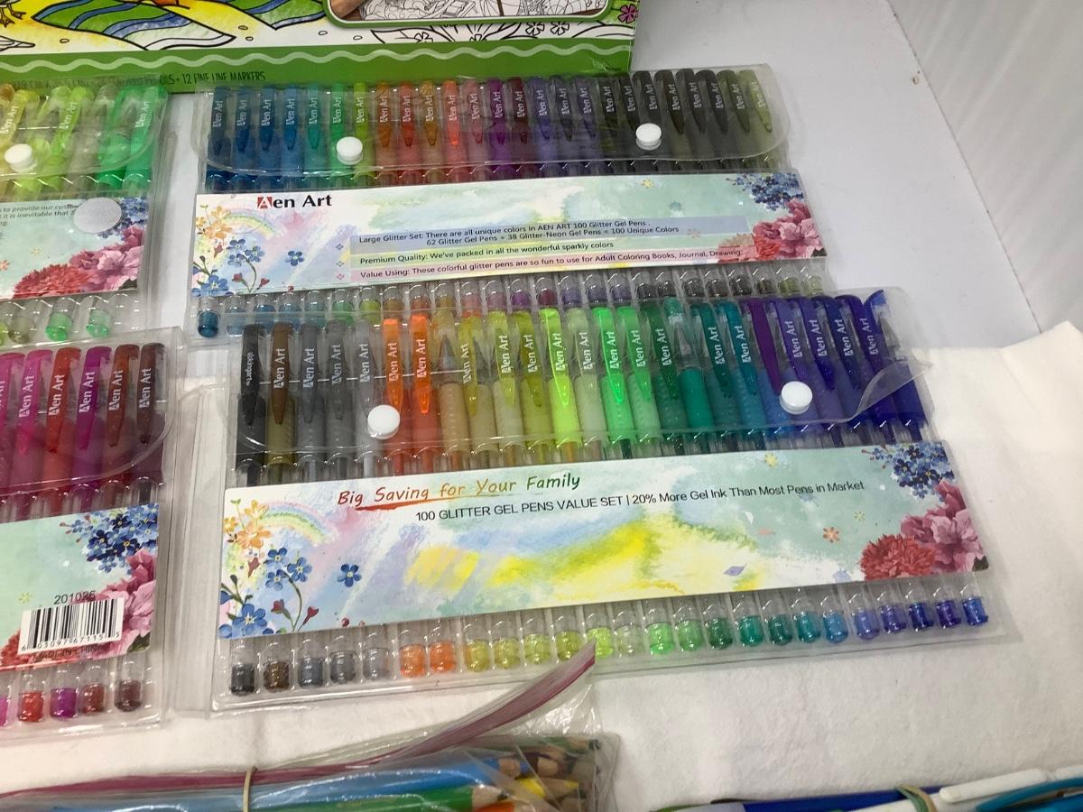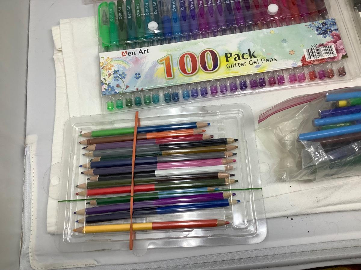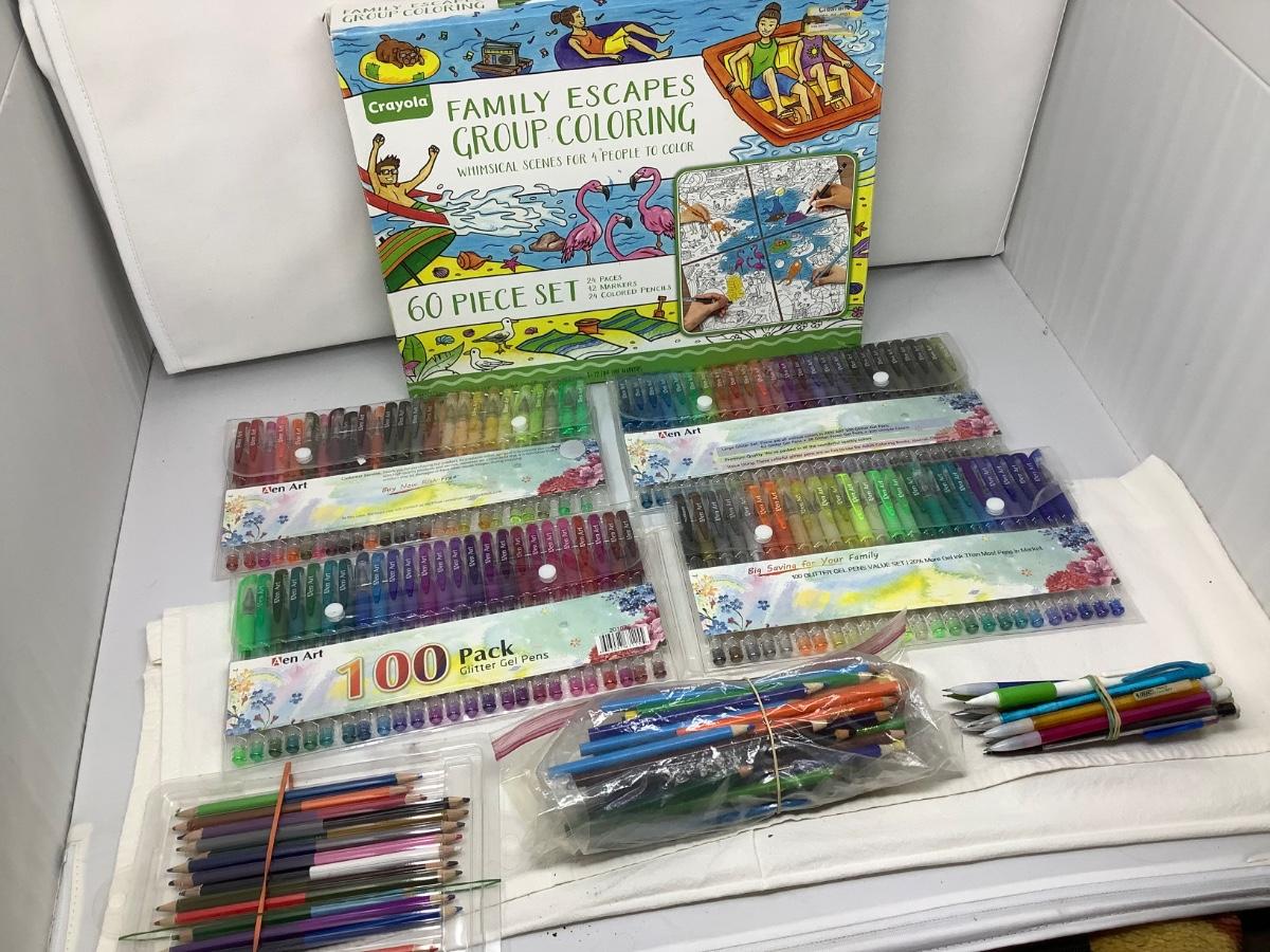 You get a 60 piece Crayola group coloring kit, two sets of 100 Ven Art glitter markers, color pencils and lead pencils.