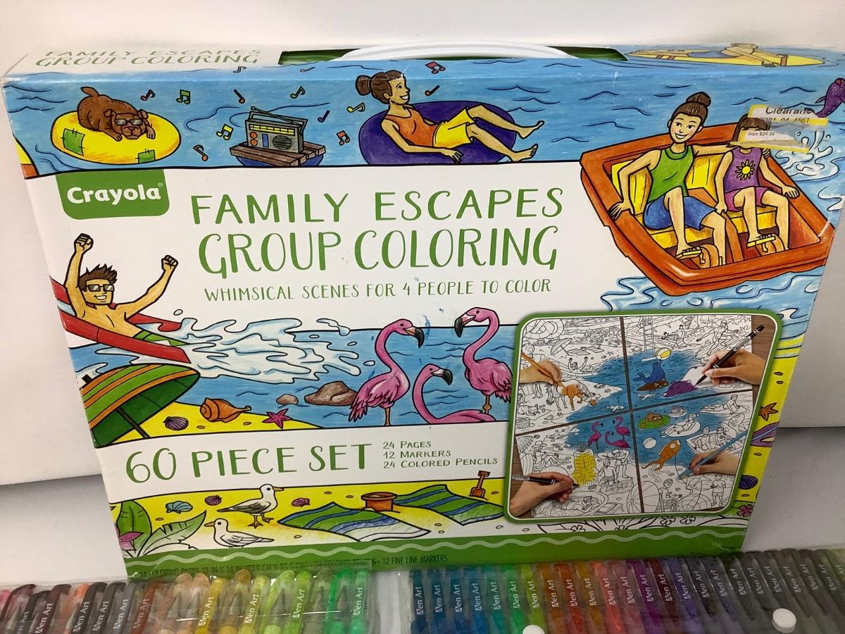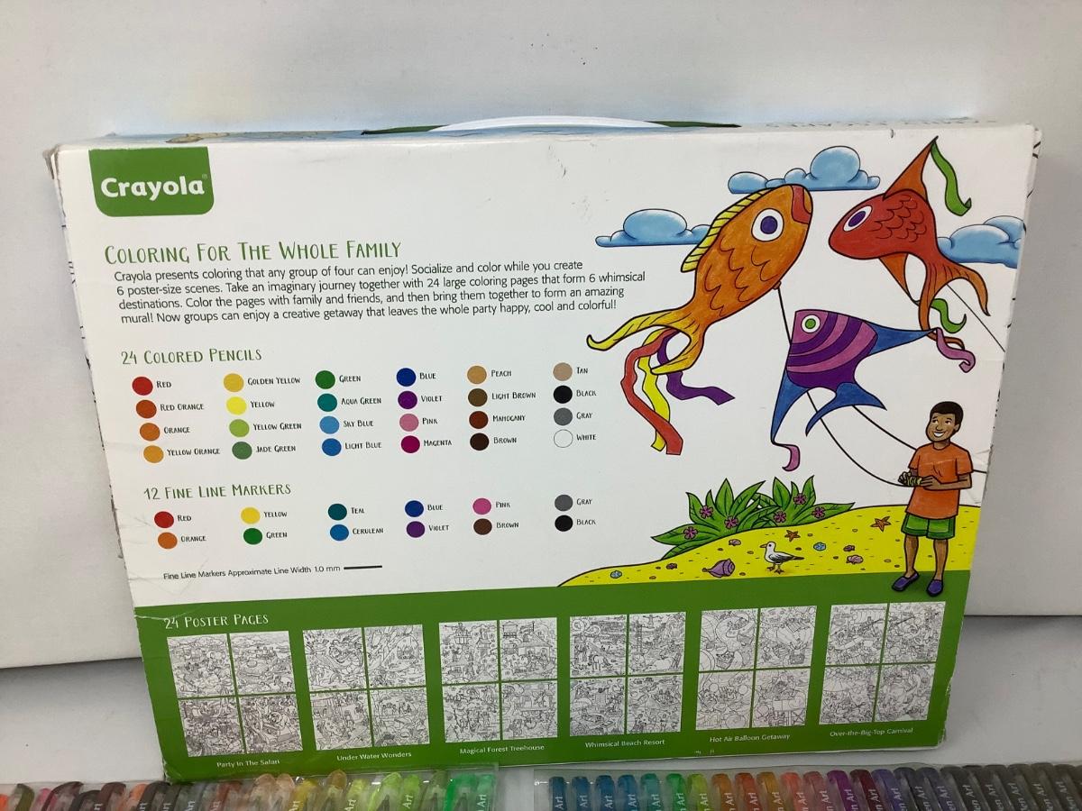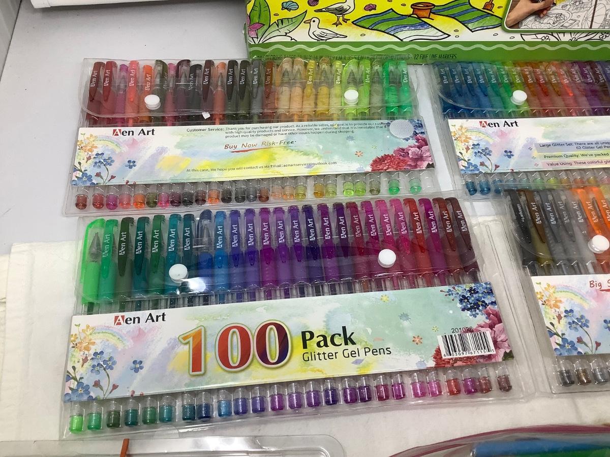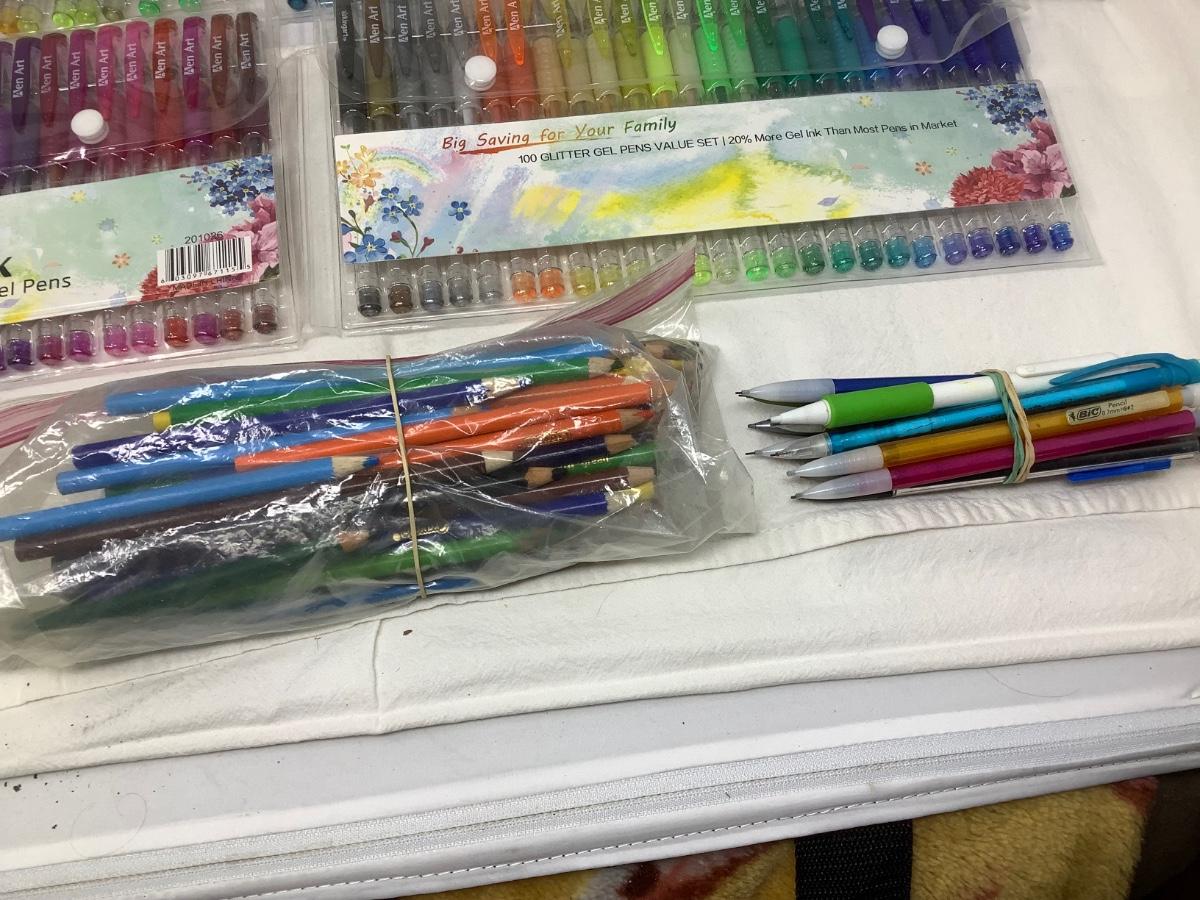 You get a 60 piece Crayola group coloring kit, two sets of 100 Ven Art glitter markers, color pencils and lead pencils.