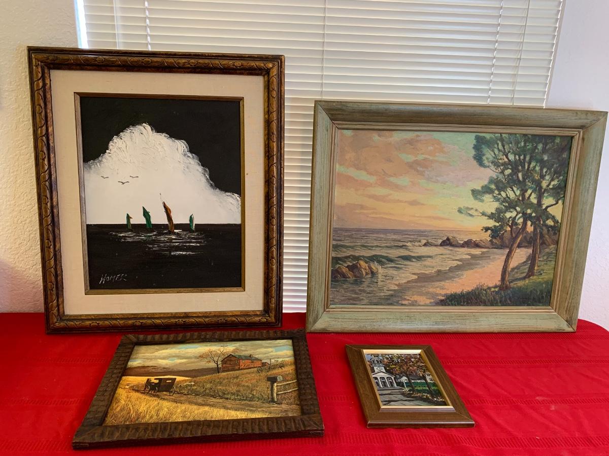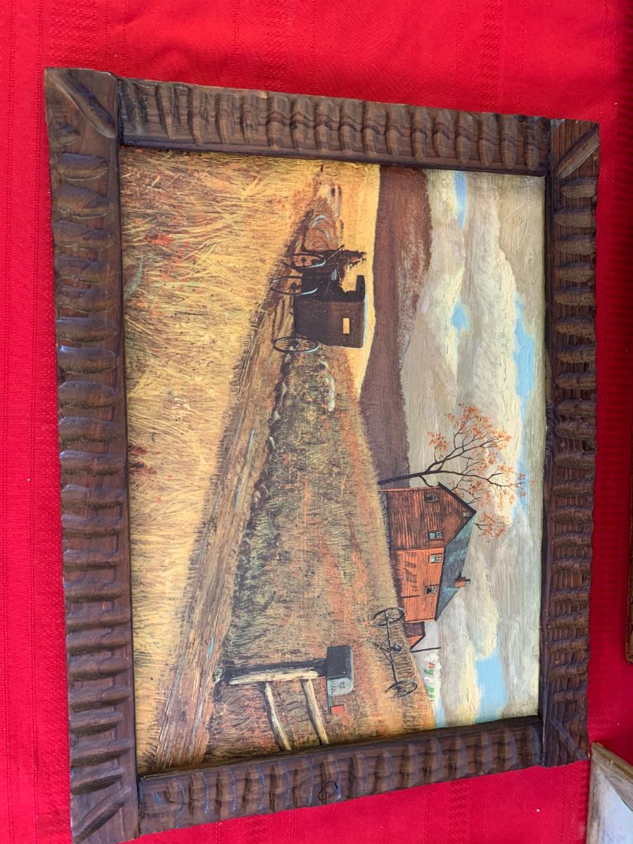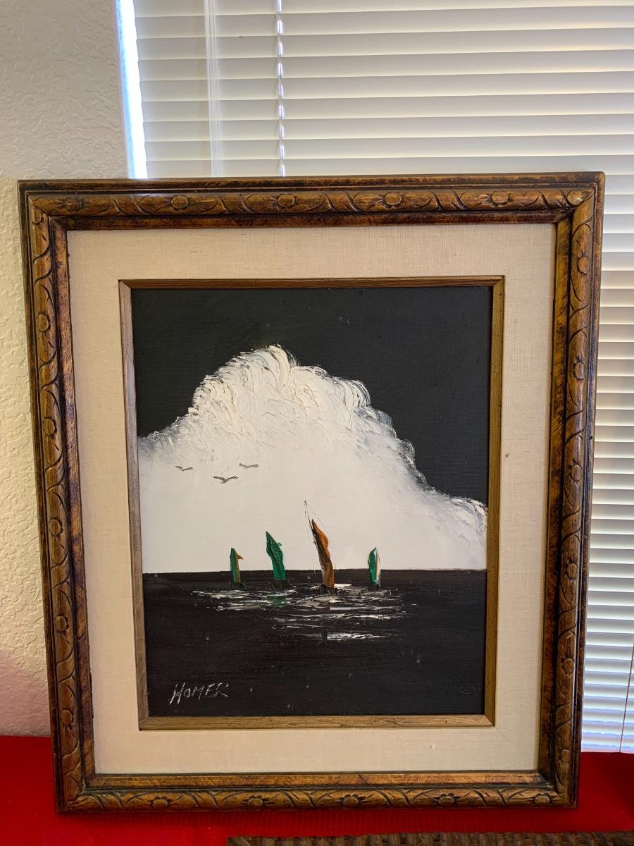 Original by Homer Costello, Original acrylic by J Vincent Dungan, Original oil by Alice Nuss and a framed print titled “Homecoming.” All in excellent condition, were professionally wrapped and stored. Homer frame measures 29” x 24”