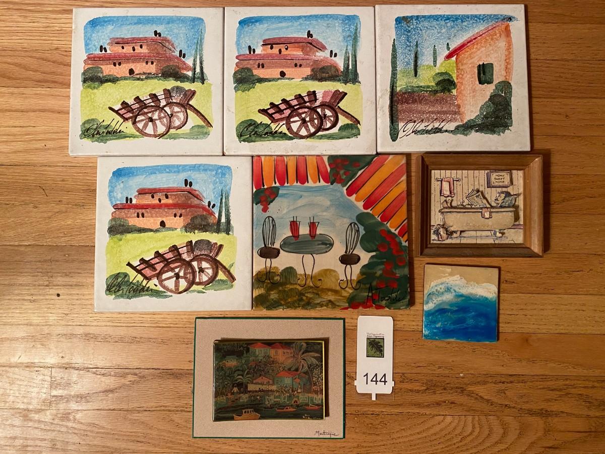 Hand-painted, Italian porcelain tiles. Two pieces of additional art. Small tile 4" large tile 8"
