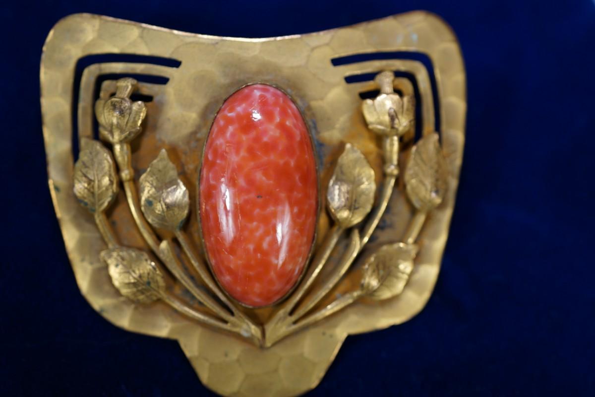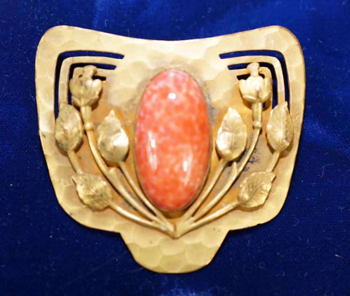 ART NOUVEAU BRASS DRESS PIN OVAL STONE