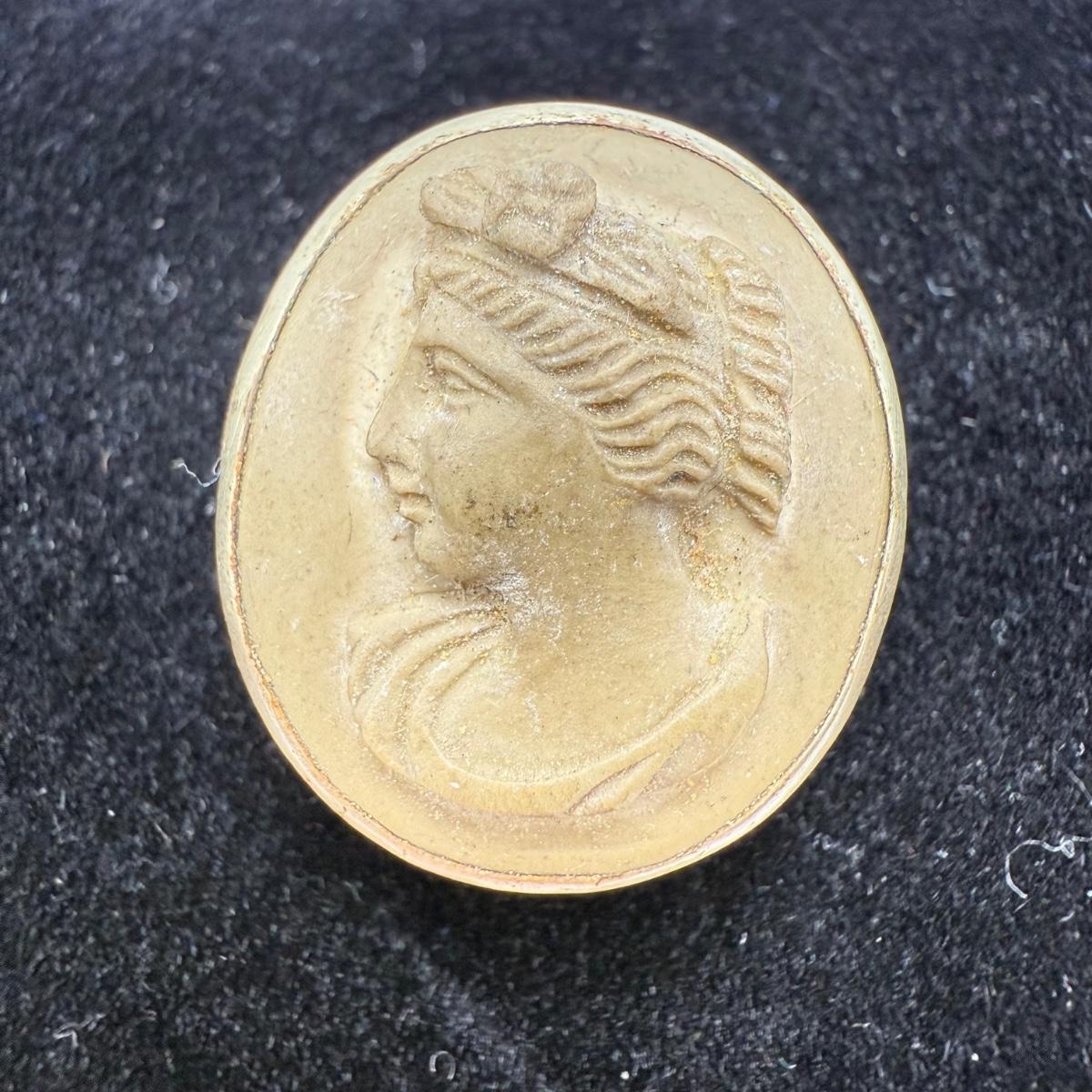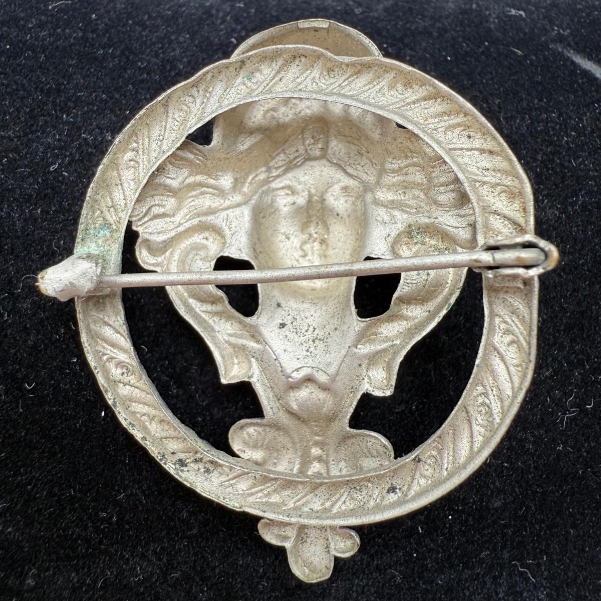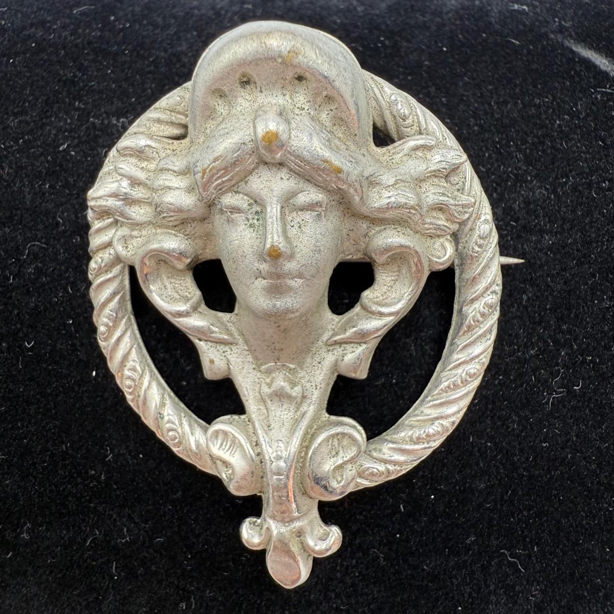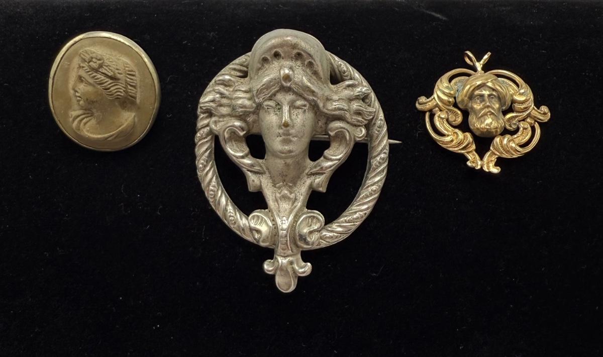 Three jewelry items with faces. The silver art nouveau style brooch measures approximately 1.75” x 2.25”H. The gold pendant features a turbaned man that has the appearance of similar Thief of Bagdad man pendants. It has no marking. The third item is a bachelor button cufflink that appears to be a lava cameo. It could be transformed into a classic pendant or brooch!