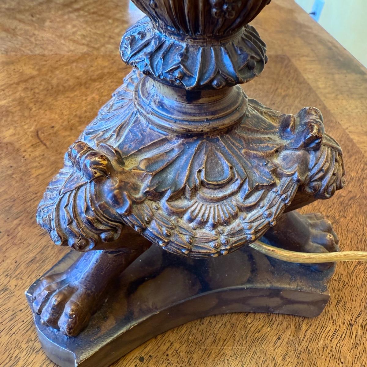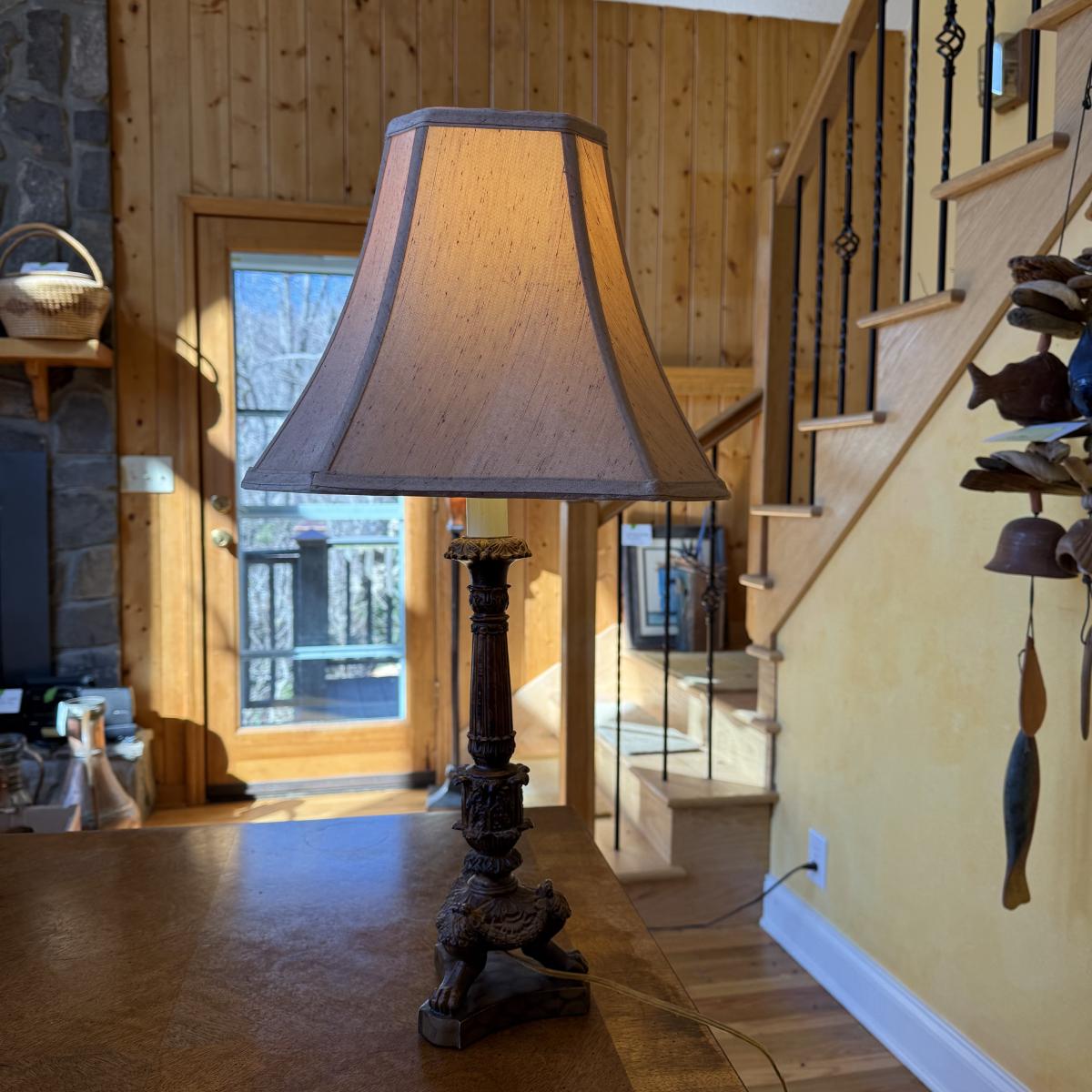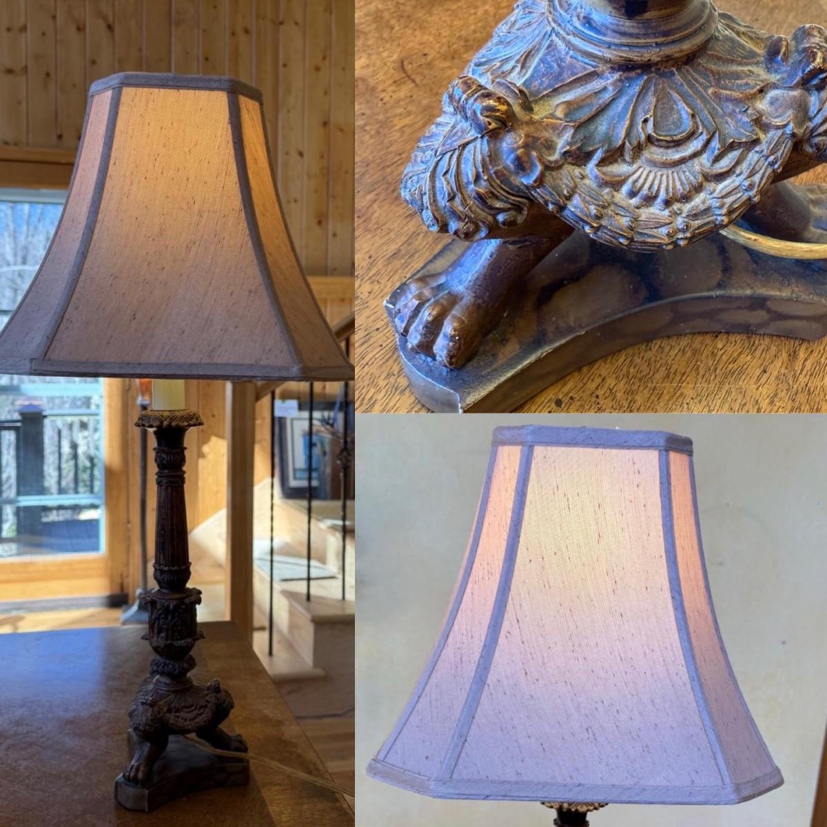 This lot contains a stunning art nouveau faux marble table lamp. The base appears to be made from plastic but has a stunning ornate detail to the rod and base. The shade is made of fabric. The base measures approximately 6” x 6” and the lamp stands 26.5”H. This lamp is a one way switch and does power on. Shipping available.