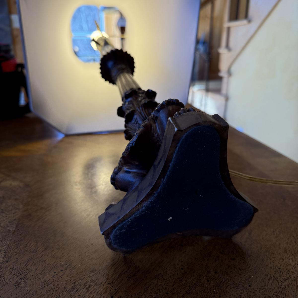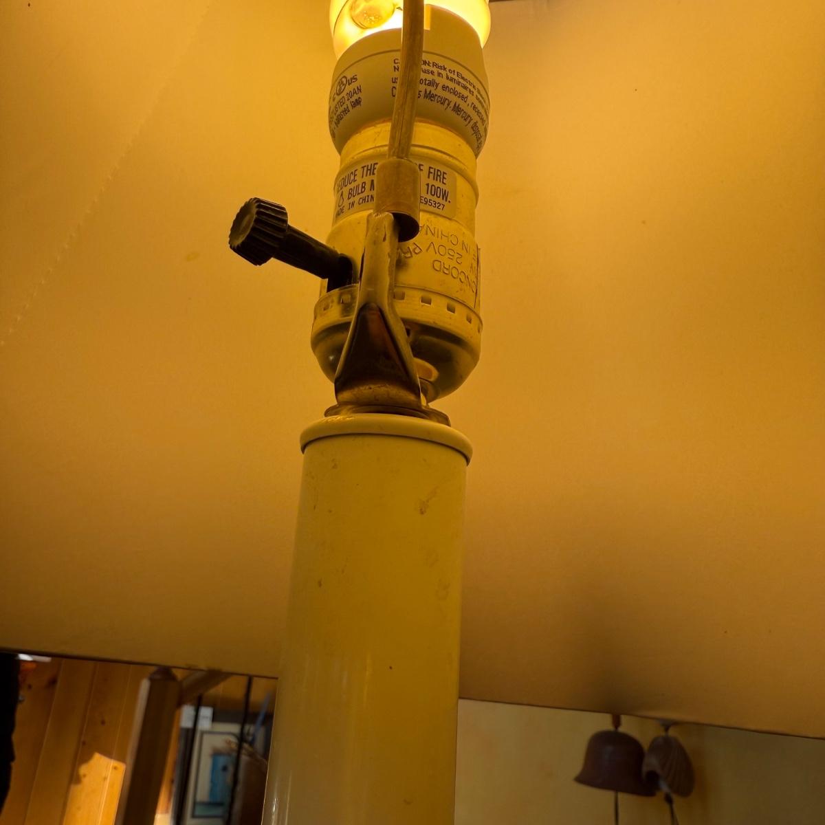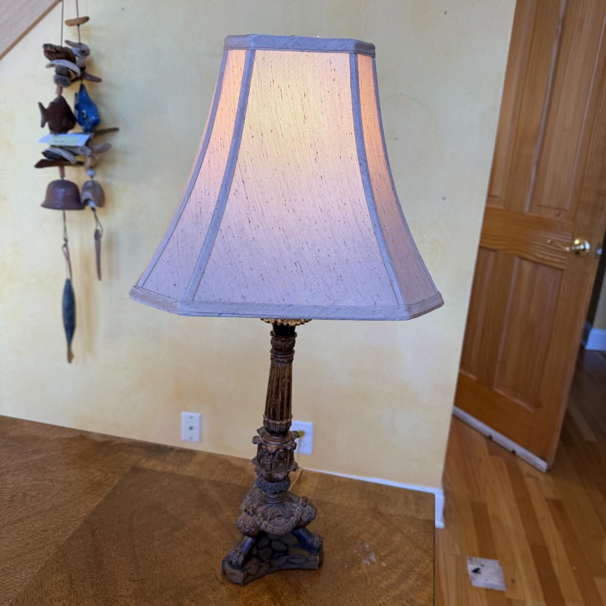 This lot contains a stunning art nouveau faux marble table lamp. The base appears to be made from plastic but has a stunning ornate detail to the rod and base. The shade is made of fabric. The base measures approximately 6” x 6” and the lamp stands 26.5”H. This lamp is a one way switch and does power on. Shipping available.