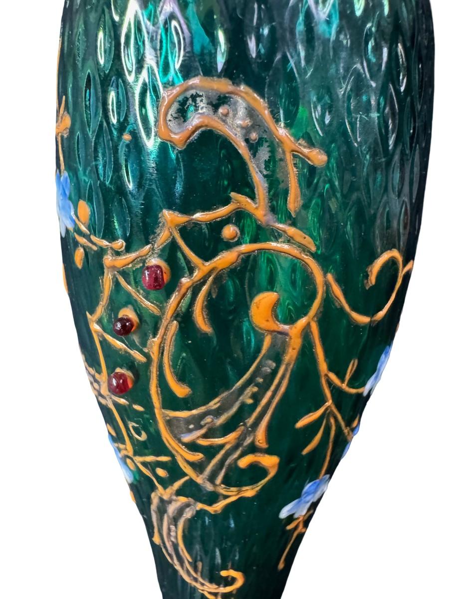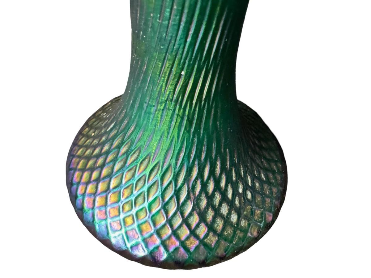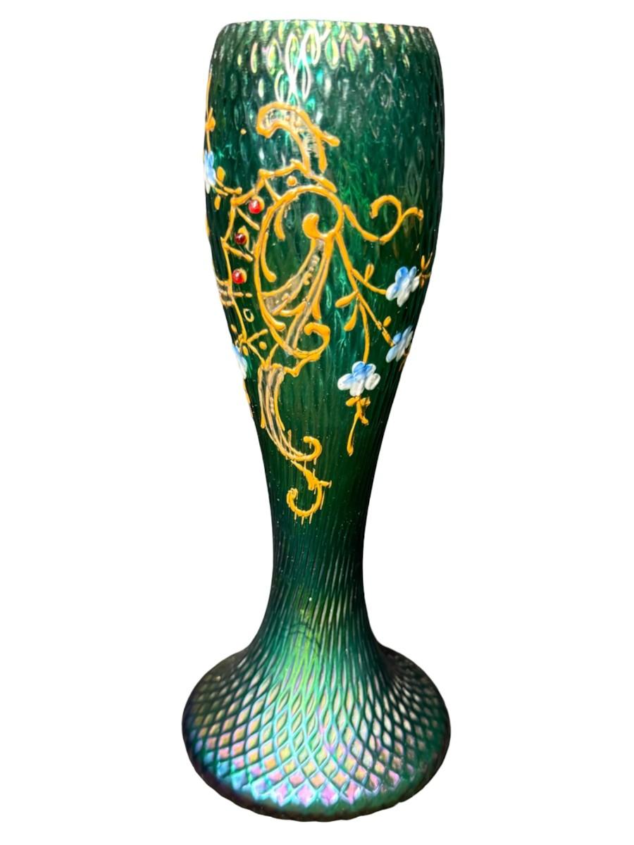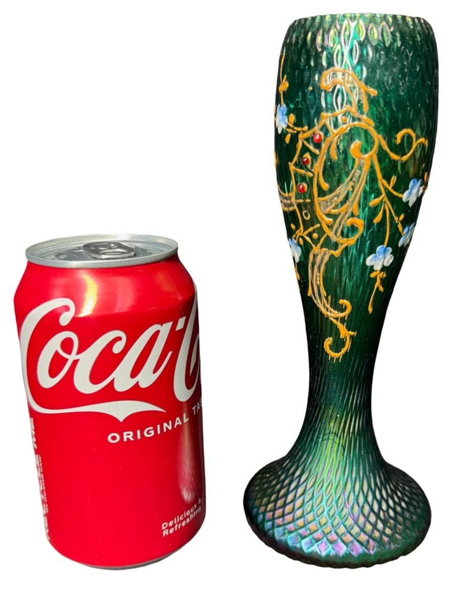 Art Nouveau Green Iridescent Vase with Hand Painted Flowers