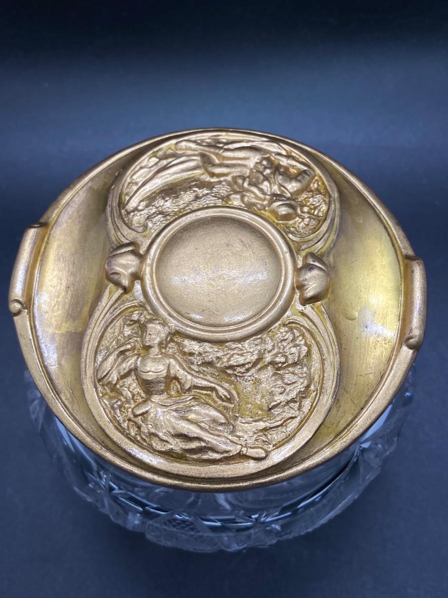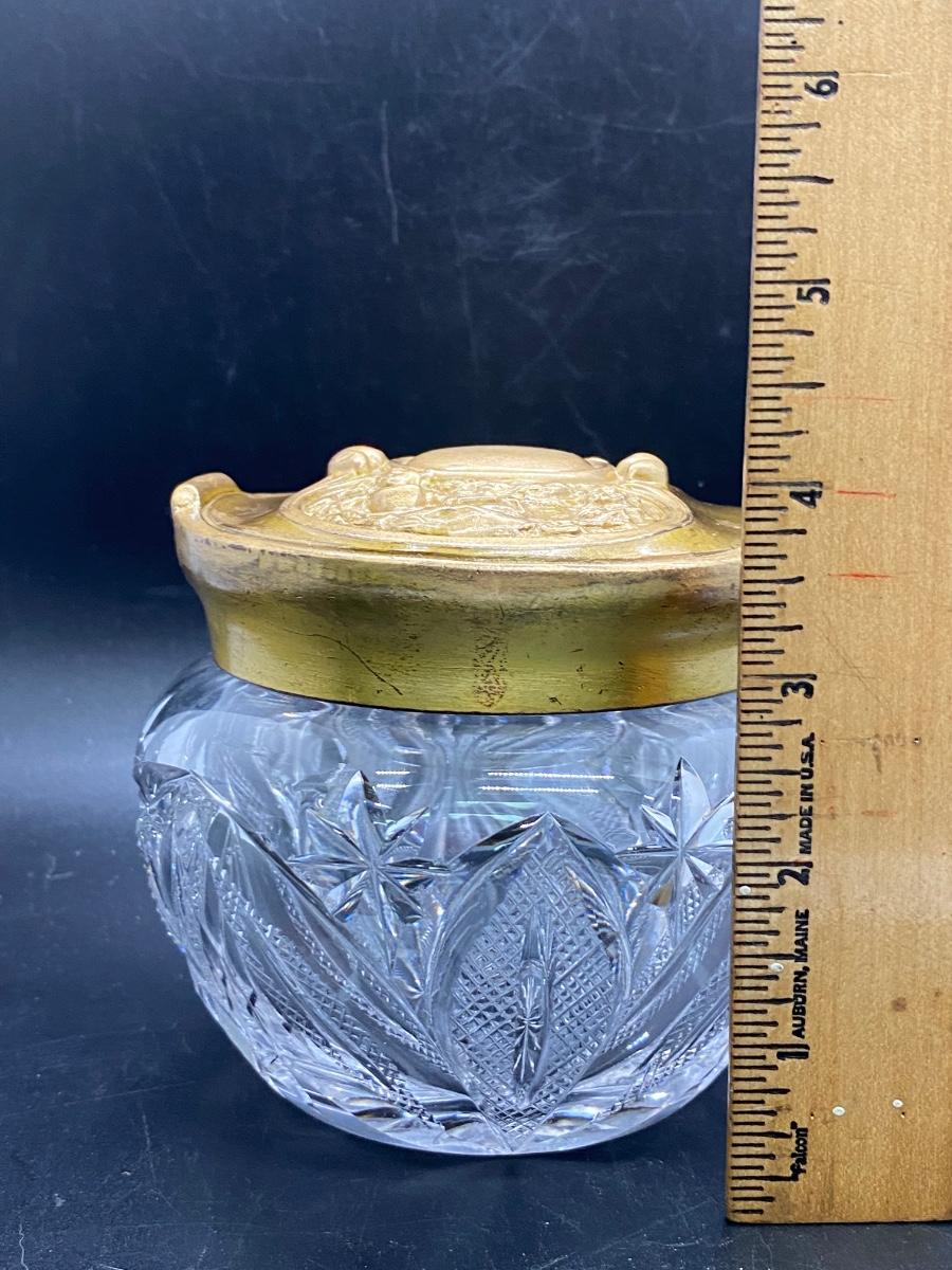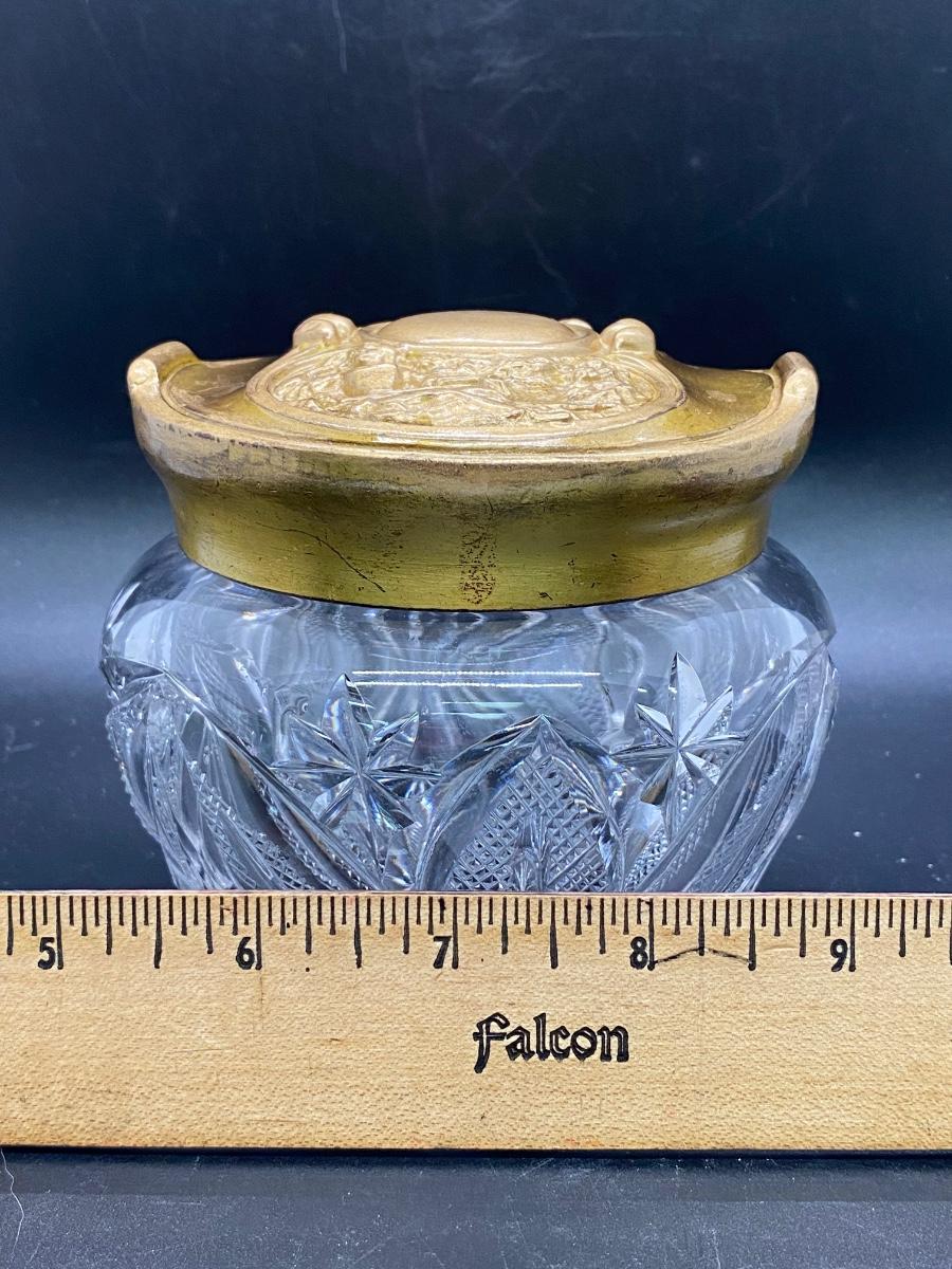 Beautiful art nouveau style apothecary jar. Heavy cut crystal jar with a painted metal lid. Lid has a beautiful figural design to it. Great dressing table/vanity jar. About 4" size.