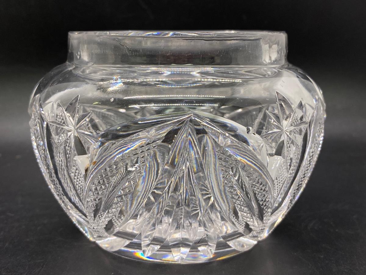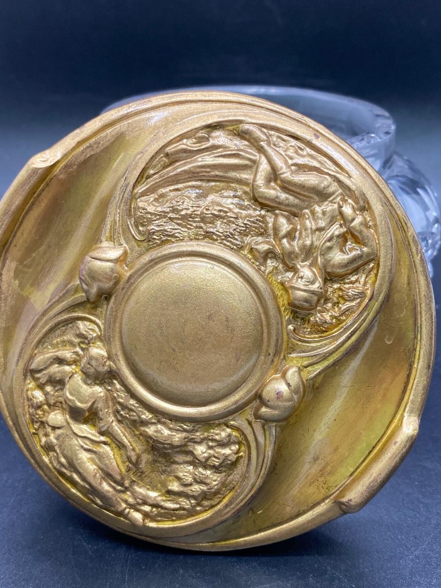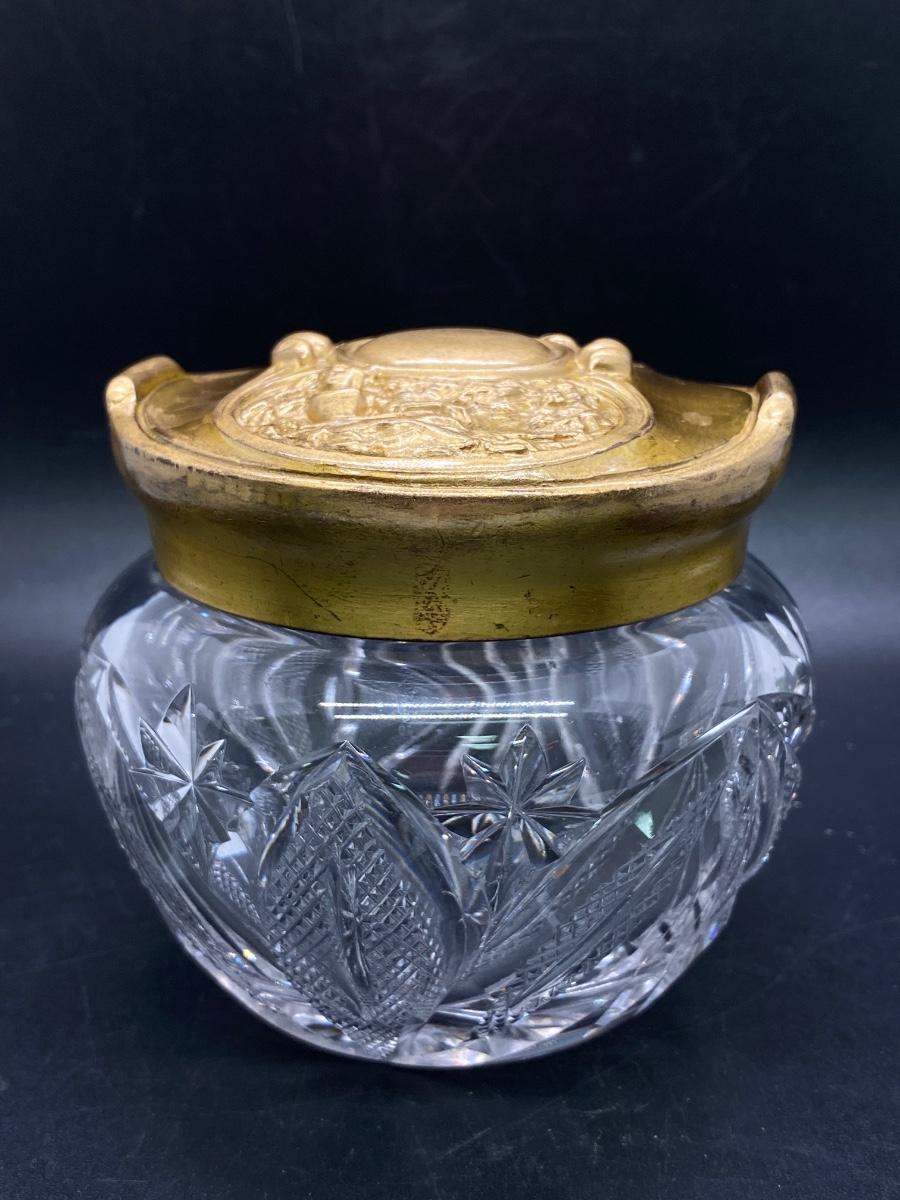 Beautiful art nouveau style apothecary jar. Heavy cut crystal jar with a painted metal lid. Lid has a beautiful figural design to it. Great dressing table/vanity jar. About 4" size.