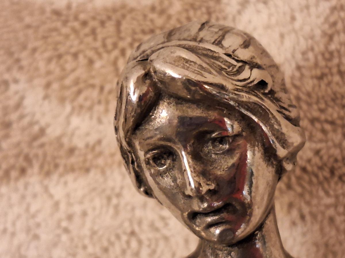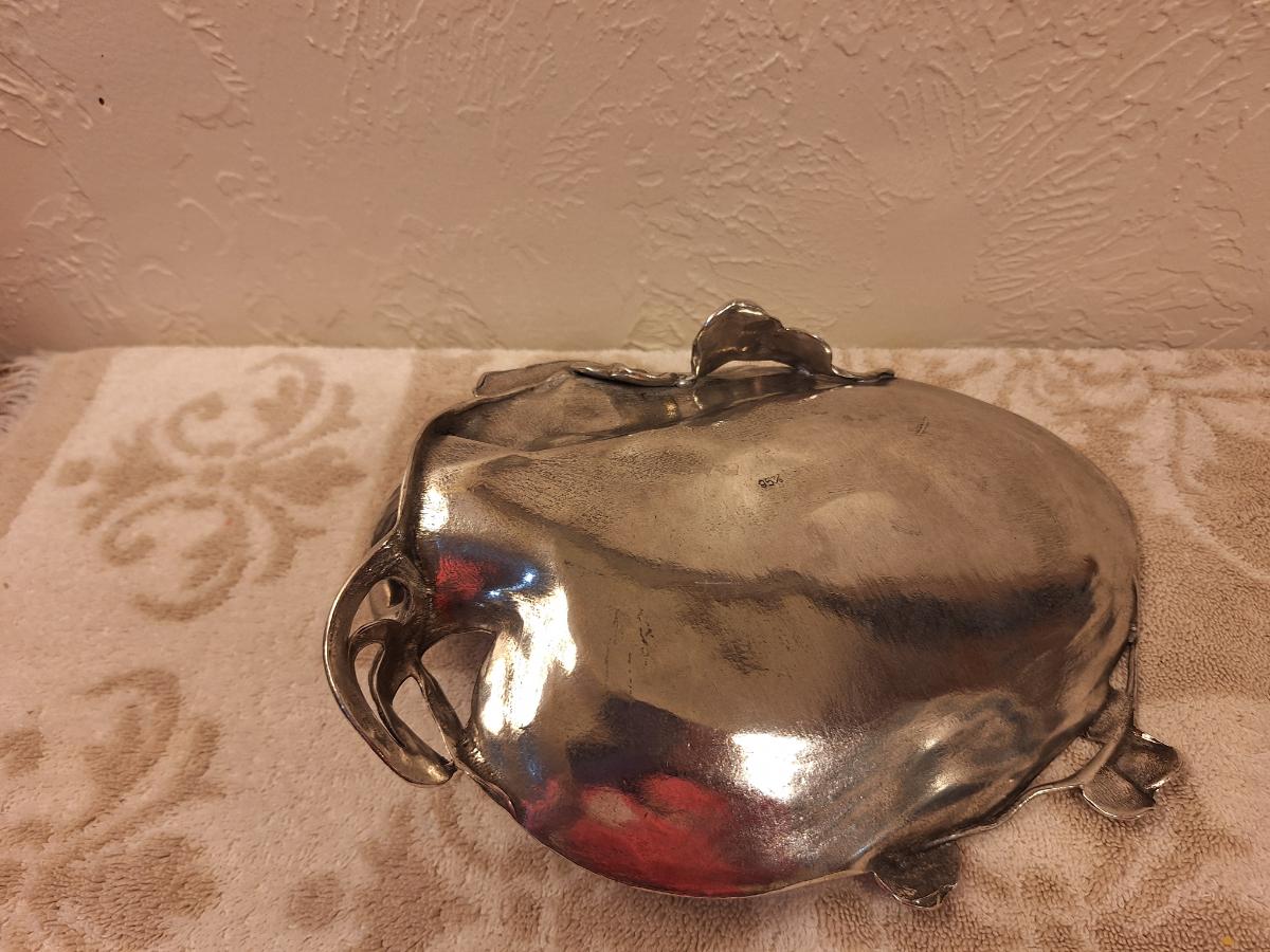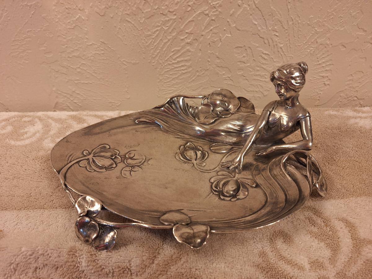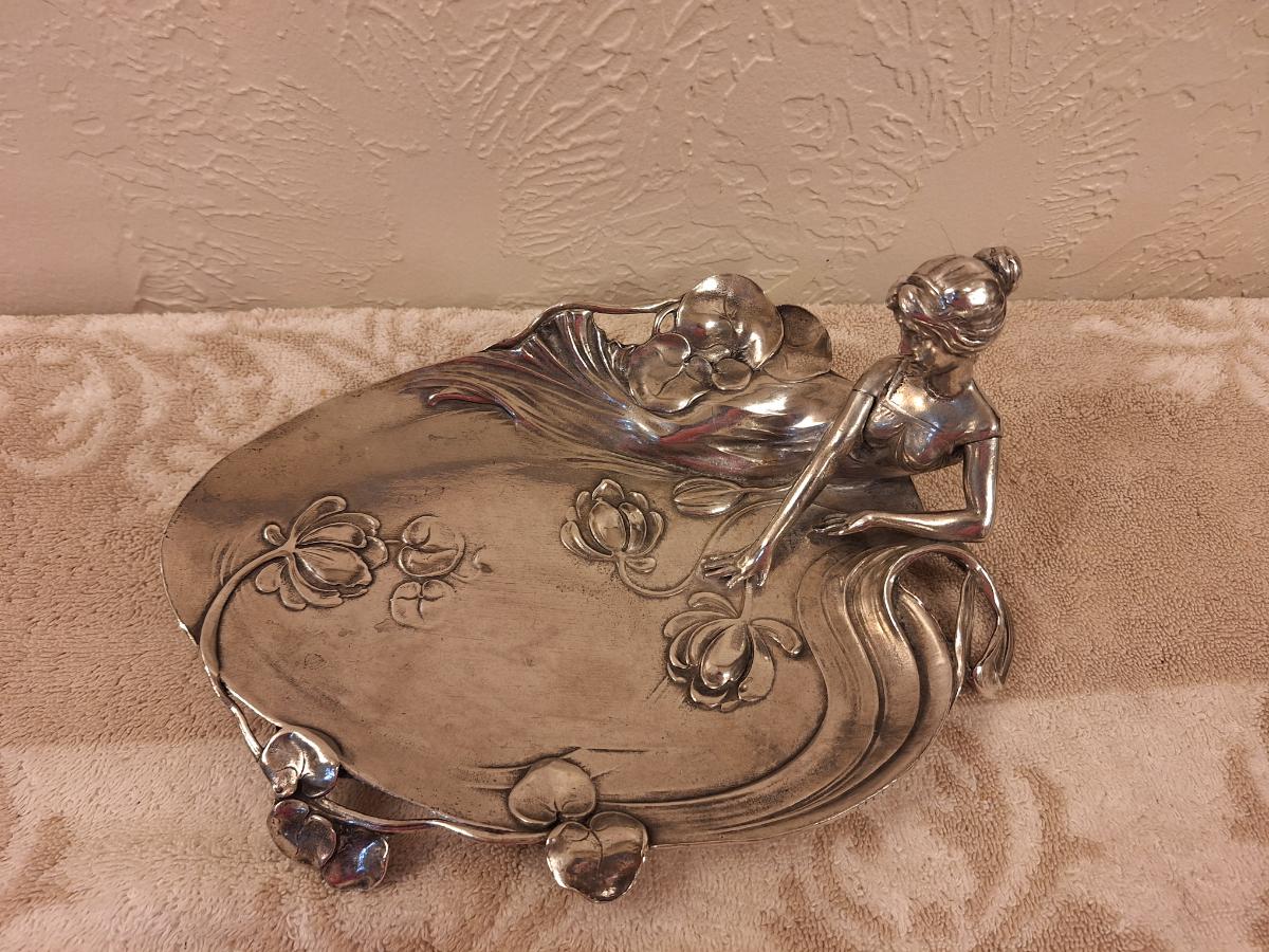 Art Nouveau silver-plated visiting card tray 95% pewter with silver plating.  Made by German company WMF (Württembergische Metallwarenfabrik).  "woman at the pond"  absolutely BEAUTIFUL