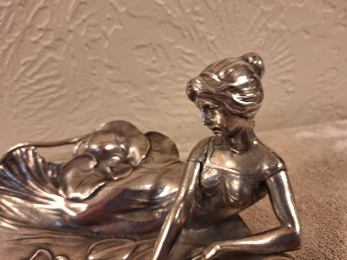 Art Nouveau silver-plated visiting card tray 95% pewter with silver plating. Made by German company WMF (Württembergische Metallwarenfabrik). "woman at the pond" absolutely BEAUTIFUL