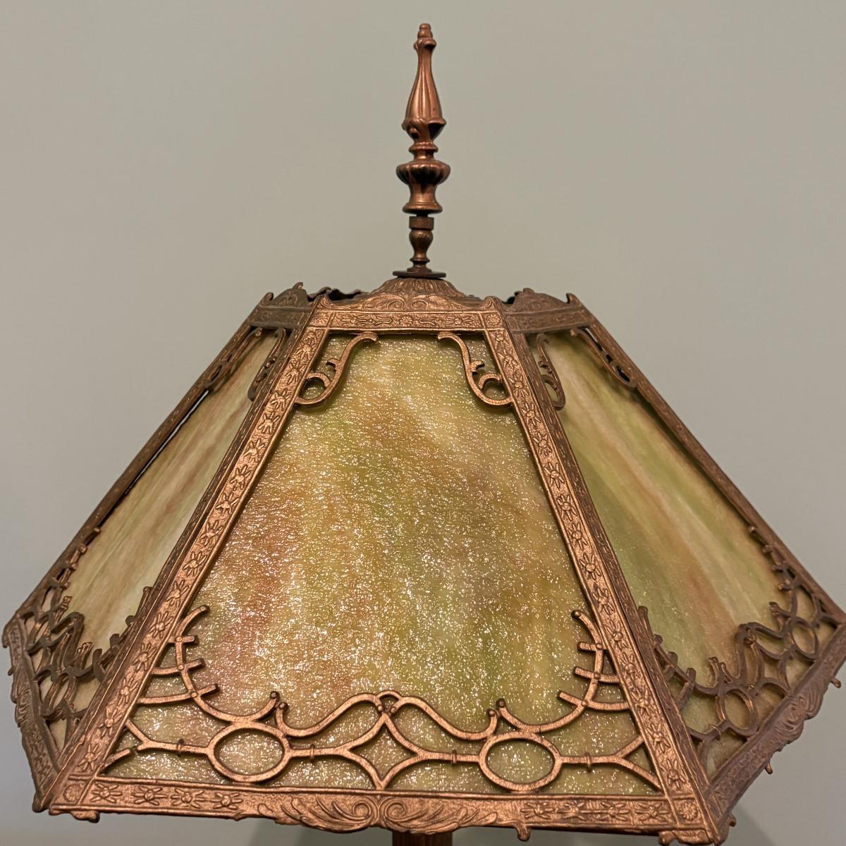 This beautiful Art Nouveau slag glass table lamp appears to have a brass metal base and stands at approximately 25"H. The approximate measurements of the base are 8"D and the shade is 17"D.