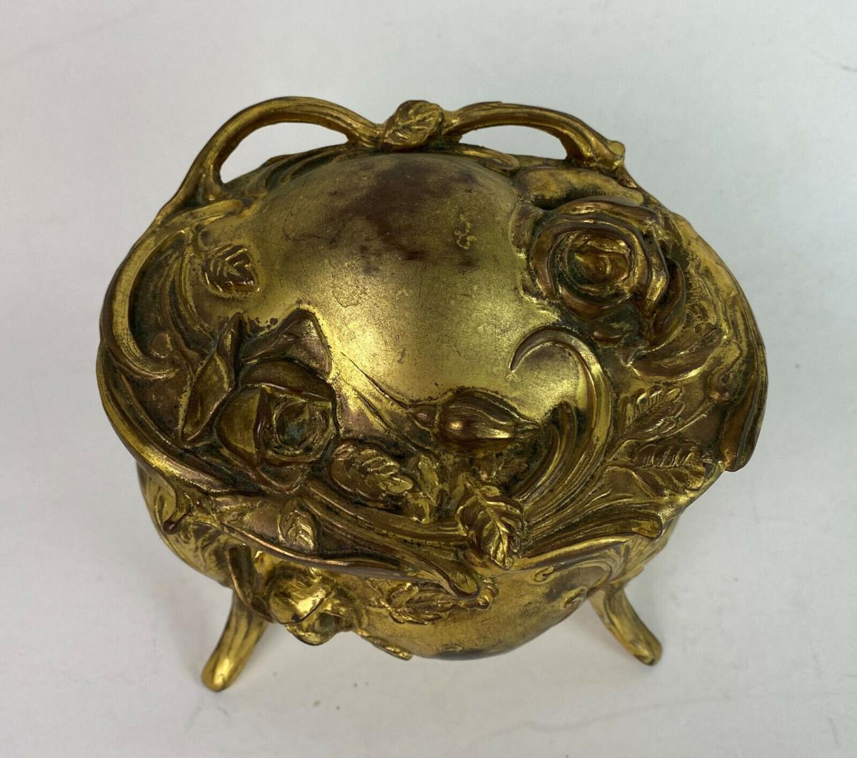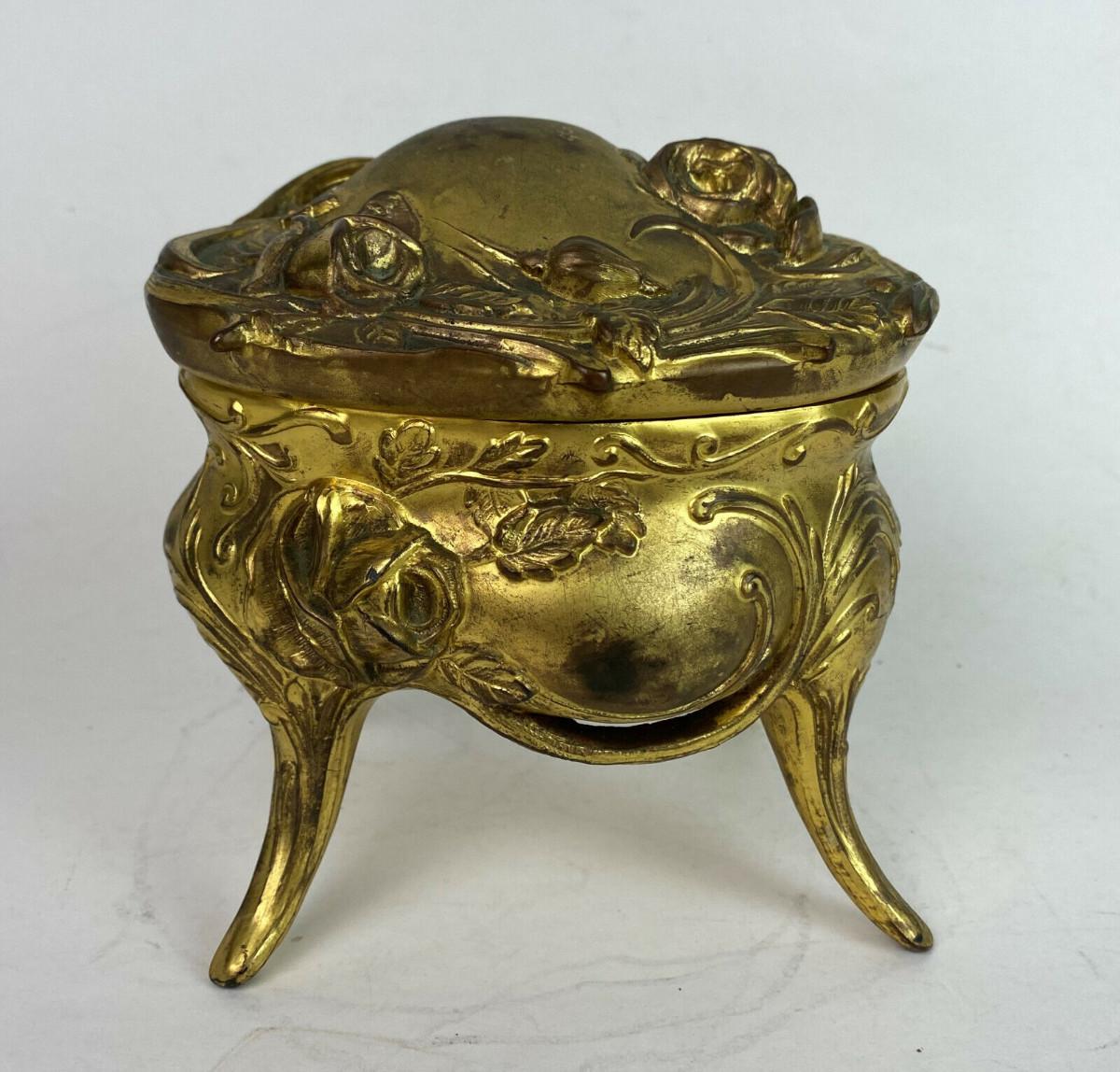 antique Art Nouveau satin tufted lined casket jewelry box made of spelter metal...Gilt finish with age and use patina. No breaks in the cast. Roses and floral embellishments...Approx. 5.25"h by 5.25"w...Footed dresser box circa 1900-1915...Unknown maker? Most similar to vanity boxes by G.W. Huntley of Chicago? but that is a guess. Could be made by B & I. Or A.C. Becken..or J.B. Art?...As shown...A charming boudoir accessory