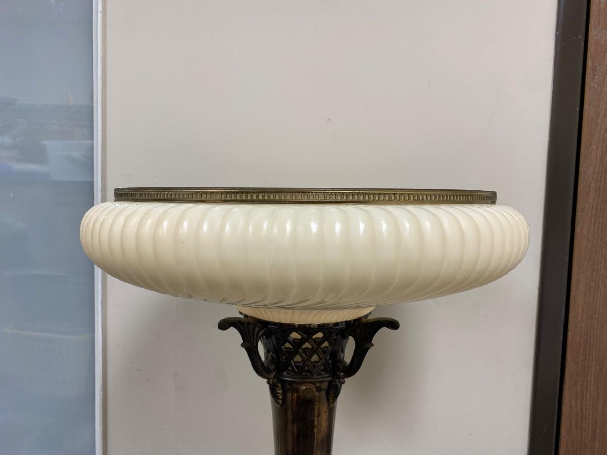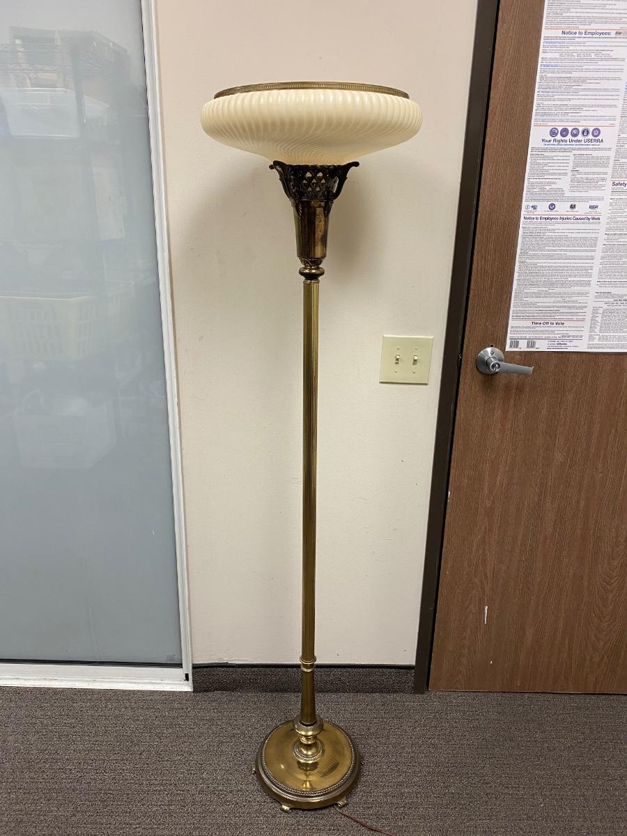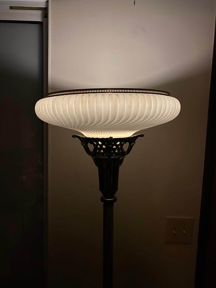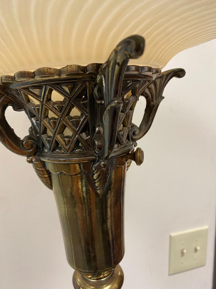 Beautiful art nouveau styled floor lamp. Newer lamp made to look older. Glass shade with open top. About 5.5' tall. It has a knob to turn on and off, believe it is a dimmer knob but not sure, the bulb used to test lamp was a newer LED and it did not seem to dim. In good condition.