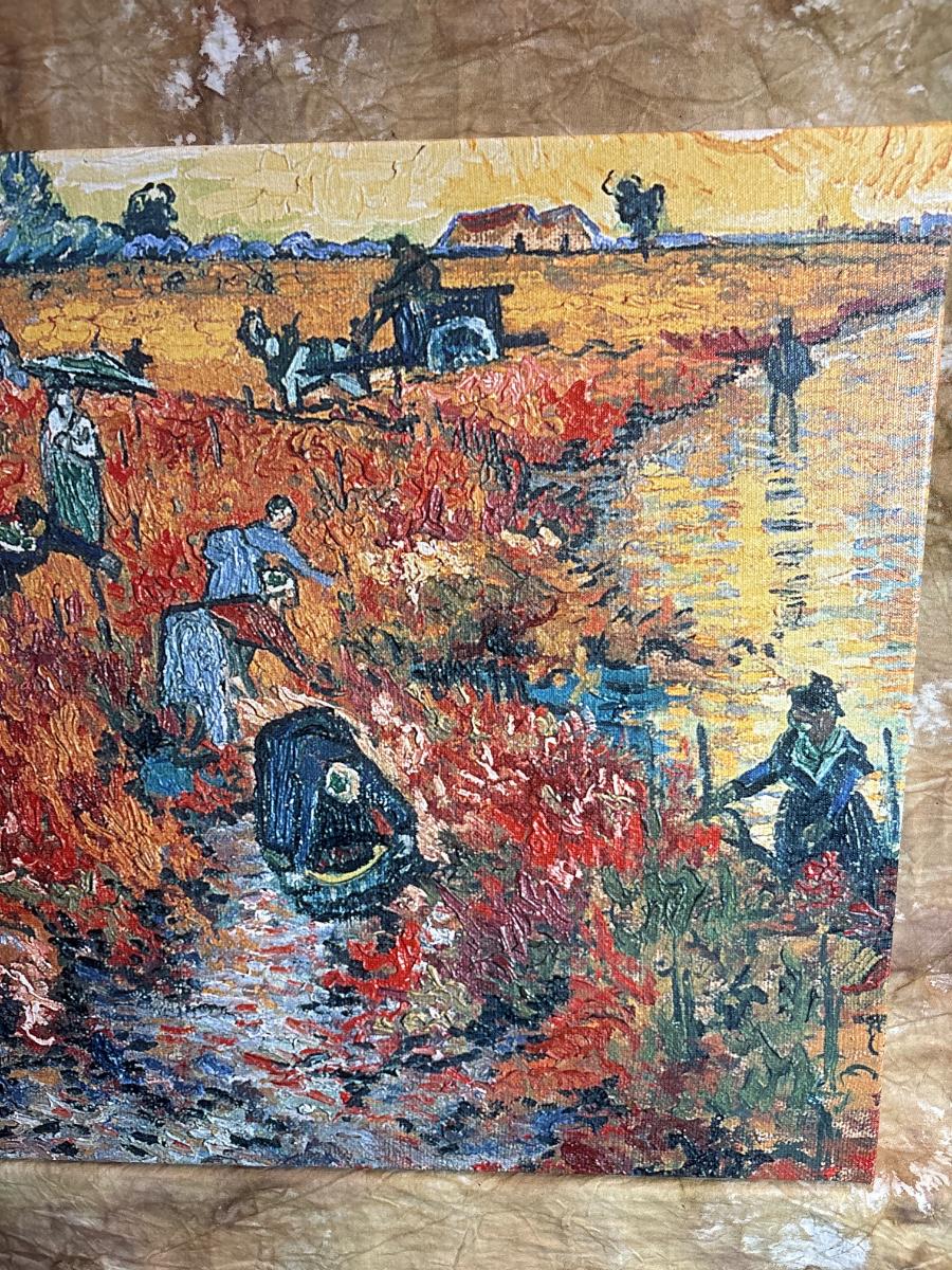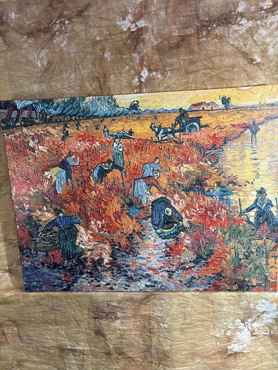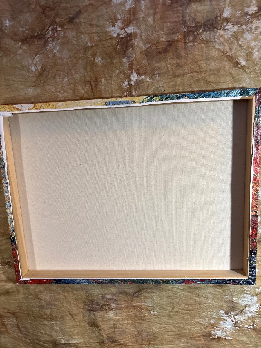 Colorful and primitive appearing art on canvas. Piece measure measures 24” x 18”.