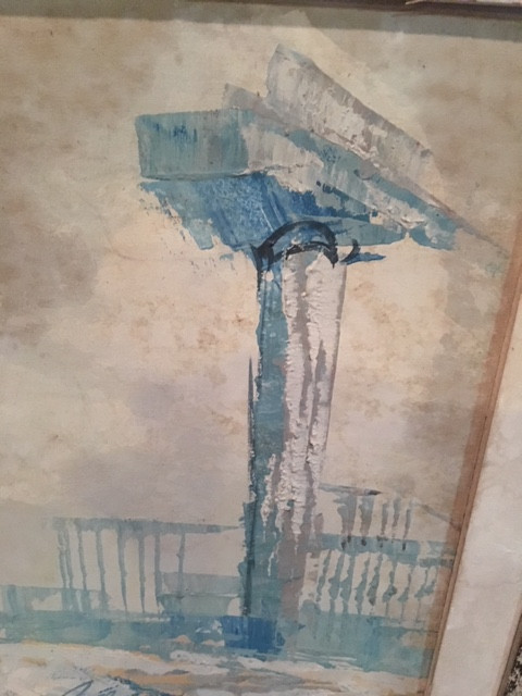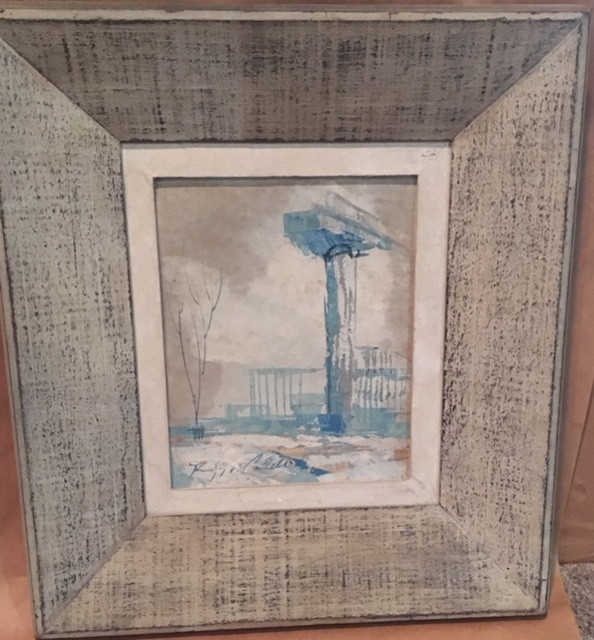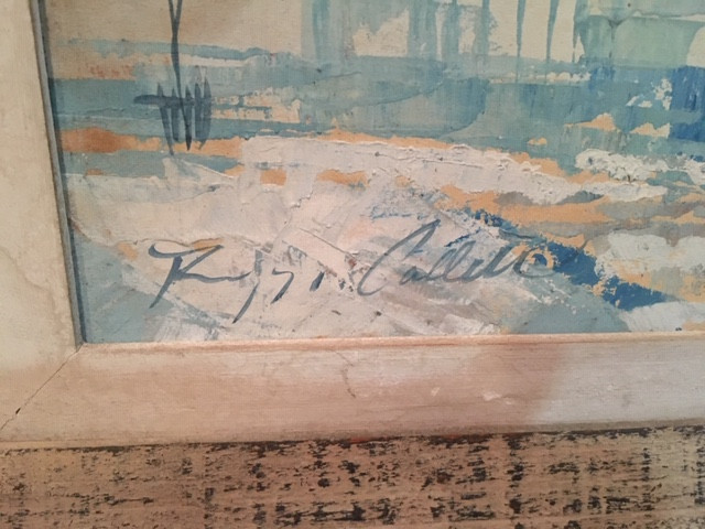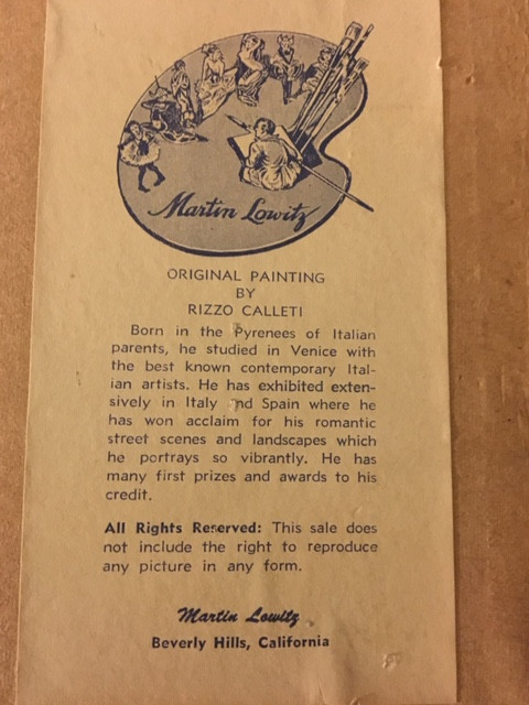 A beautiful original abstract landscape signed by artist Rizzo Calleti. A label on the back identifies that the painting was once sold at the Martin Lowitz Gallery in Beverly Hills, CA, and gives a brief biography of the artist, "Born in the Pyrenees of Italian parents, he studied in Venice with the best known contemporary Italian artists. He has exhibited extensively in Italy and Spain where he has won acclaim for his romantic street scenes and landscapes." Professionally matted and framed, measures 19" x 23". The matting is stained and has some paint chips.