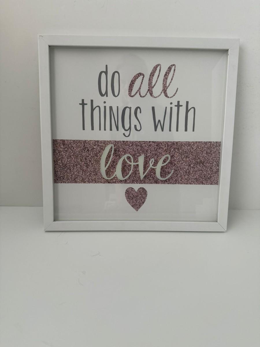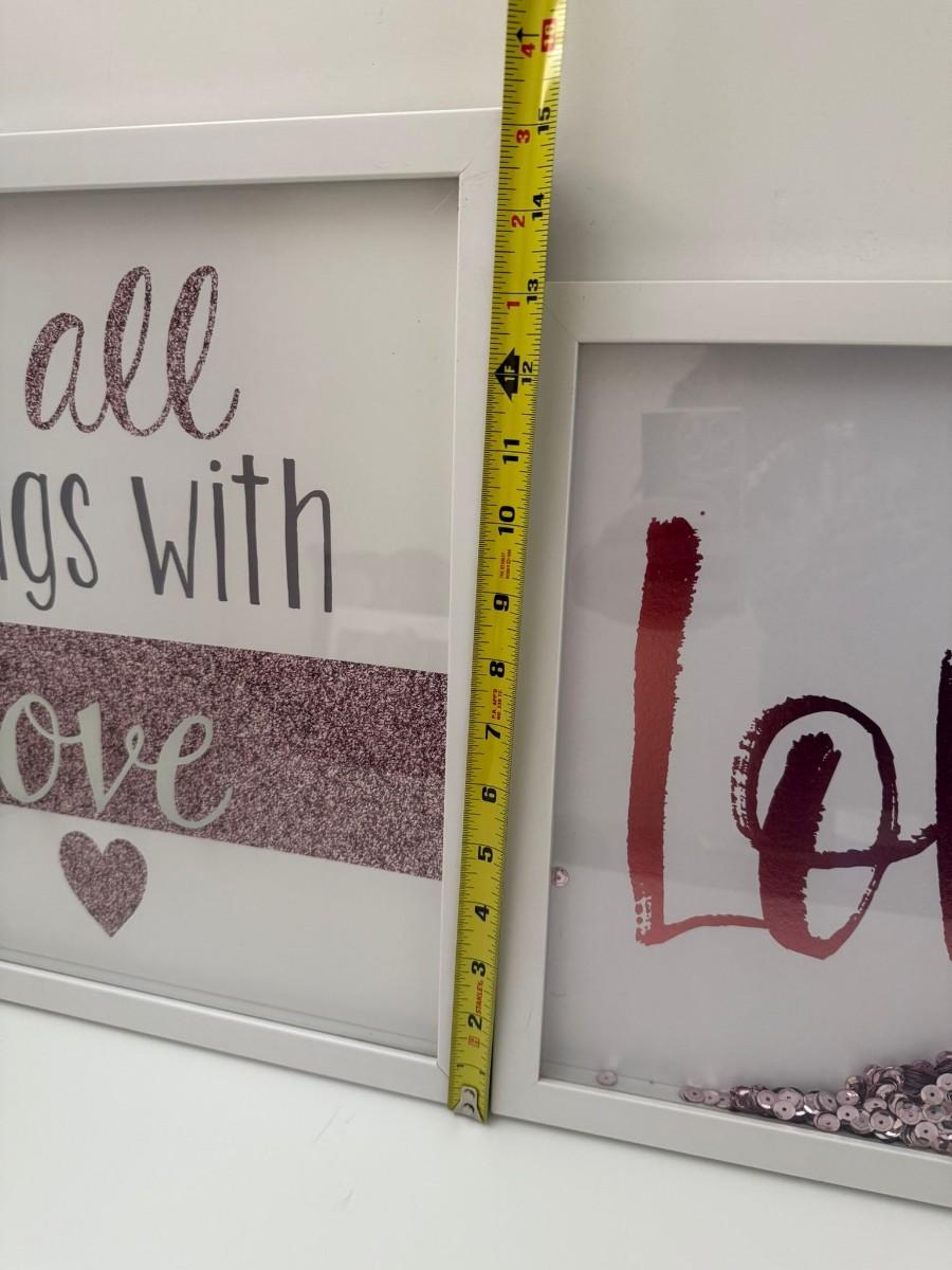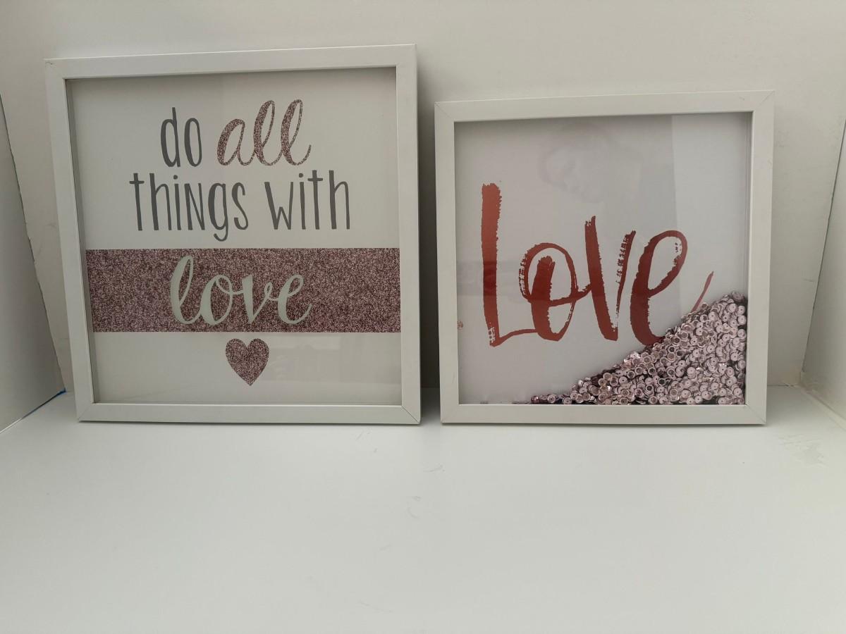 seet of 2 framed art pieces "Love". One has glitter inside the box