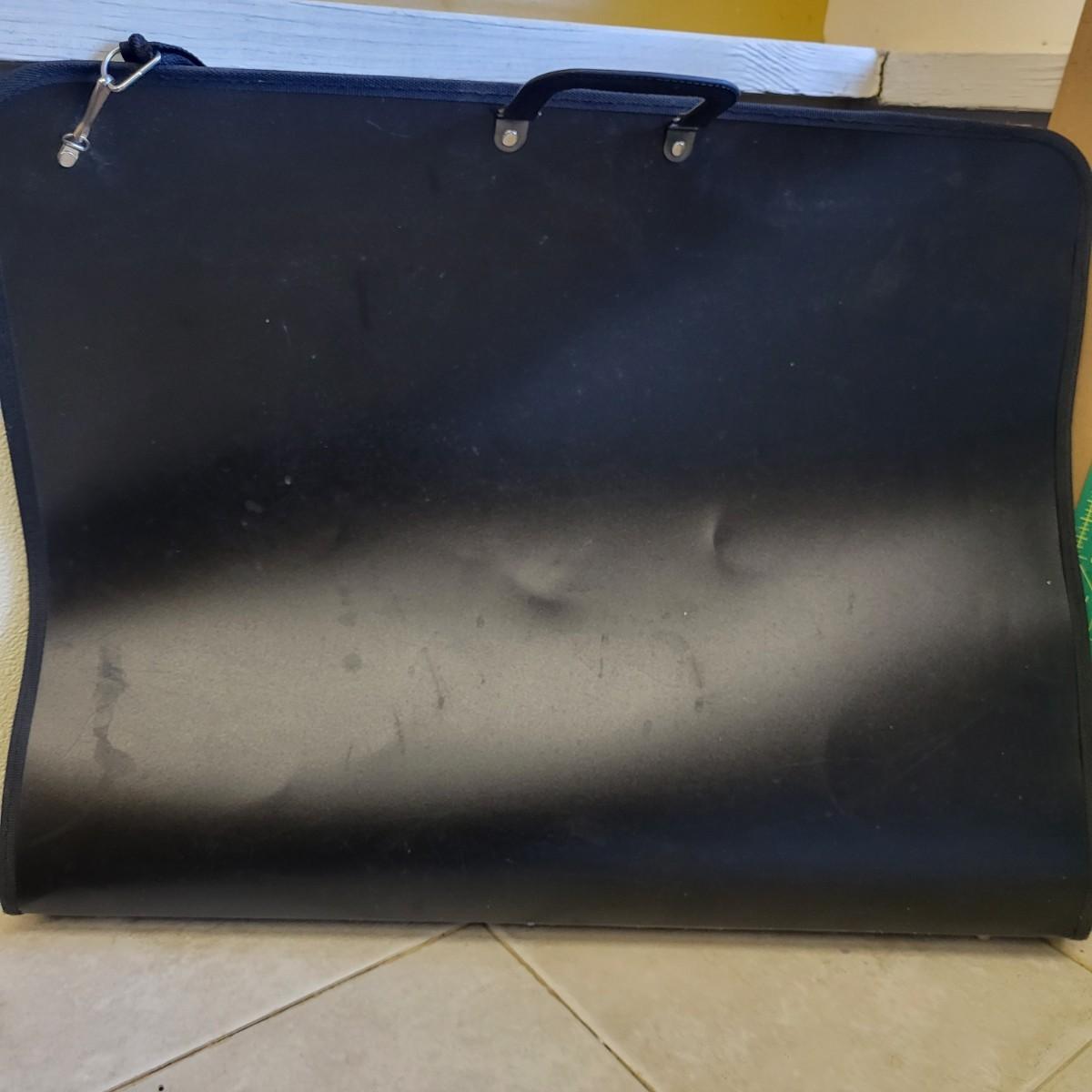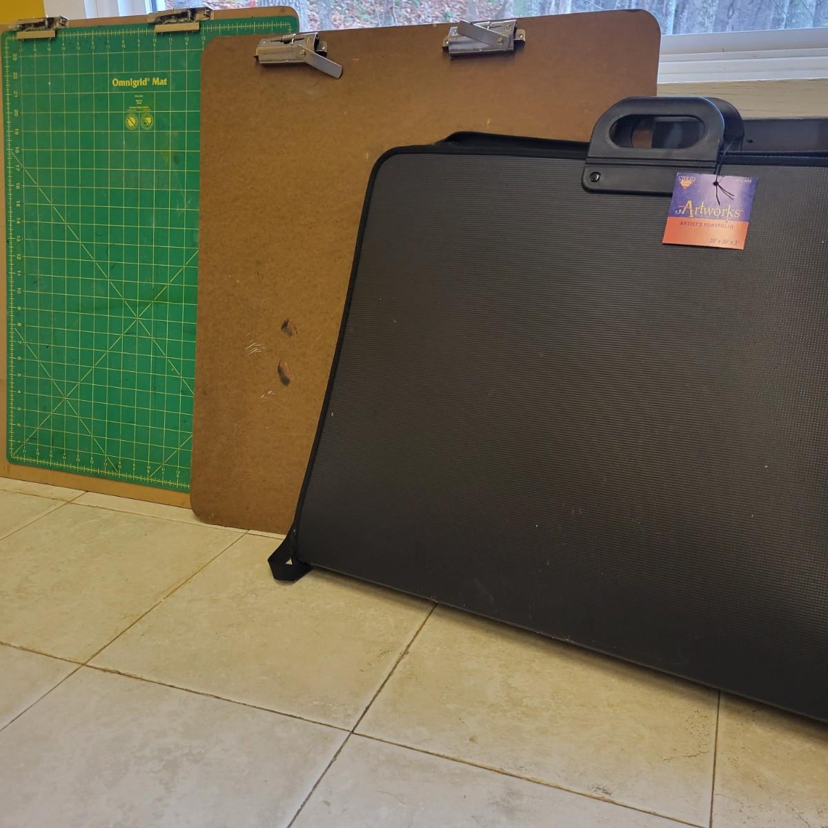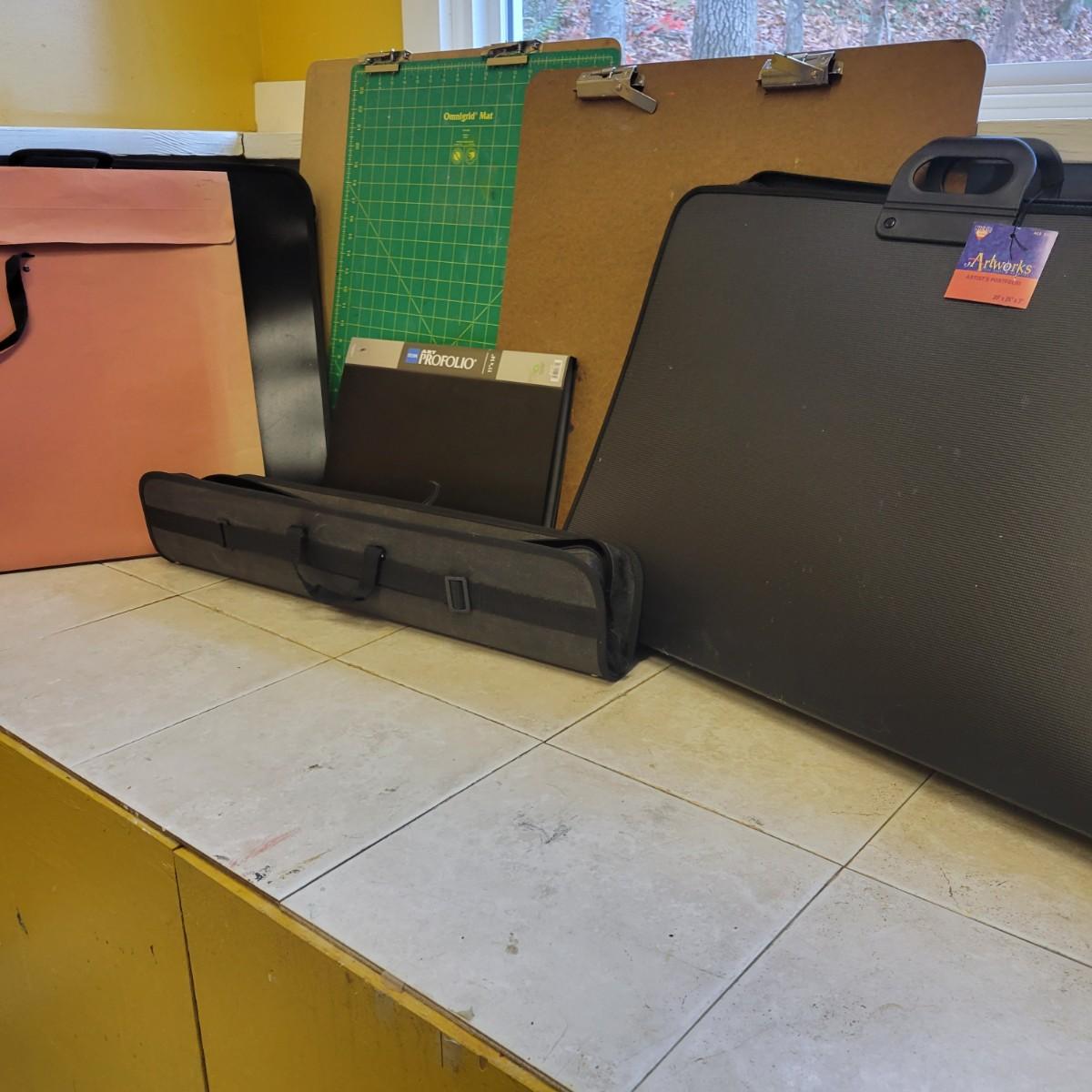 A collection of art portfolios and clipboards in good condition, though they do show some use. Includes three large portfolios and a smaller 11" x 14" with page inserts. Also included are two large sketch clipboards and a smaller bag that appears that it would carry a portable easel or art supplies. Largest portfolio measures approximately 20" x 26" x 3". Shipping available