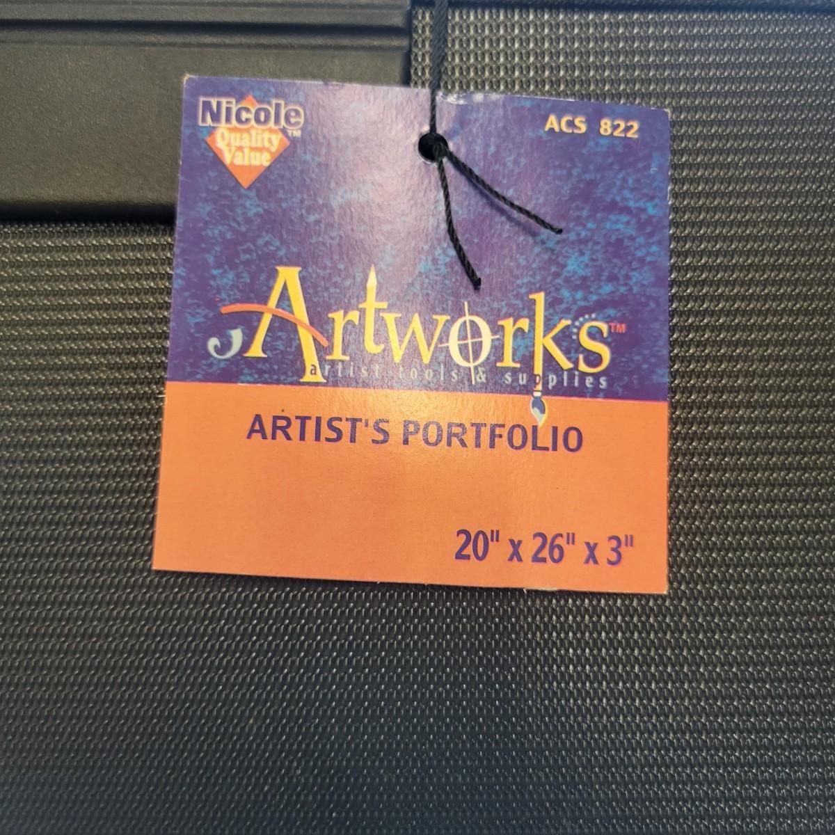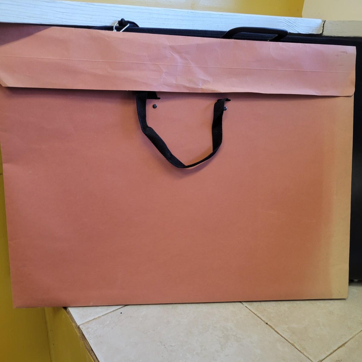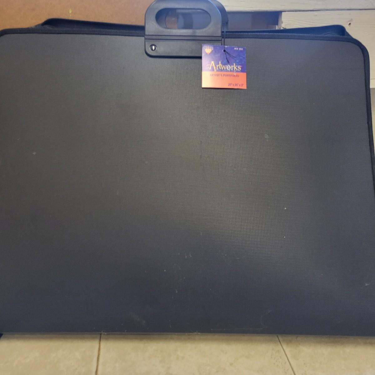 A collection of art portfolios and clipboards in good condition, though they do show some use. Includes three large portfolios and a smaller 11" x 14" with page inserts. Also included are two large sketch clipboards and a smaller bag that appears that it would carry a portable easel or art supplies. Largest portfolio measures approximately 20" x 26" x 3". Shipping available