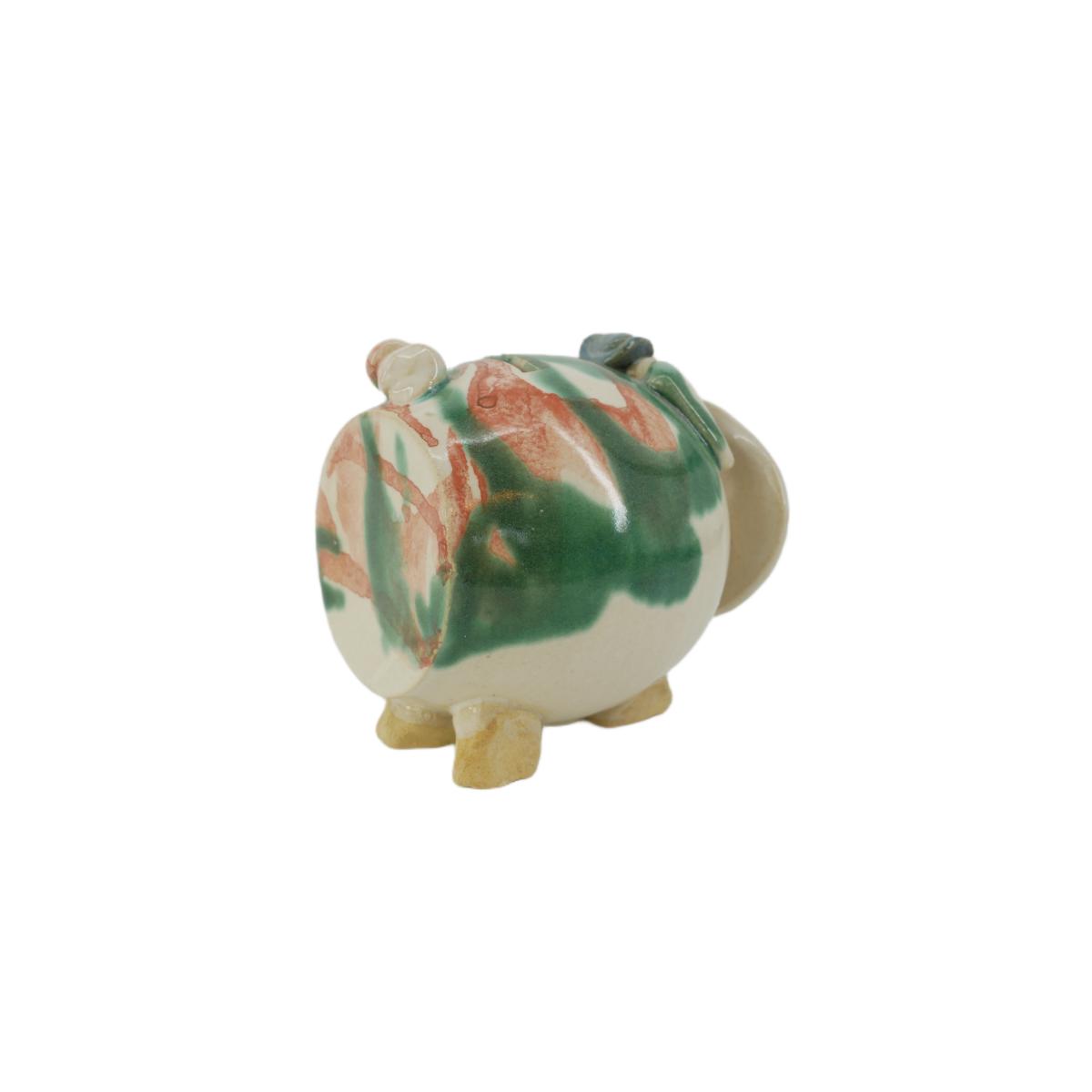Handmade studio art pottery red and green glazed goofy pig with cowboy hat bank. Such a fun, whimscial piece! Excellent condition. Measures L 5.5" x H 5" x W 5". Weighs 1 lb 9 oz. (D29)