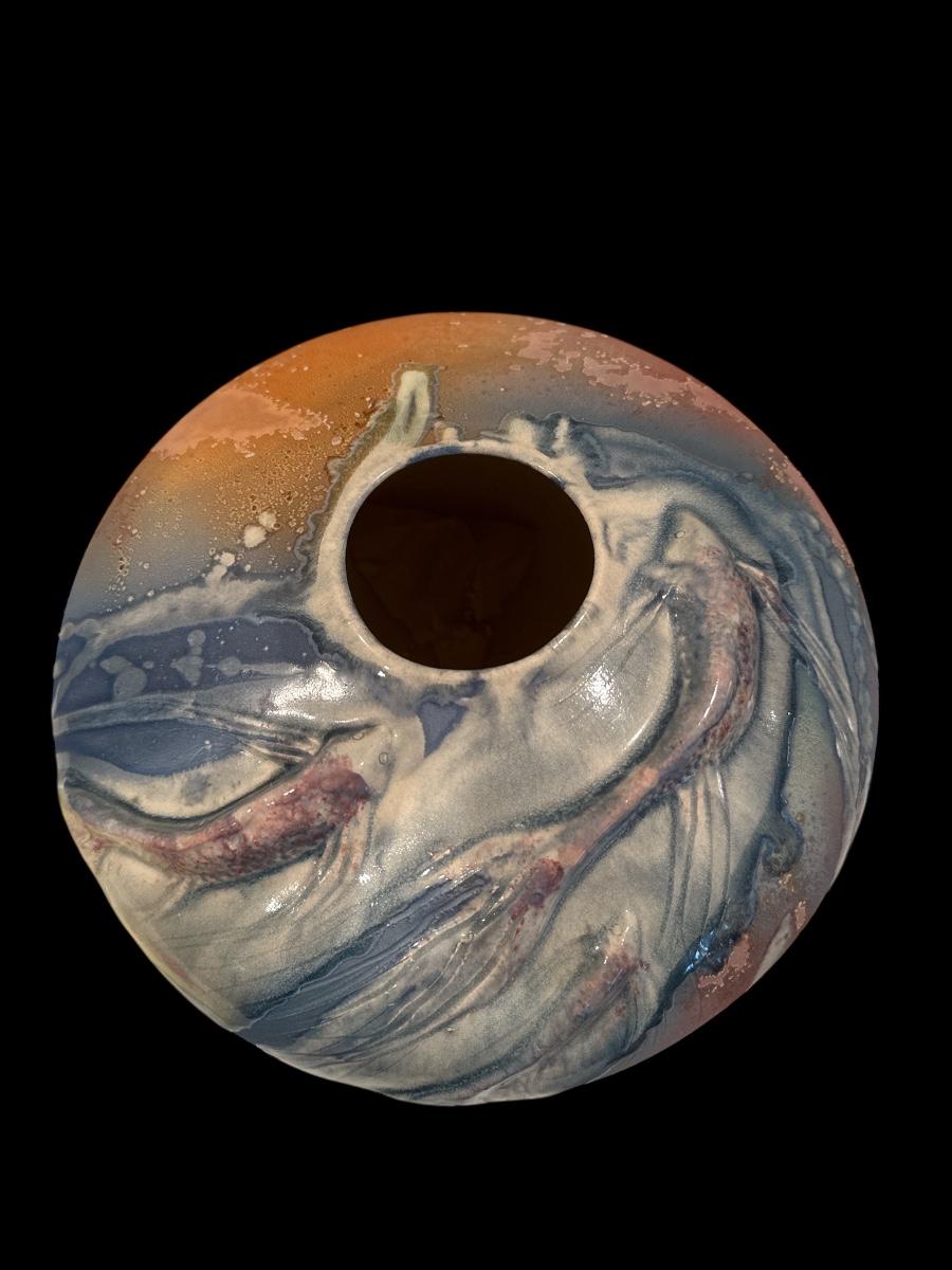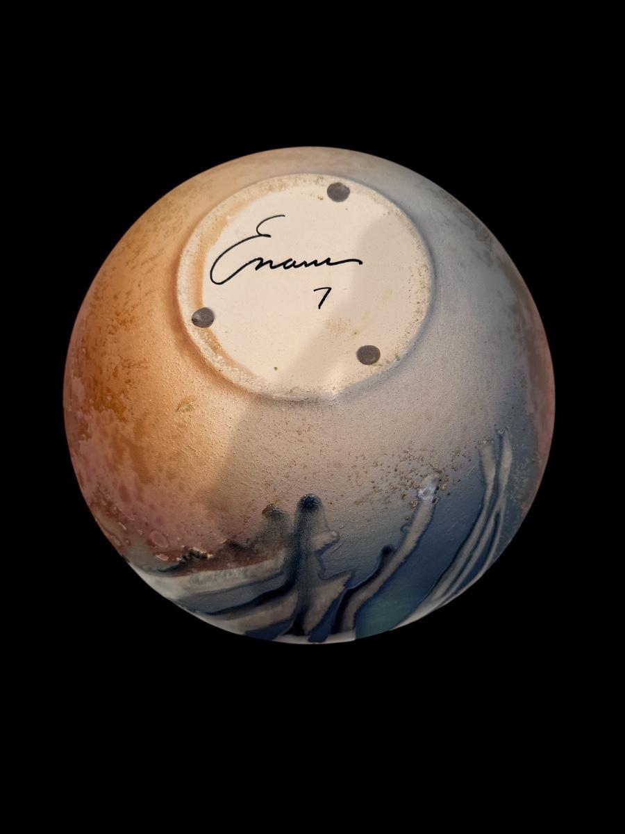 Beautiful handmade pottery vase with a rounded shape and small top opening. Glazed in flowing shades of blue, cream, red, and orange with a glossy finish. Signed “Emann 7” on the bottom. A colorful and eye-catching piece for display.