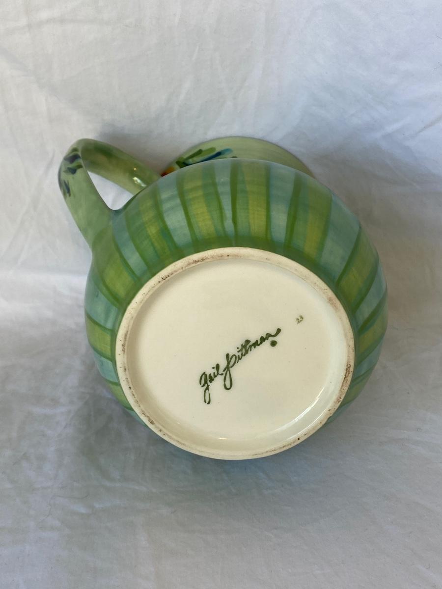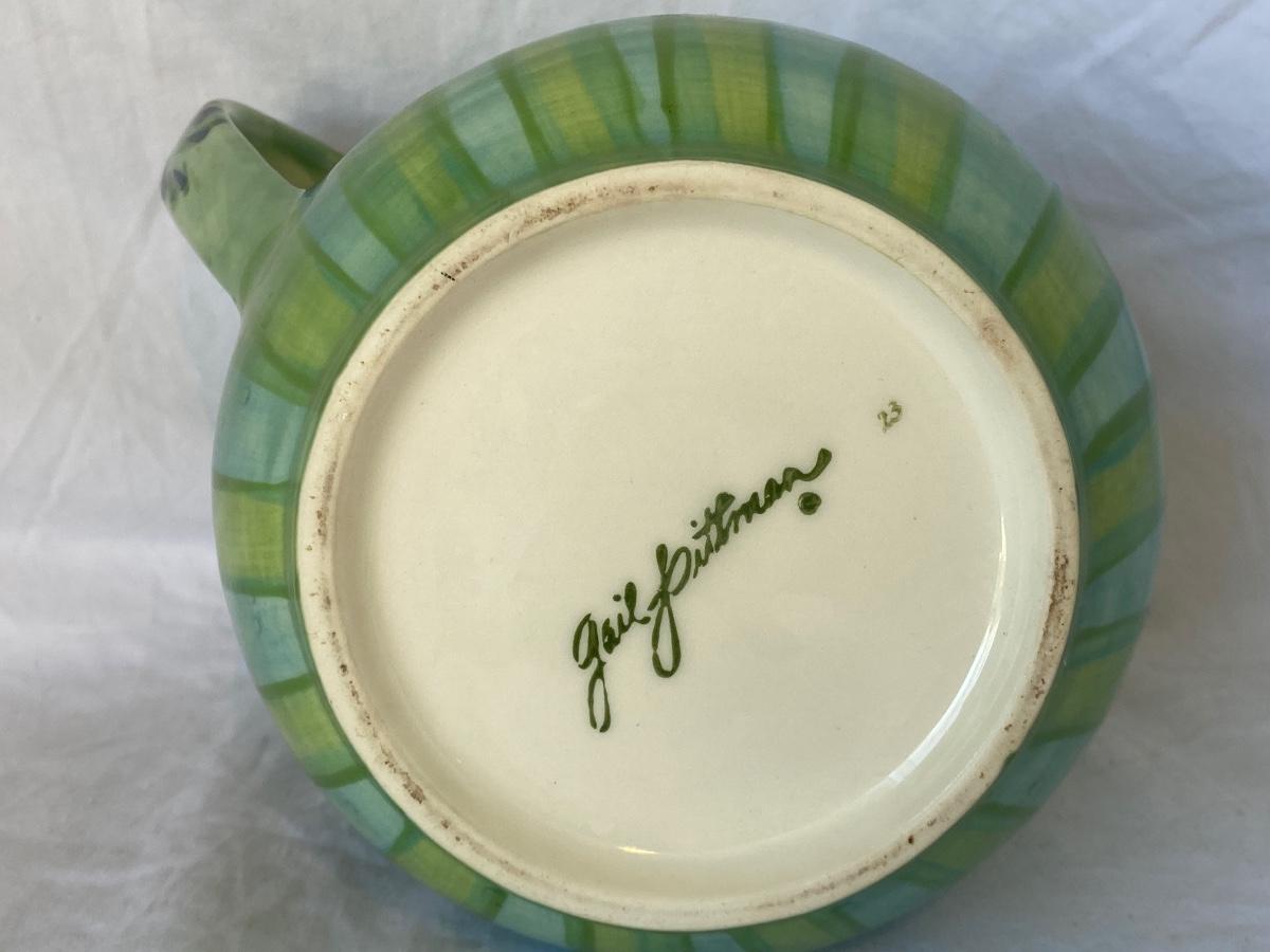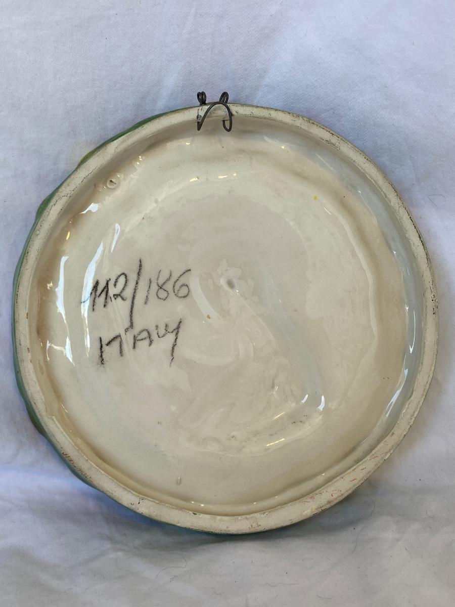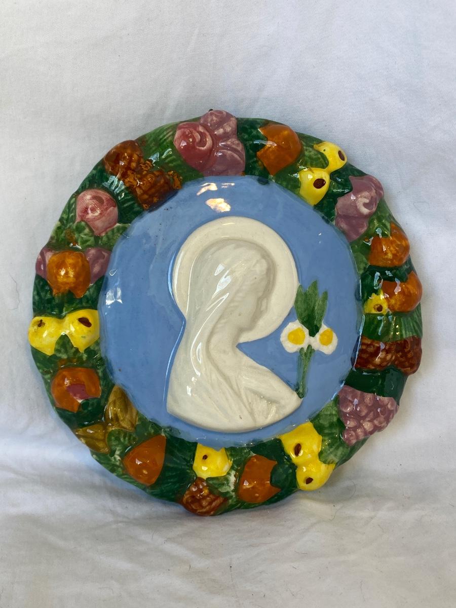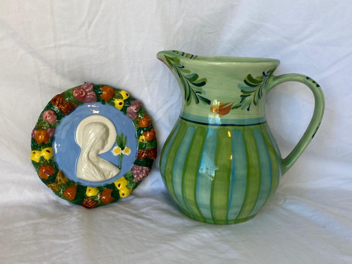 Art pottery lot. Vase by Gail Pittman. Religious wall art made in Italy 112/186. Preowned and sold as is