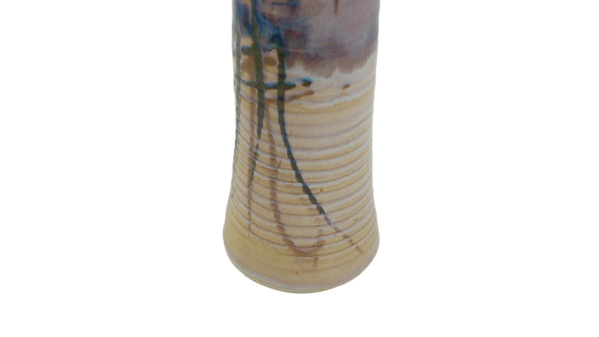 Asian influenced art pottery vase, signed by artist on bottom. Glazed with an array of beautiful colors. No chips or visible signs of damage. Measures 9.75" tall and 4" wide. Weighs 1 lb 12 oz. (D3)